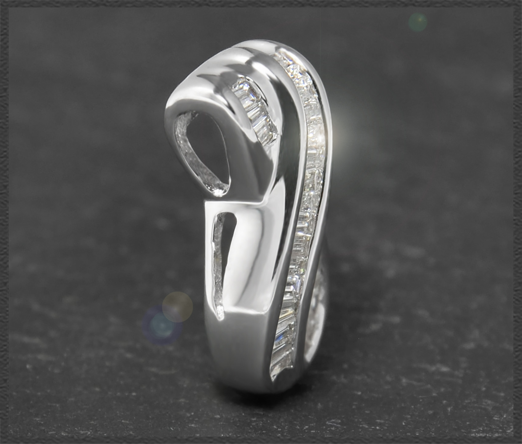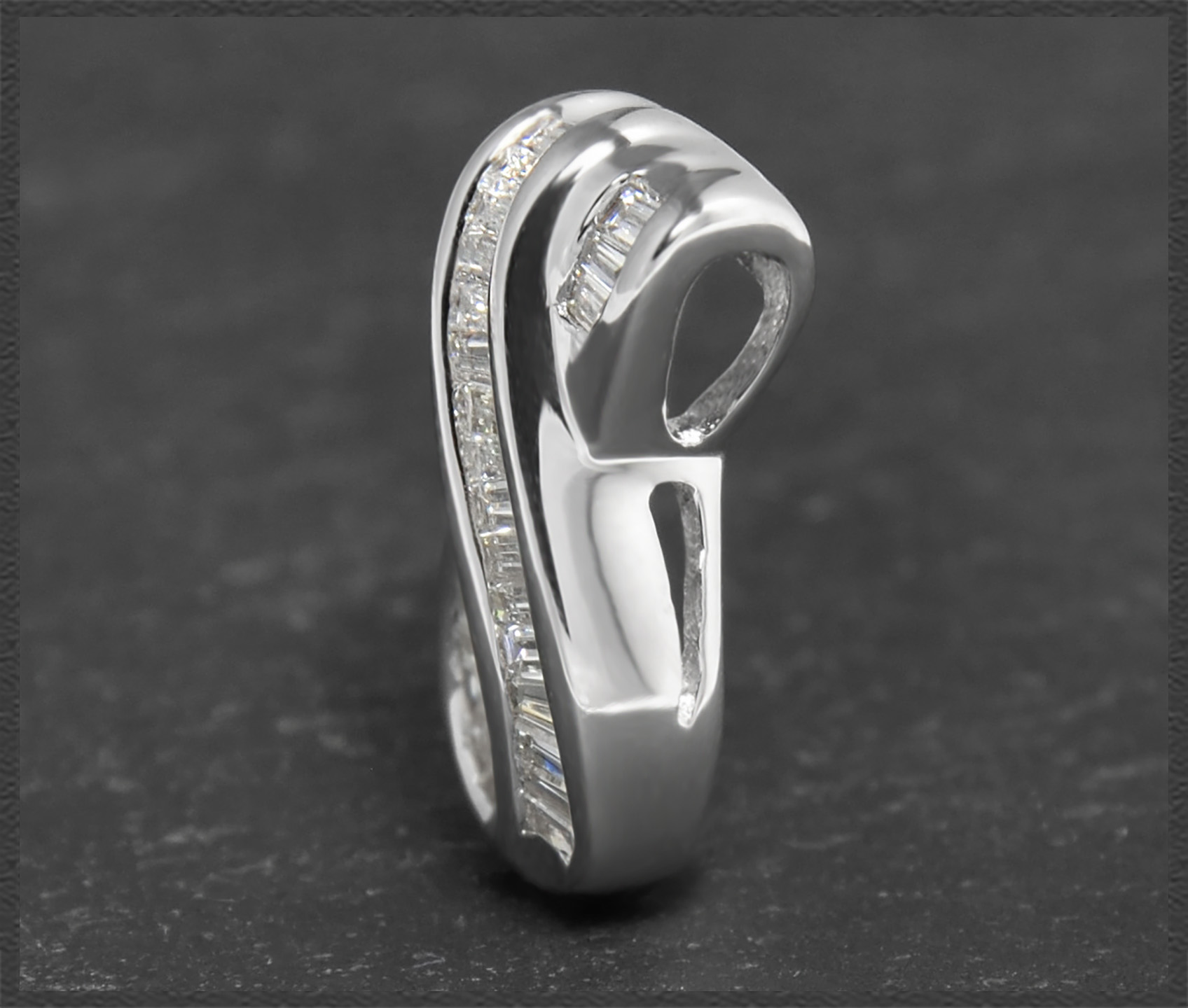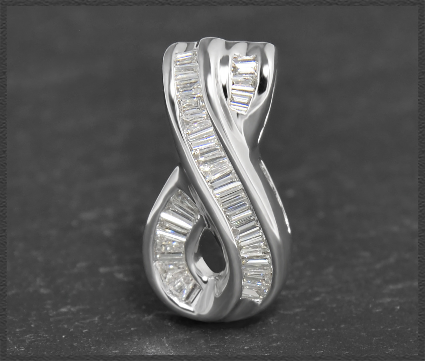 0,47ct Diamanten im Baguette-Schliff & Trapez-Schliff sind in dem Anhänger eingefasst. Die Diamanten haben alle eine hervorragende Qualität (Top Wesselton F & VVS-VS) & sie funkeln wundervoll im Licht.