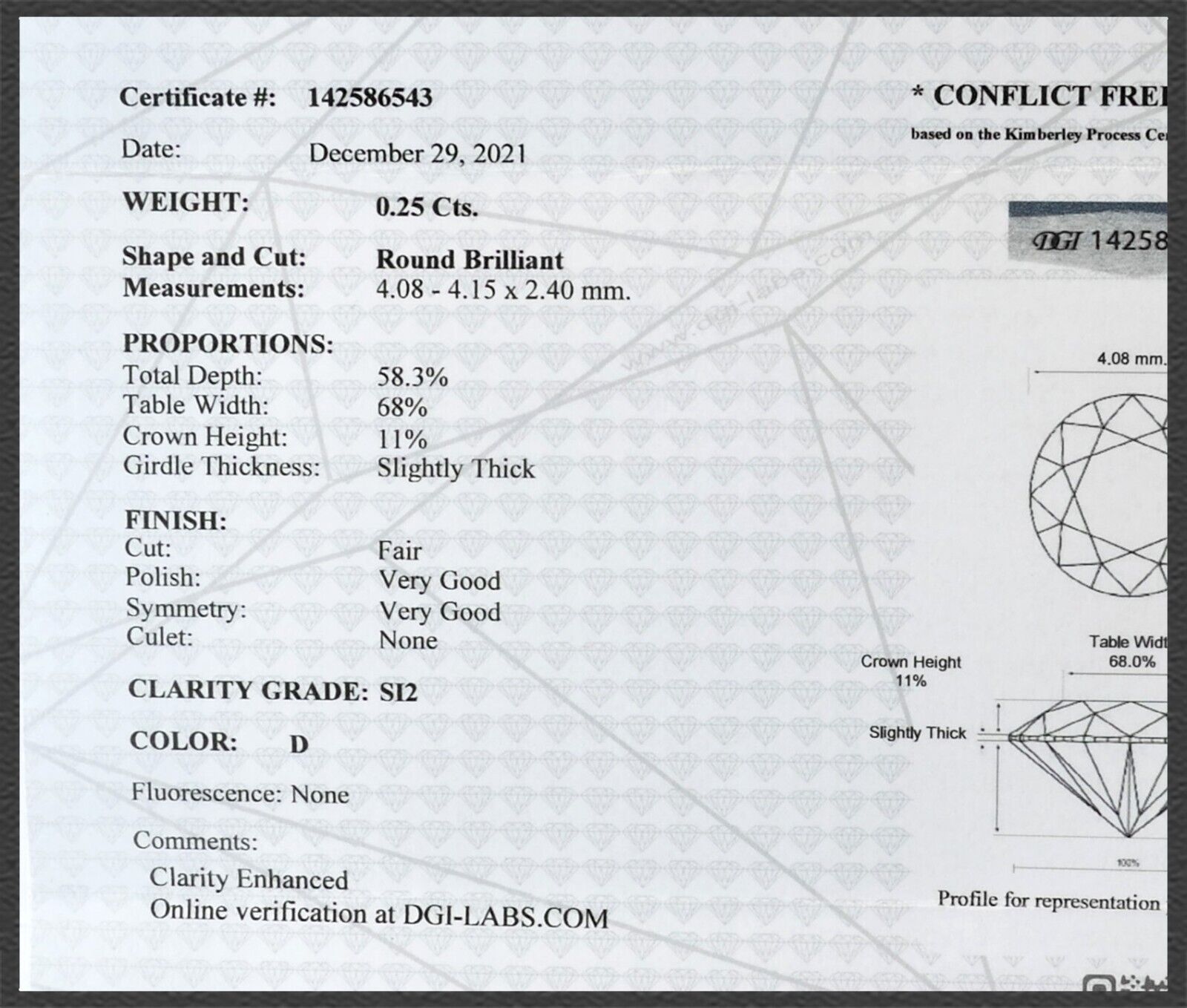 Das originale DGI Zertifikat erhalten Sie dazu. Außerdem hat der Diamant eine laser-markierte Rundiste (mit der Zertifikats Nummer). Absolute Sicherheit für Sie als Käufer!
