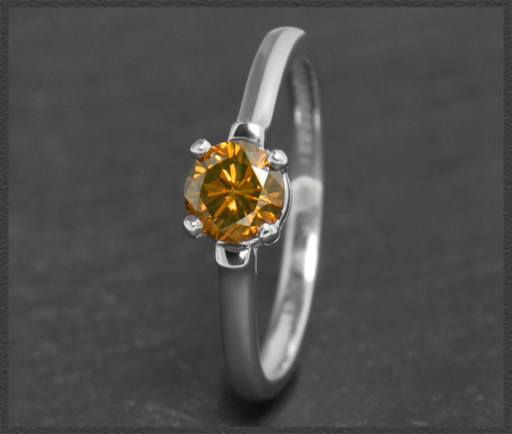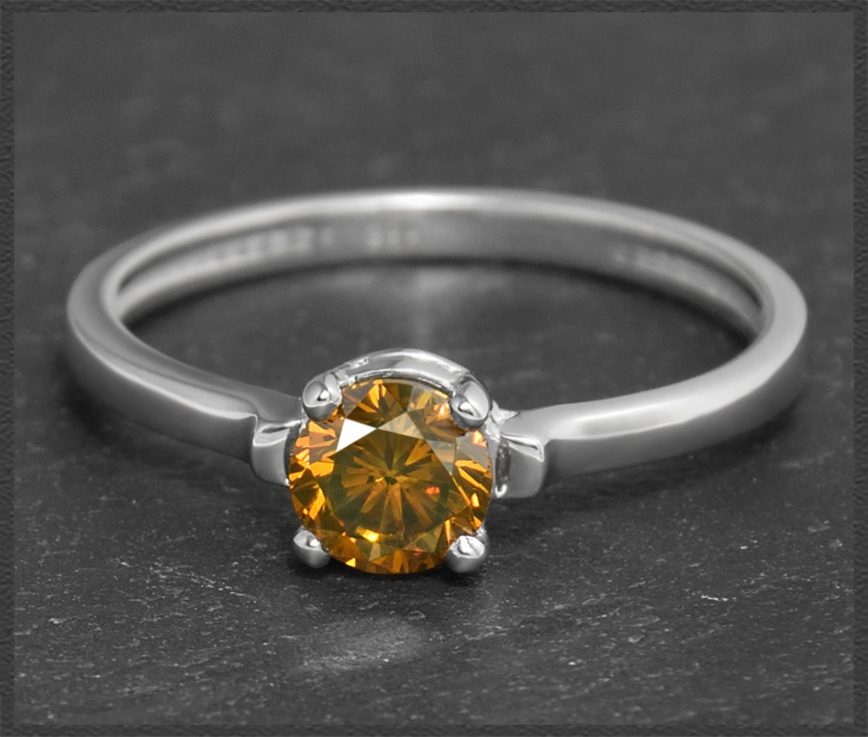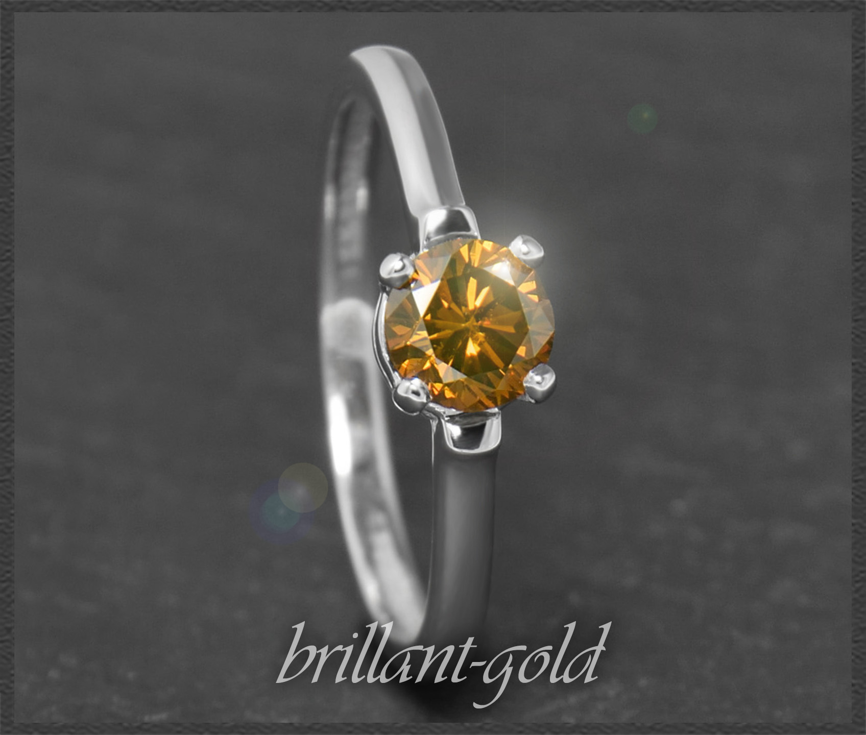 Als Solitär eingefasst ist ein 5,35mm großer, orange-farbener Brillant mit 0,64ct, in sehr hoher Reinheit (VS1) & sehr gutem Brillantschliff! Der Brillant funkelt wunderschön im Licht.