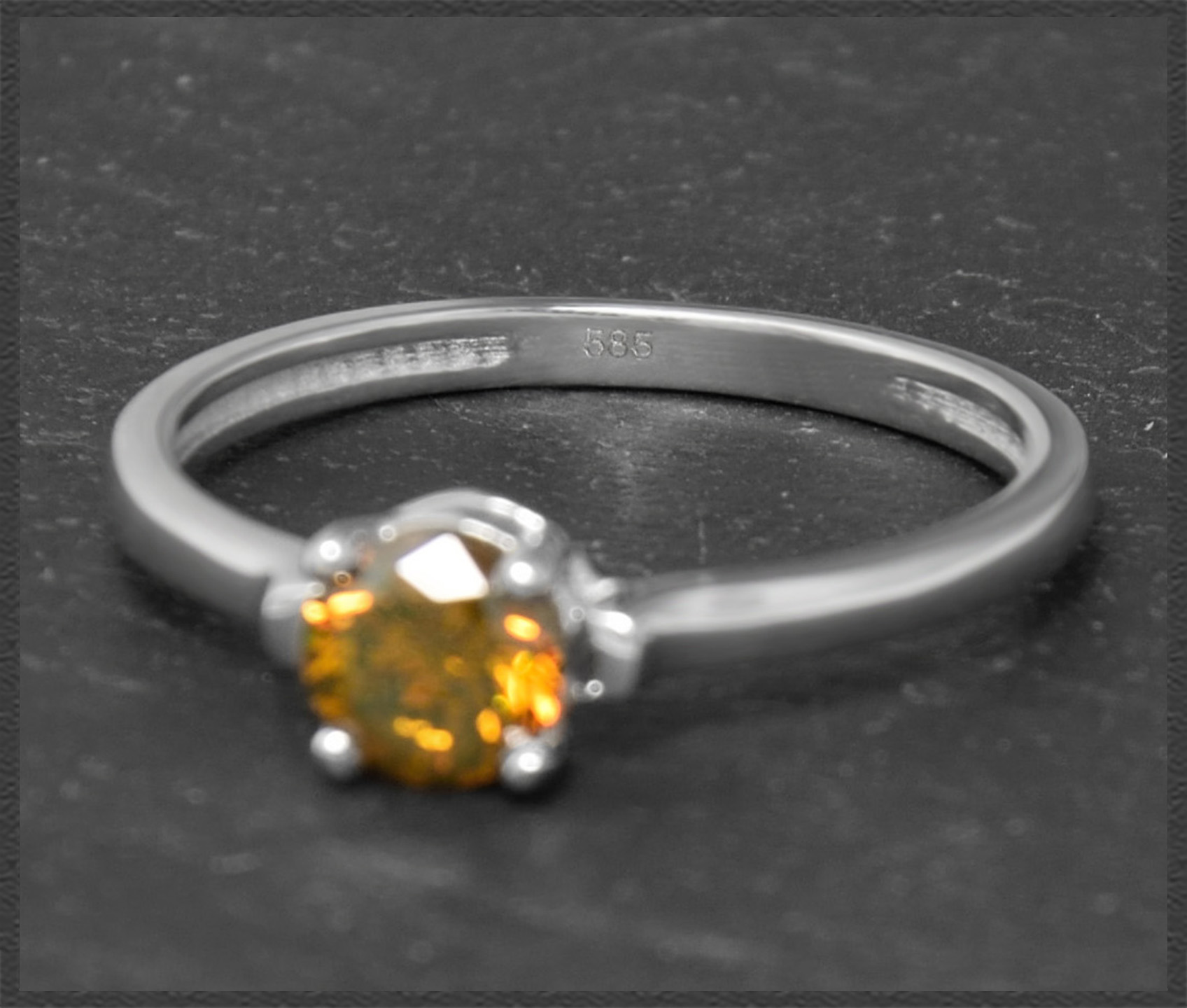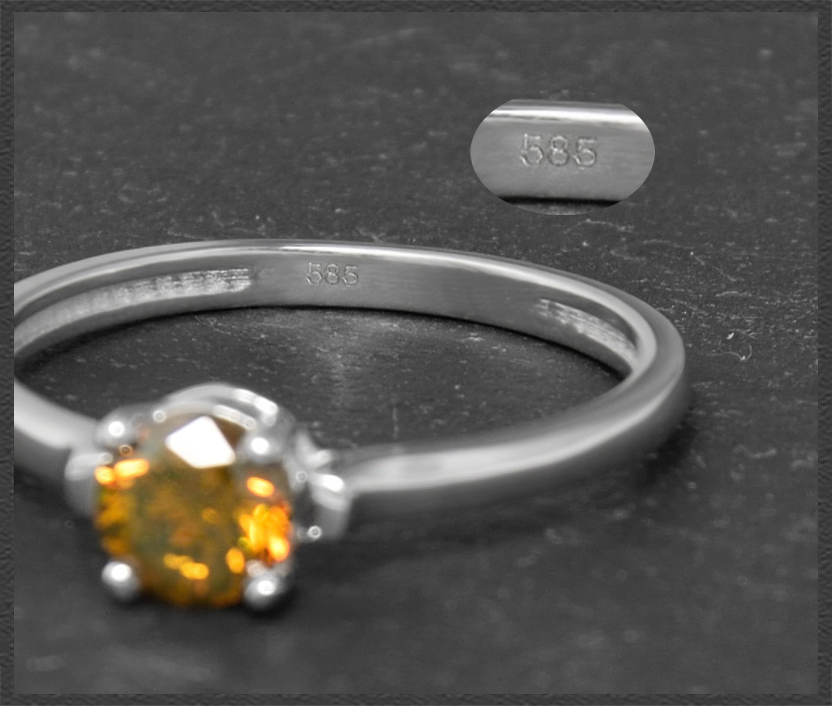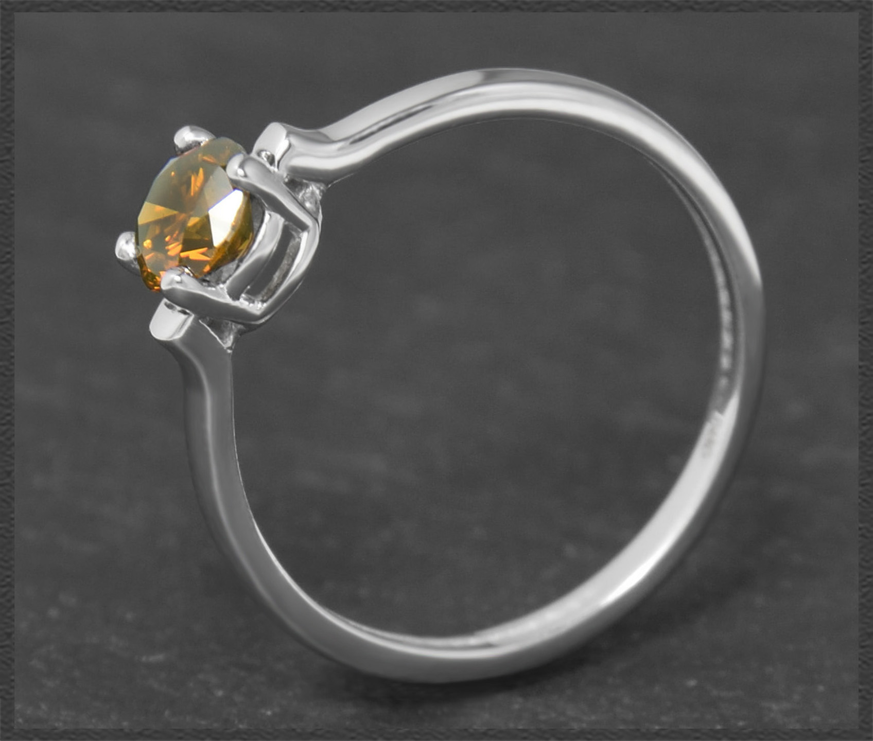 Als Solitär eingefasst ist ein 5,35mm großer, orange-farbener Brillant mit 0,64ct, in sehr hoher Reinheit (VS1) & sehr gutem Brillantschliff! Der Brillant funkelt wunderschön im Licht.