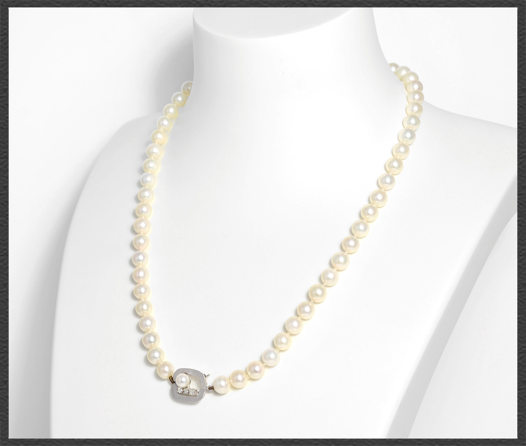 Elegantes Perlen Collier mit 7,5mm weißen Akoya-Perlen, Diamant besetzte Schließe aus 585 Weißgold.