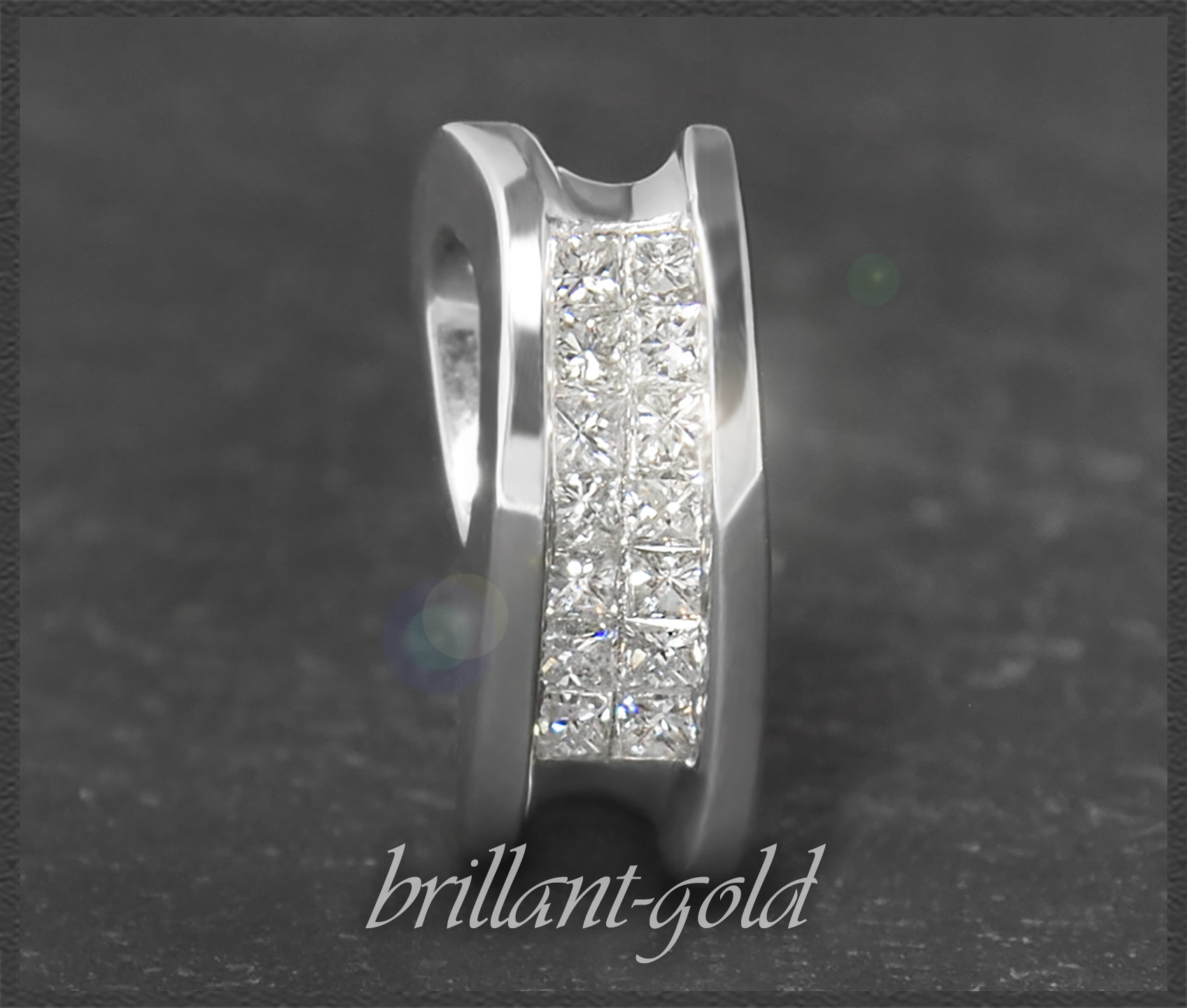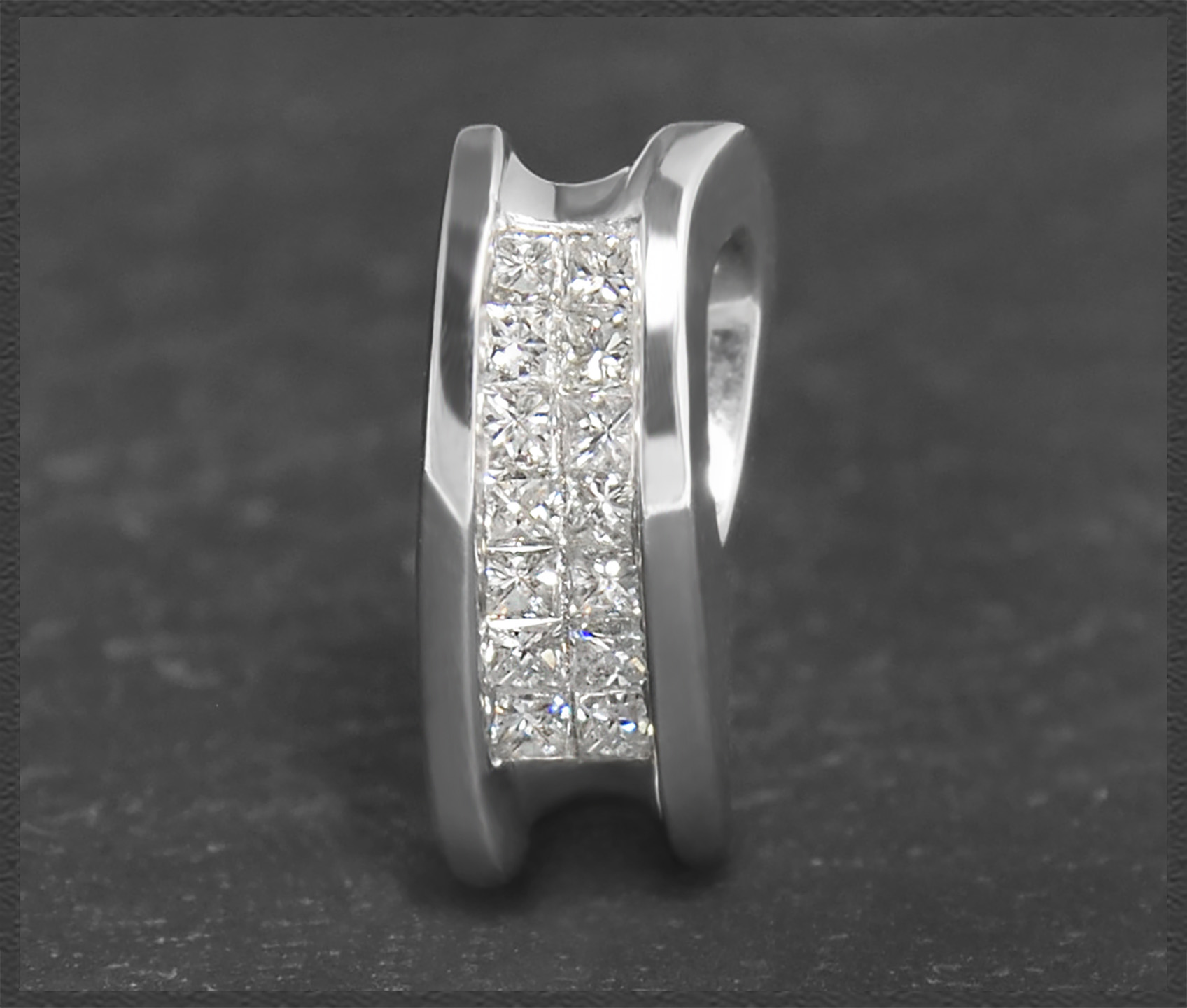 0,30ct Diamanten im Prinzess-Schliff sind nebeneinander in zwei Reihen in dem Anhänger eingefasst. Die Diamanten haben alle eine hervorragende Qualität & sie funkeln zauberhaft im Licht.