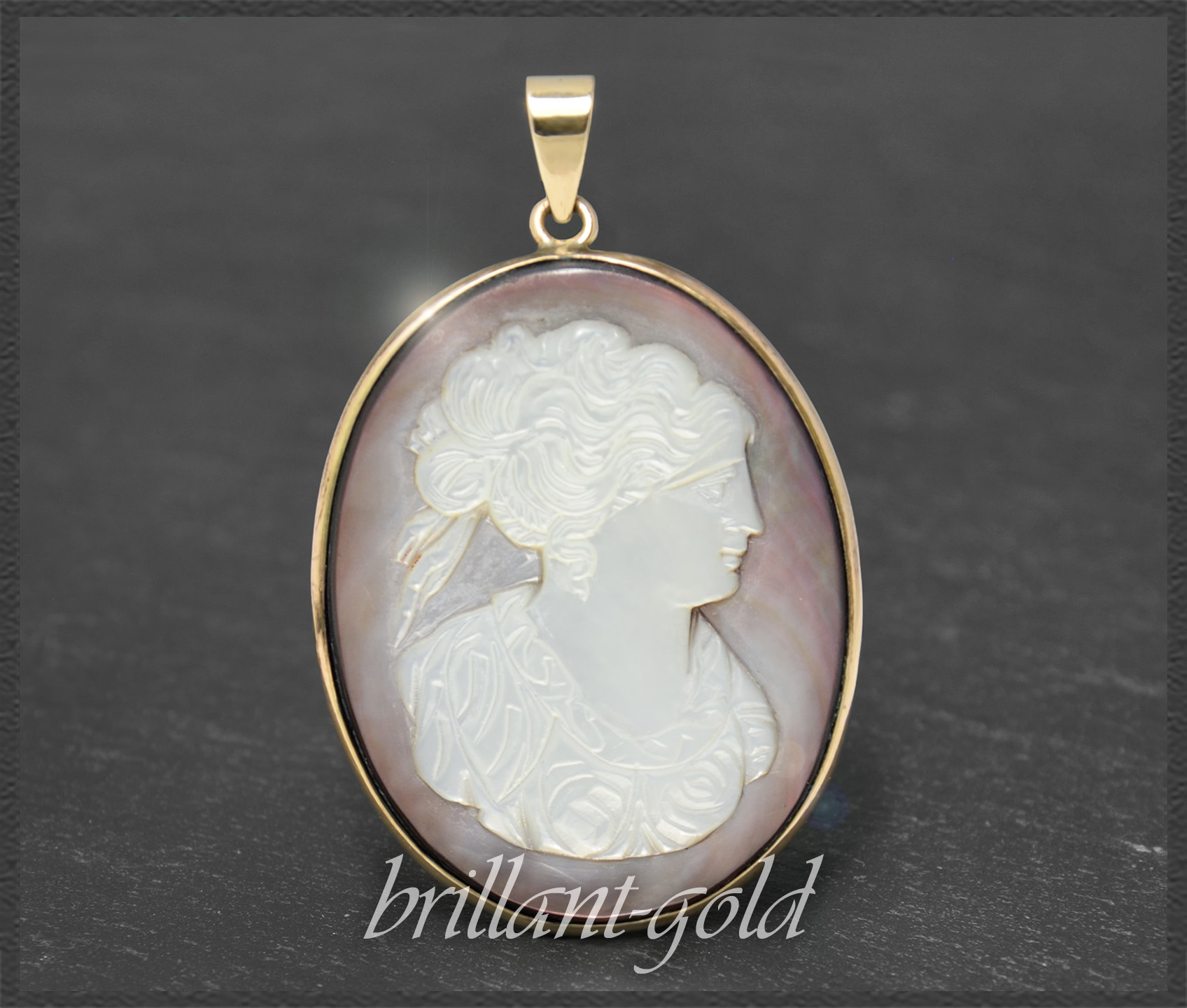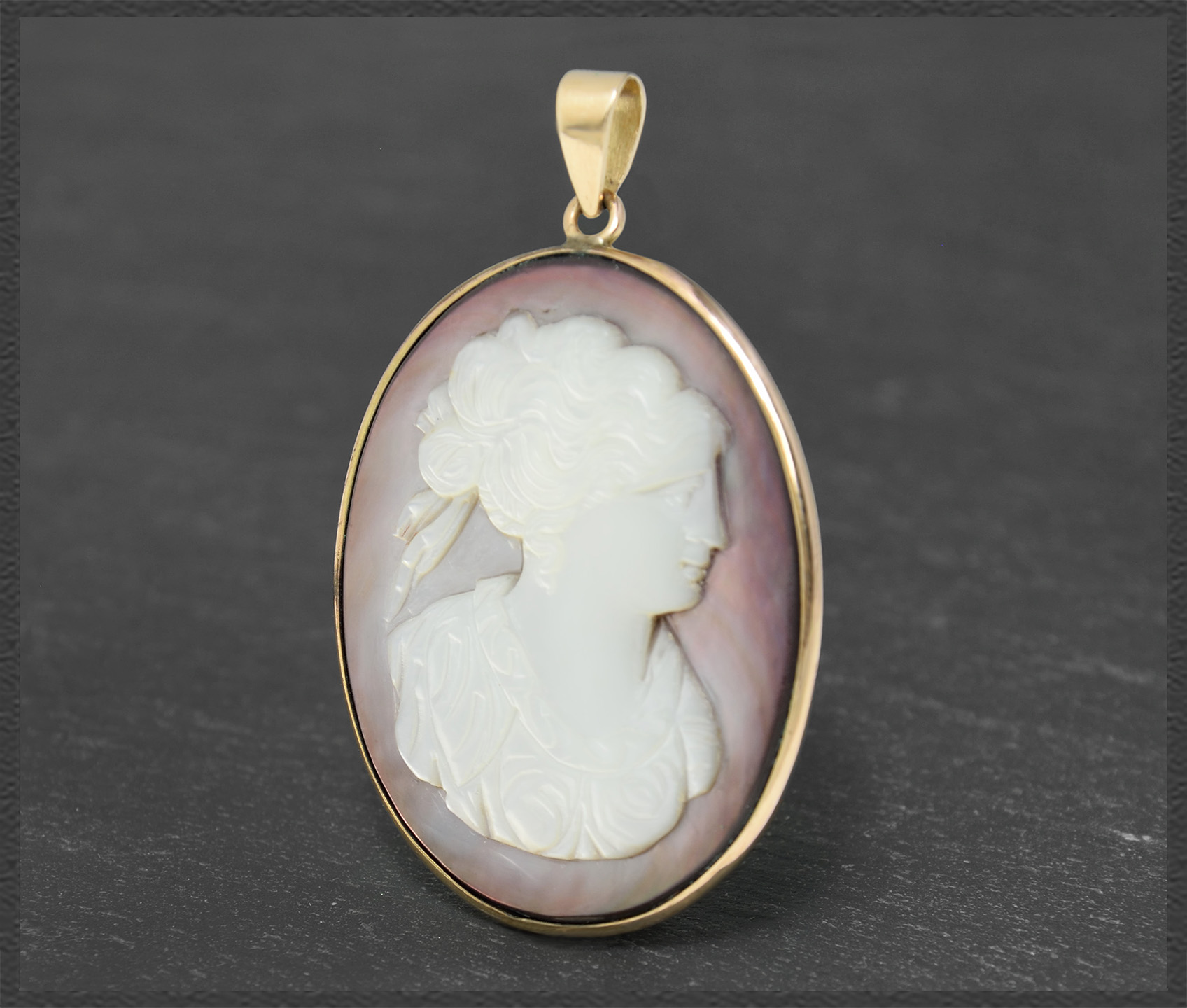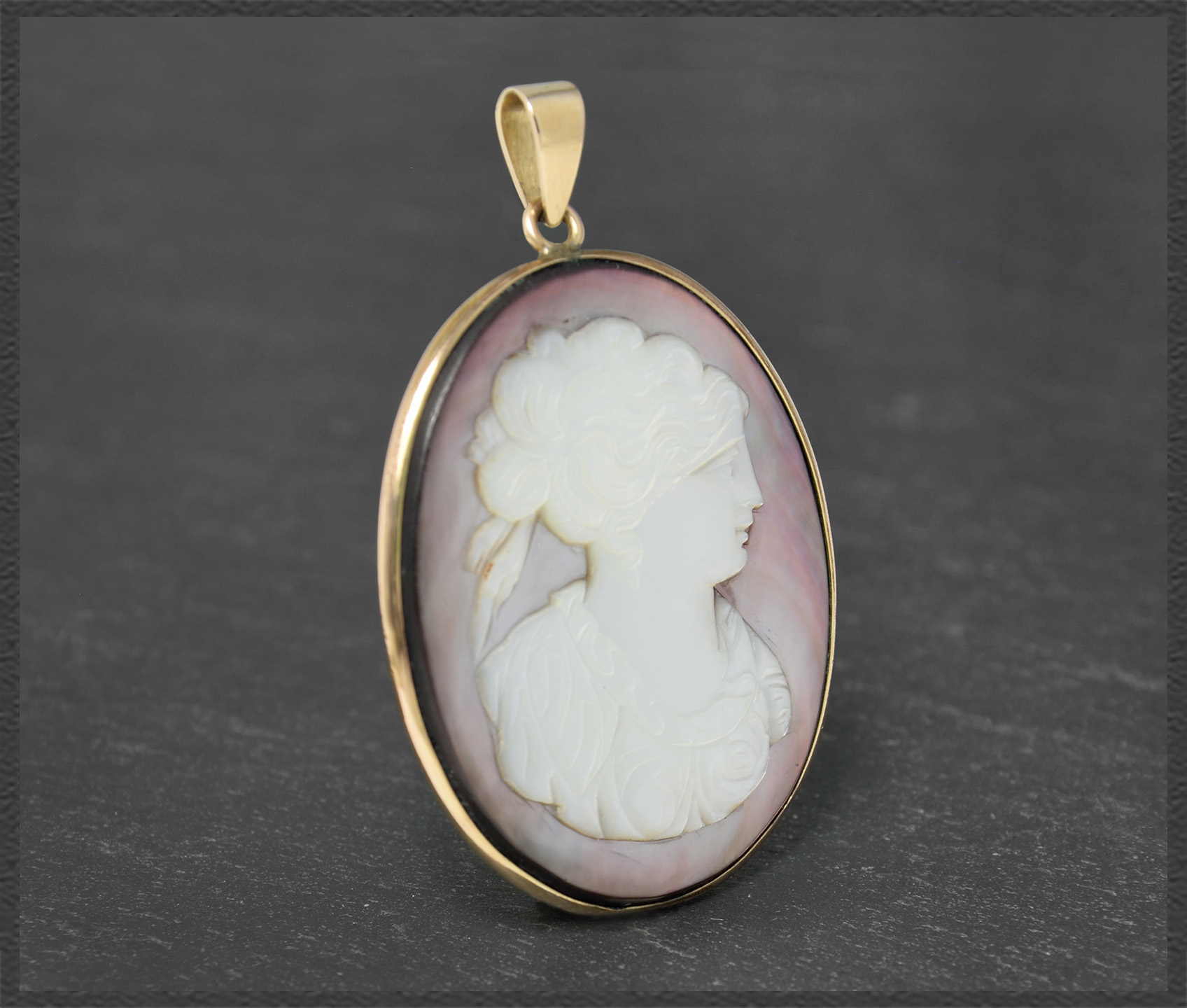 Antiker Damen-Anhänger mit einer großen Gemme aus geschnitztem Perlmutt.