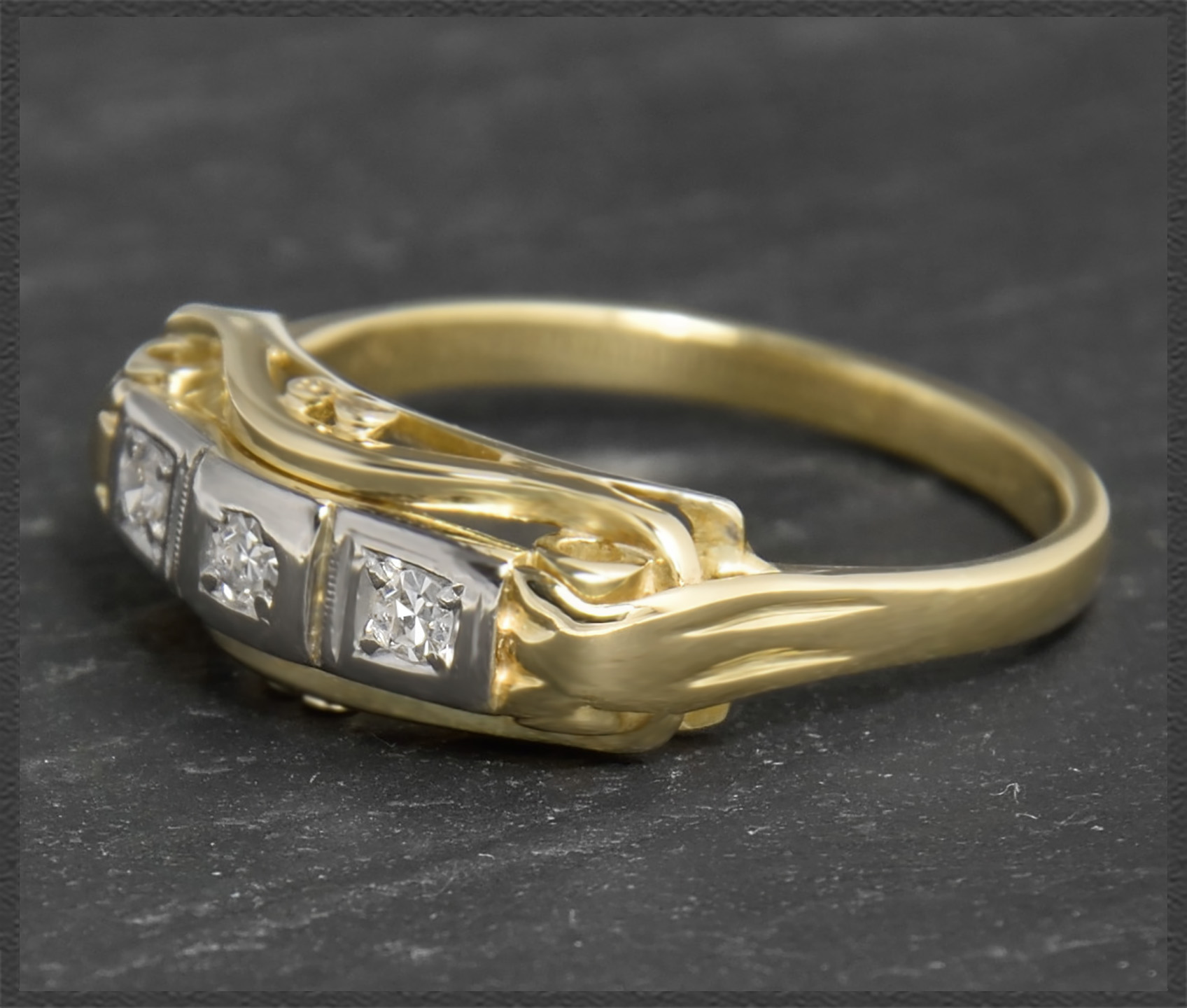 Hergestellt um 1930 vom Goldschmied aus 585 Gelbgold, Diamant-Fassungen aus Weißgold, hochglanzpoliert. Die weichen und runden Formen des Ringes sind typisch für Schmuckstücke dieser Zeit.