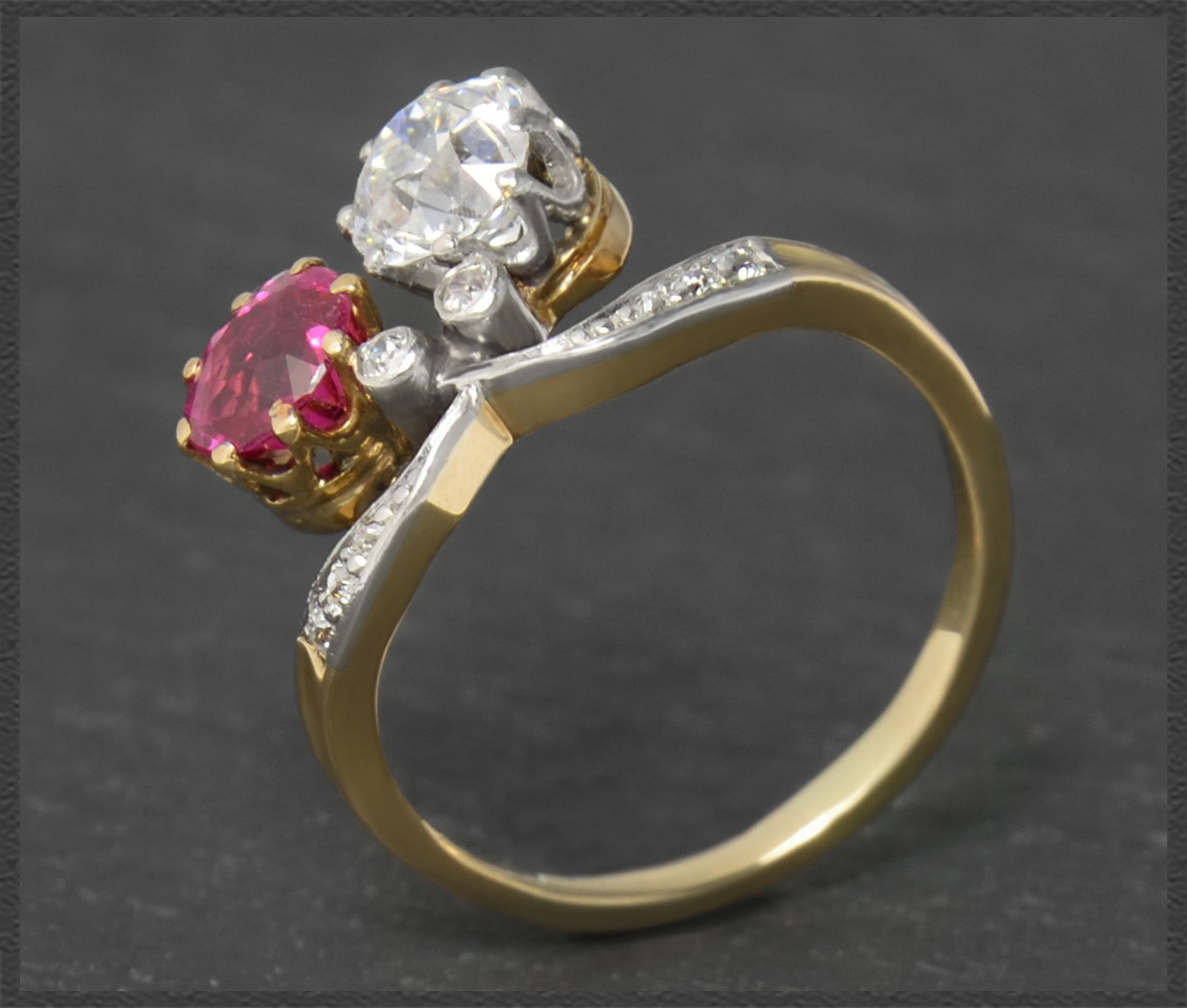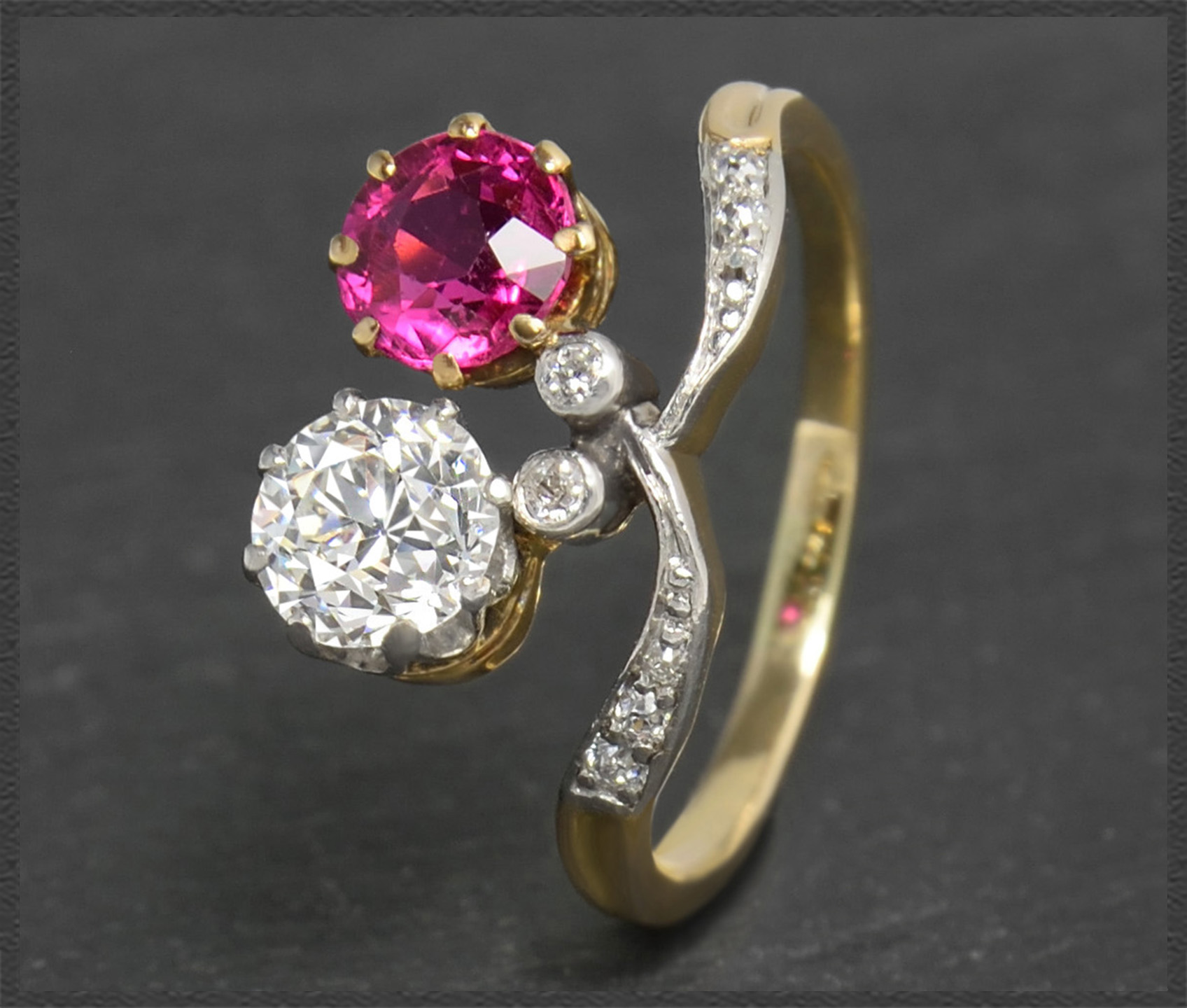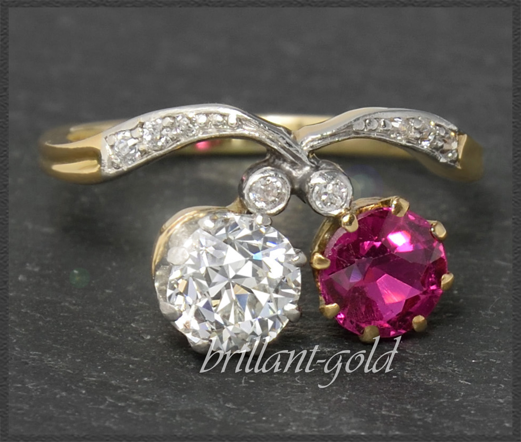 Wunderschöner Ring der Belle Époque, der Begiff "toi et moi" spielt darauf an, dass die etwa gleich großen Edelsteine zwei Liebende darstellen. Eingefasst ist ein wunderschön funkelnder Altschliff Brillant mit ca 1ct in TOP Qualität (River & VS) und ein intensiv pinker Turmalin. Weitere kleirere Diamanten sind am Ring eingefasst. Ein außergewöhnlich schönes & original antikes Schmuckstück.