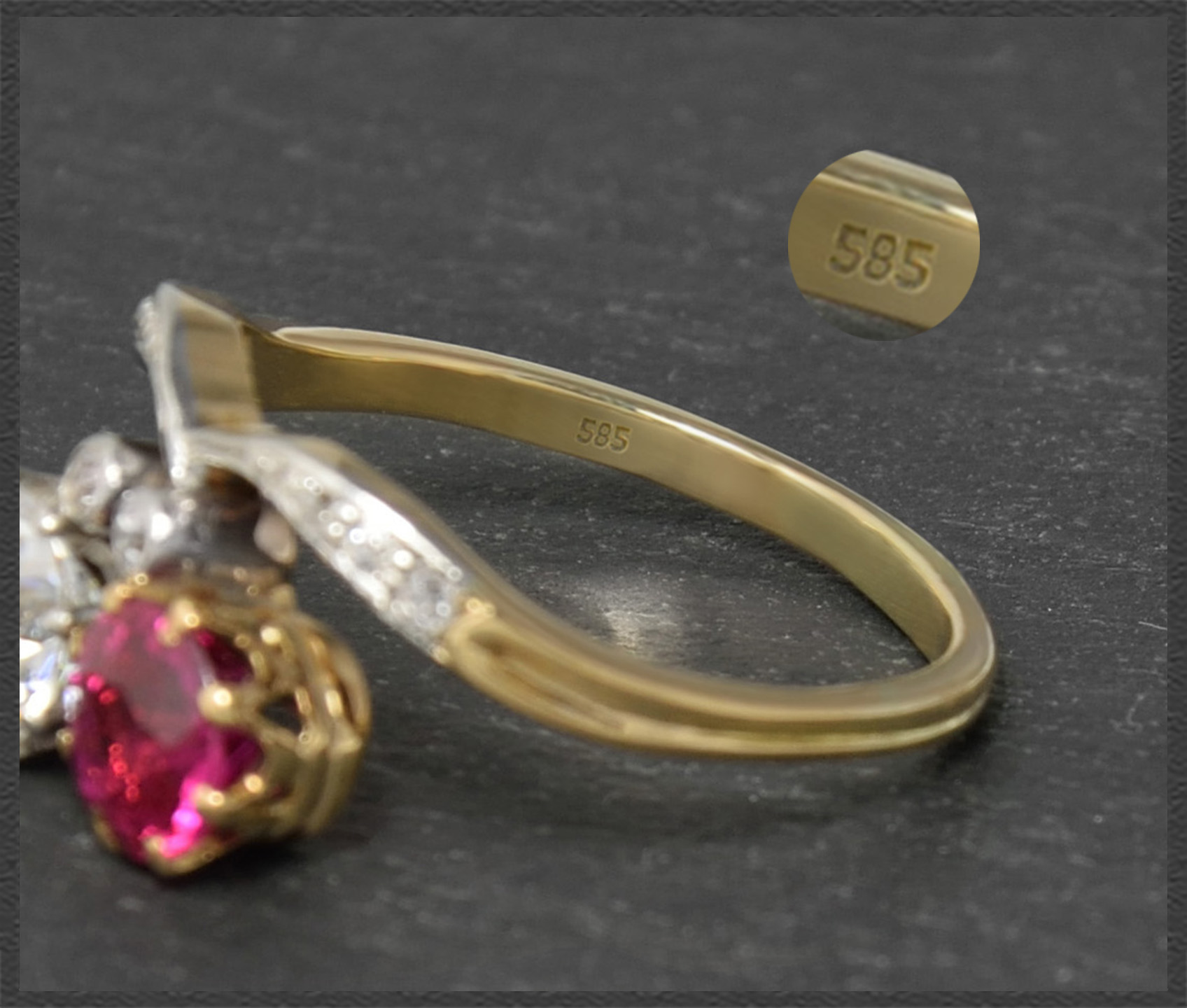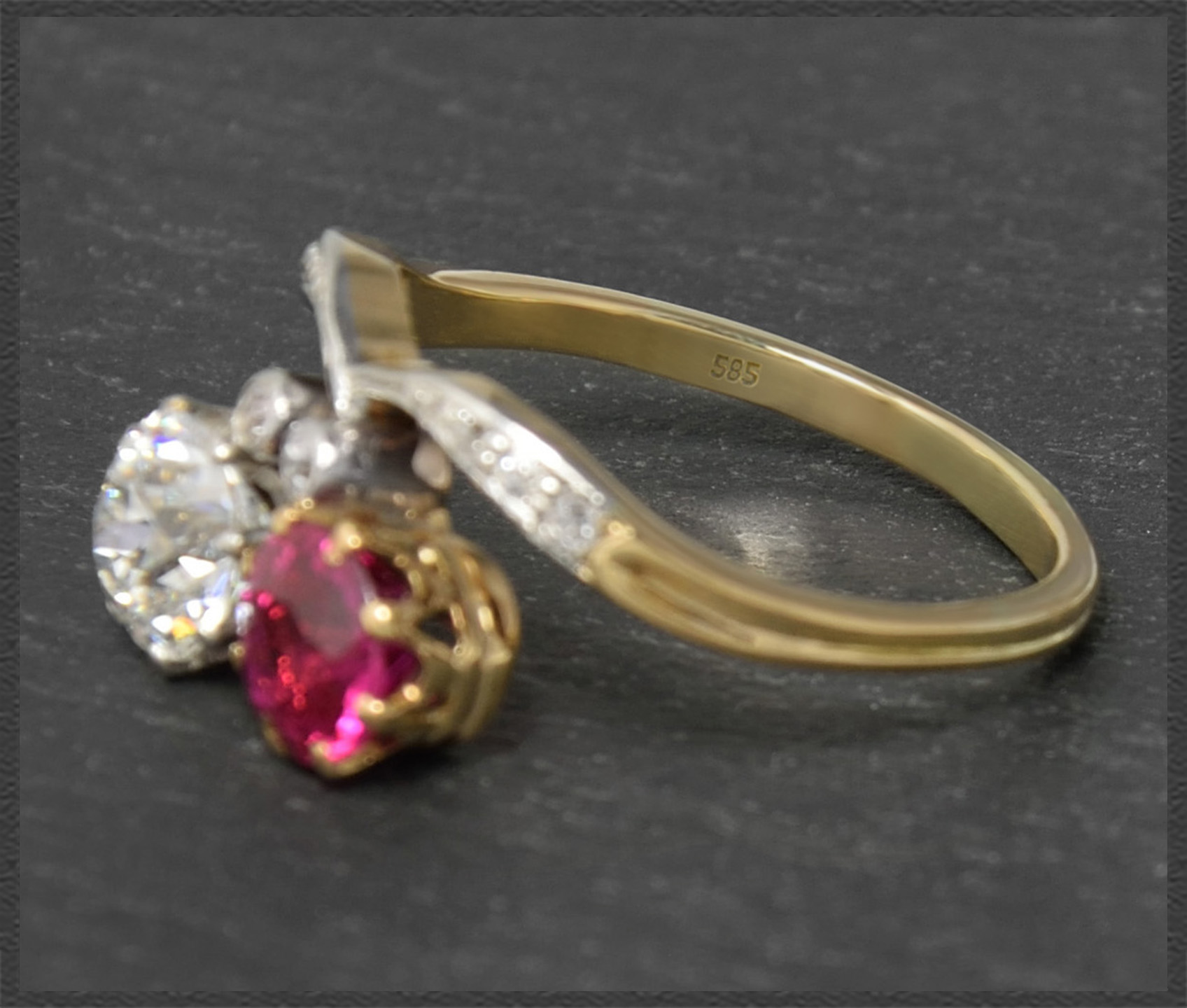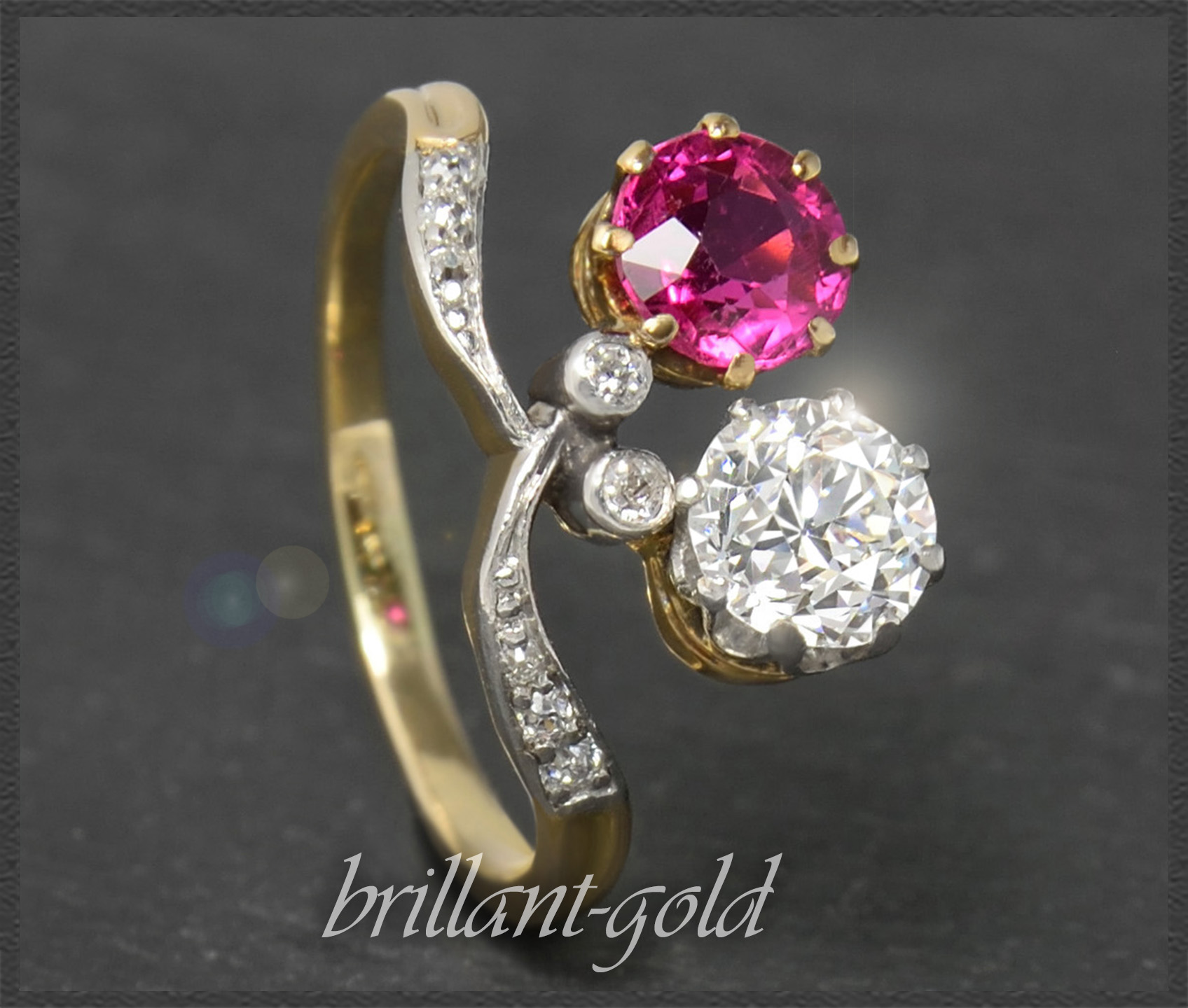 Wunderschöner Ring der Belle Époque, der Begiff "toi et moi" spielt darauf an, dass die etwa gleich großen Edelsteine zwei Liebende darstellen. Eingefasst ist ein wunderschön funkelnder Altschliff Brillant mit ca 1ct in TOP Qualität (River & VS) und ein intensiv pinker Turmalin. Weitere kleirere Diamanten sind am Ring eingefasst. Ein außergewöhnlich schönes & original antikes Schmuckstück.