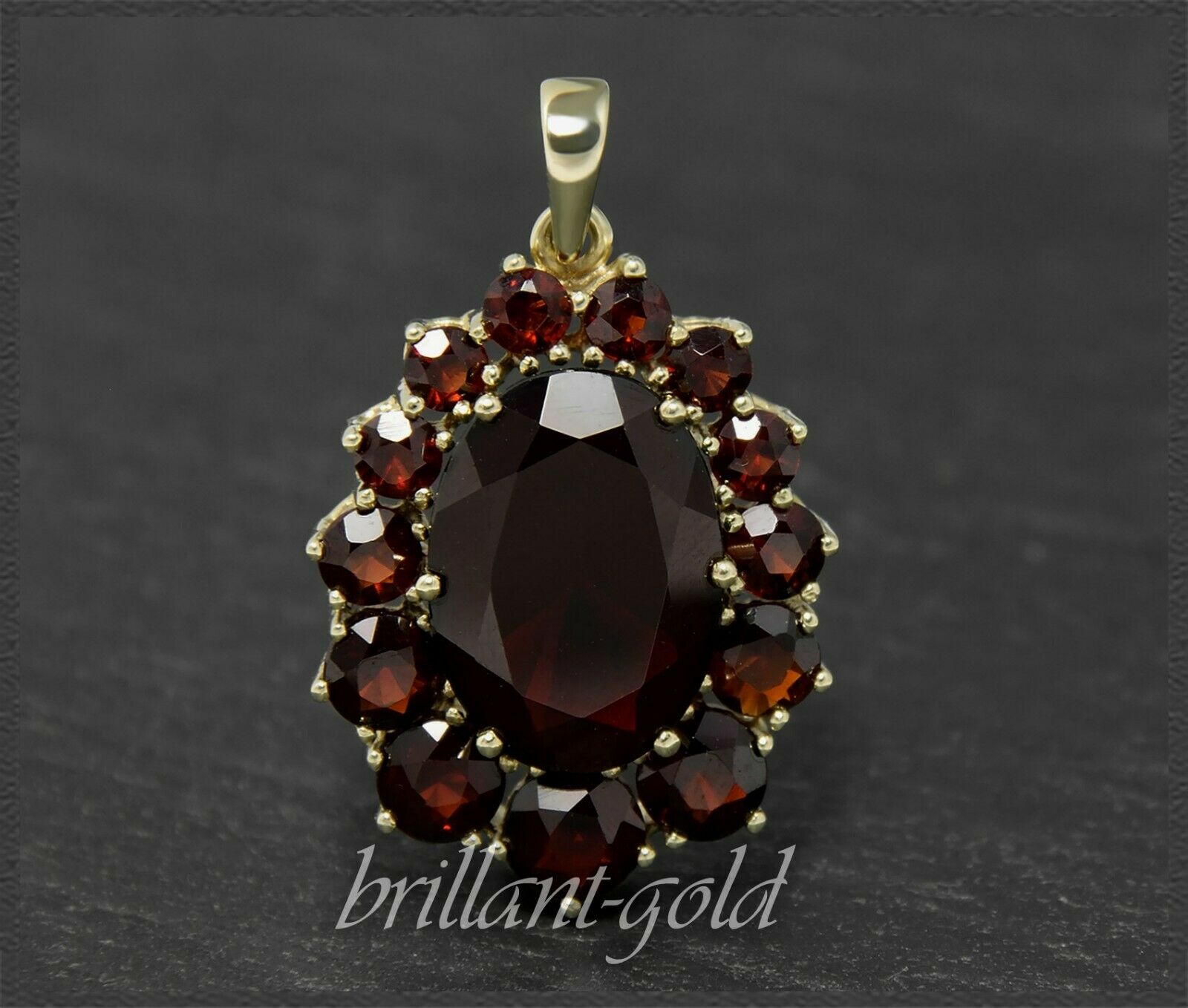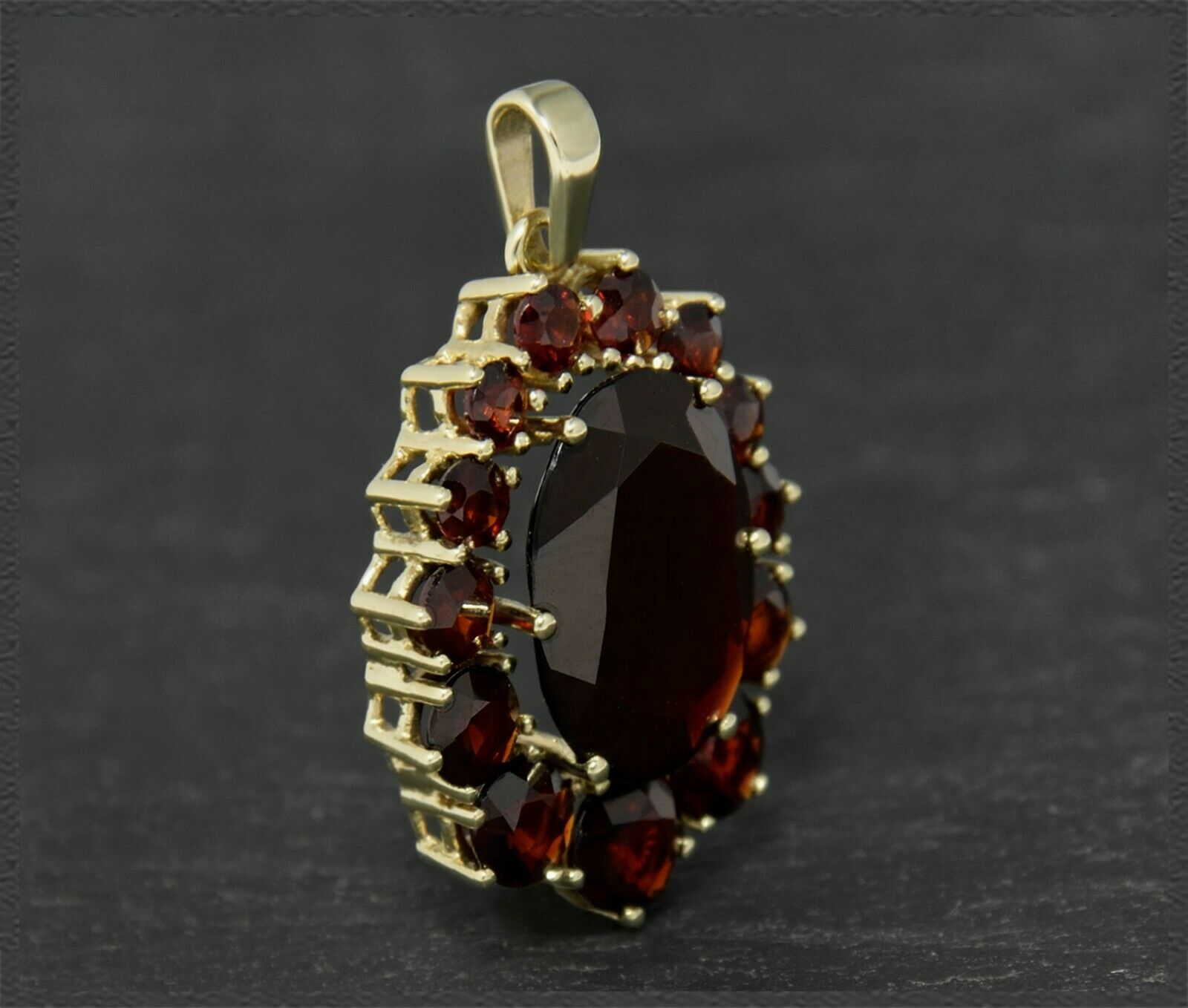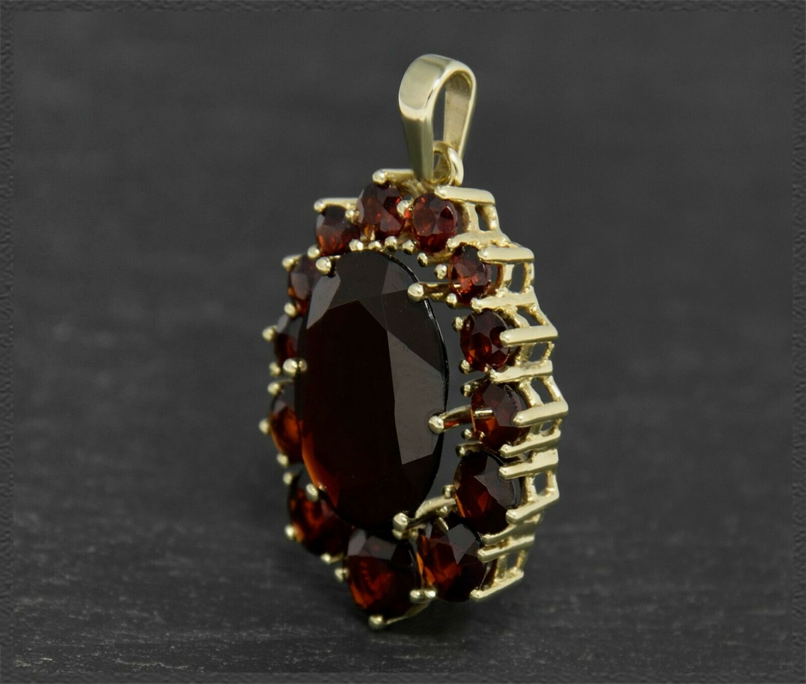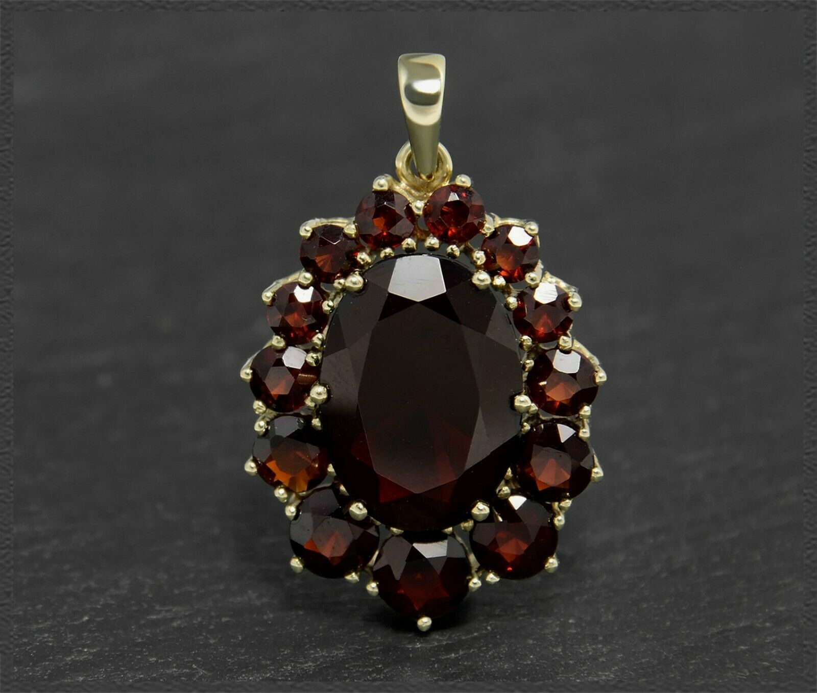 Um den großen, zentralen Granat mit 14 x 10mm sind rundherum weitere Granate eingefasst, die dem Anhänger eine Tropfenform geben.