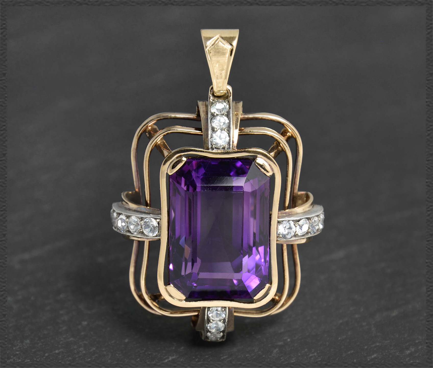Außergewühnlicher Anhänger mit einem großen violetten Amethyst und weißen Saphiren.