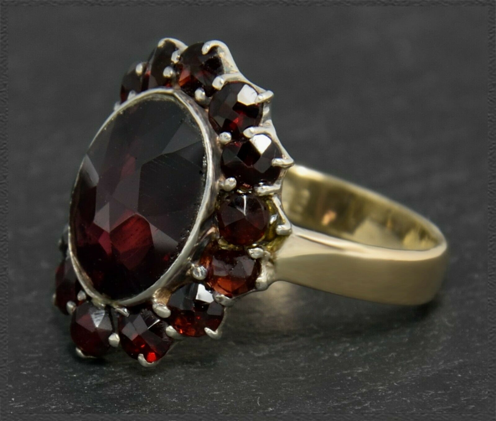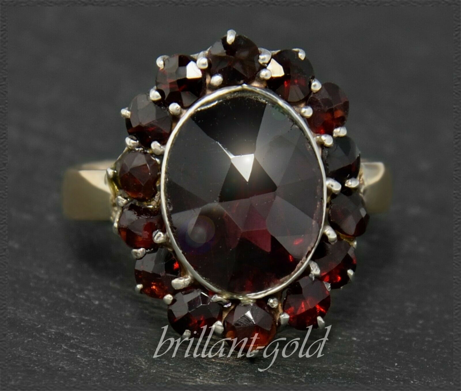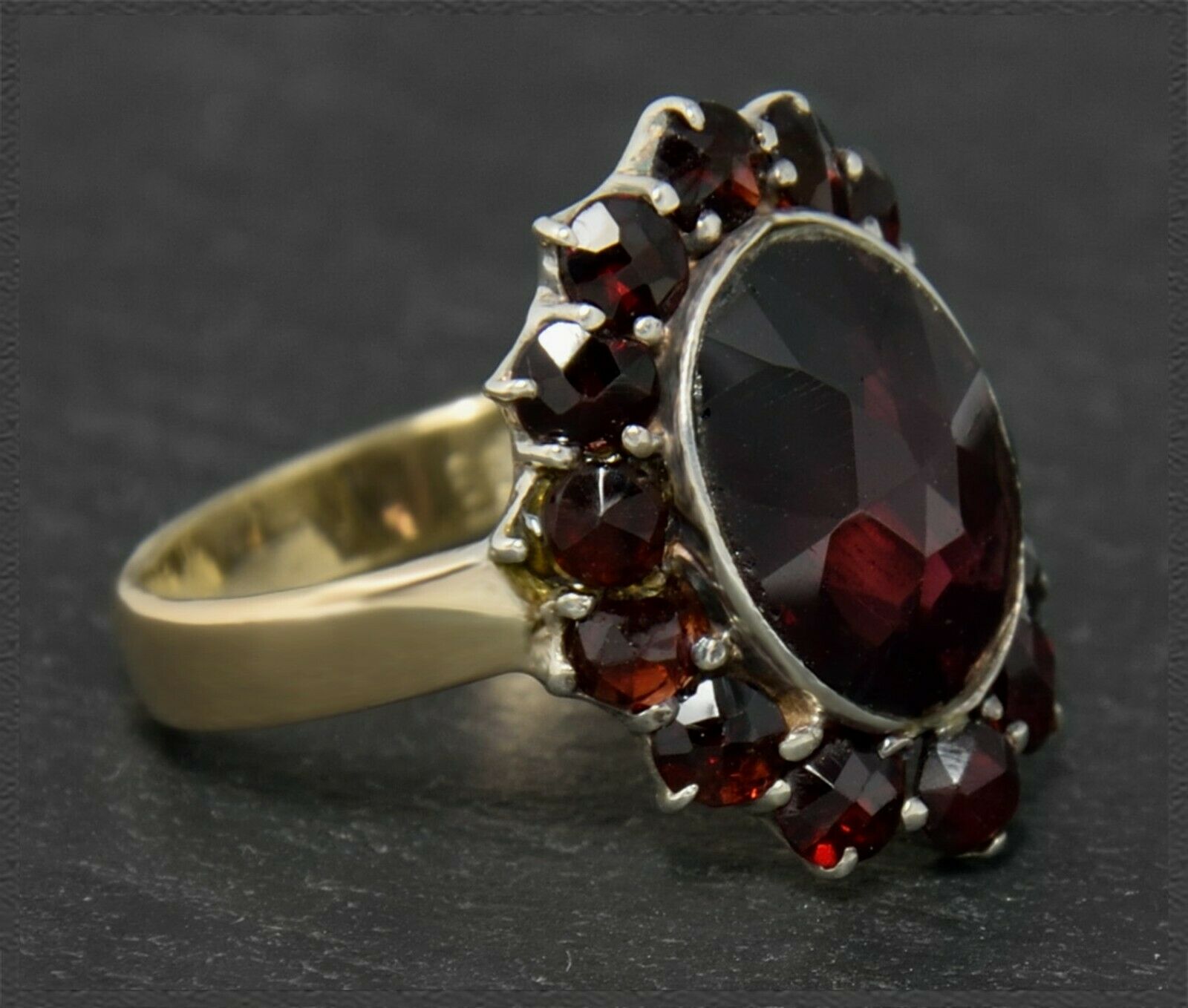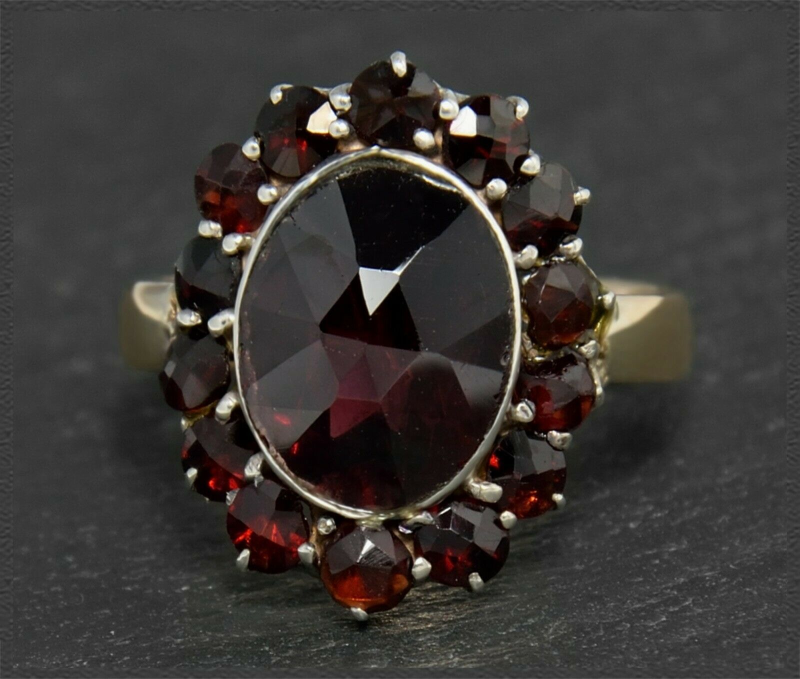 Besetzt ist der Ring mit einem großen ovalen Granat (ca 5ct), der von zahlreichen kleineren Granaten umrandet wird.