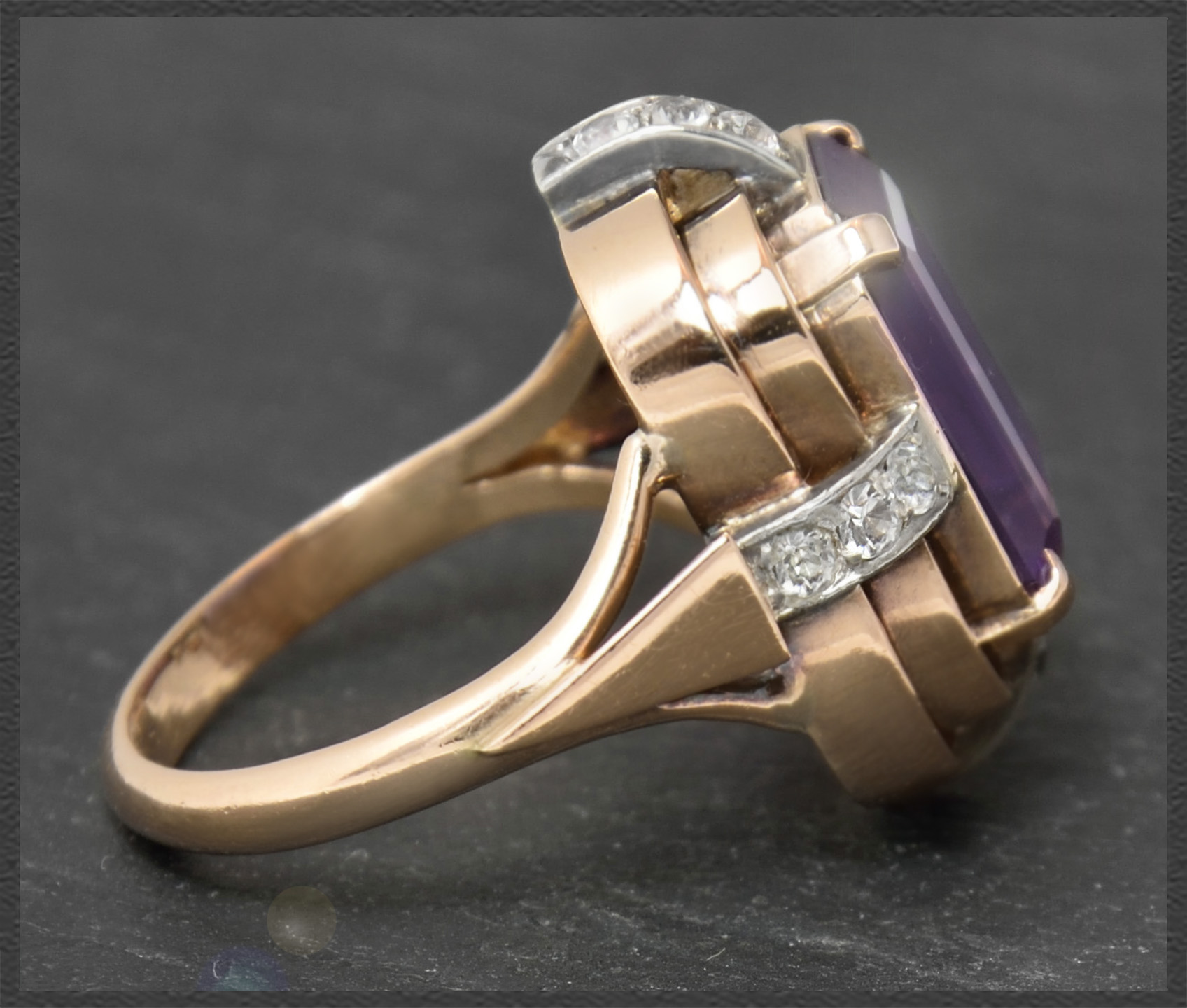Eleganter Art Deco Cocktail Ring, gefertigt im späten Art Deco Stil um ca 1930, mit einem hochwertigen 6,90ct Amethyst und weißen Saphiren.