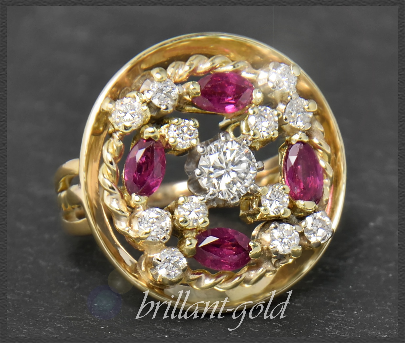 Ring im Stil des späten Art Deco, symmetrische Anordnung der Edelsteine, verziert mit Gold-Kordeln.