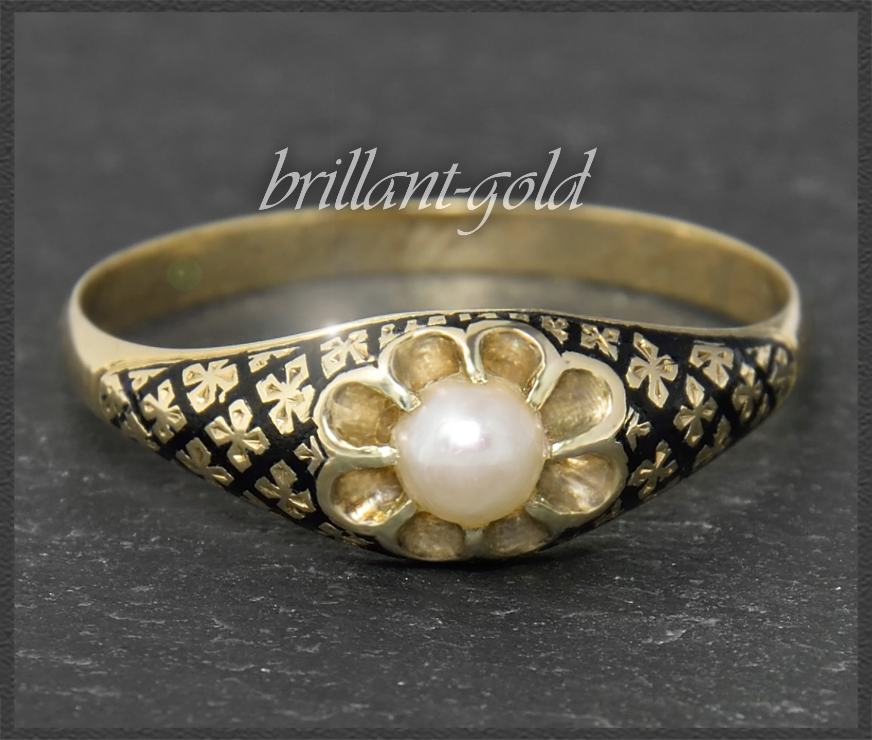 Seltener antiker (Gravur 1864!) Ring mit einer Perle, graviert & verziert mit schwarzem Email. Außerordentlich guter Erhaltungszustand!