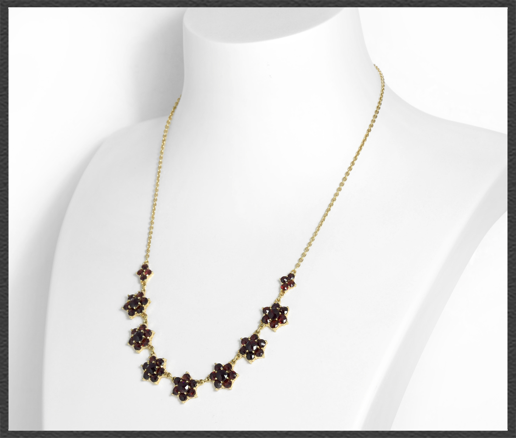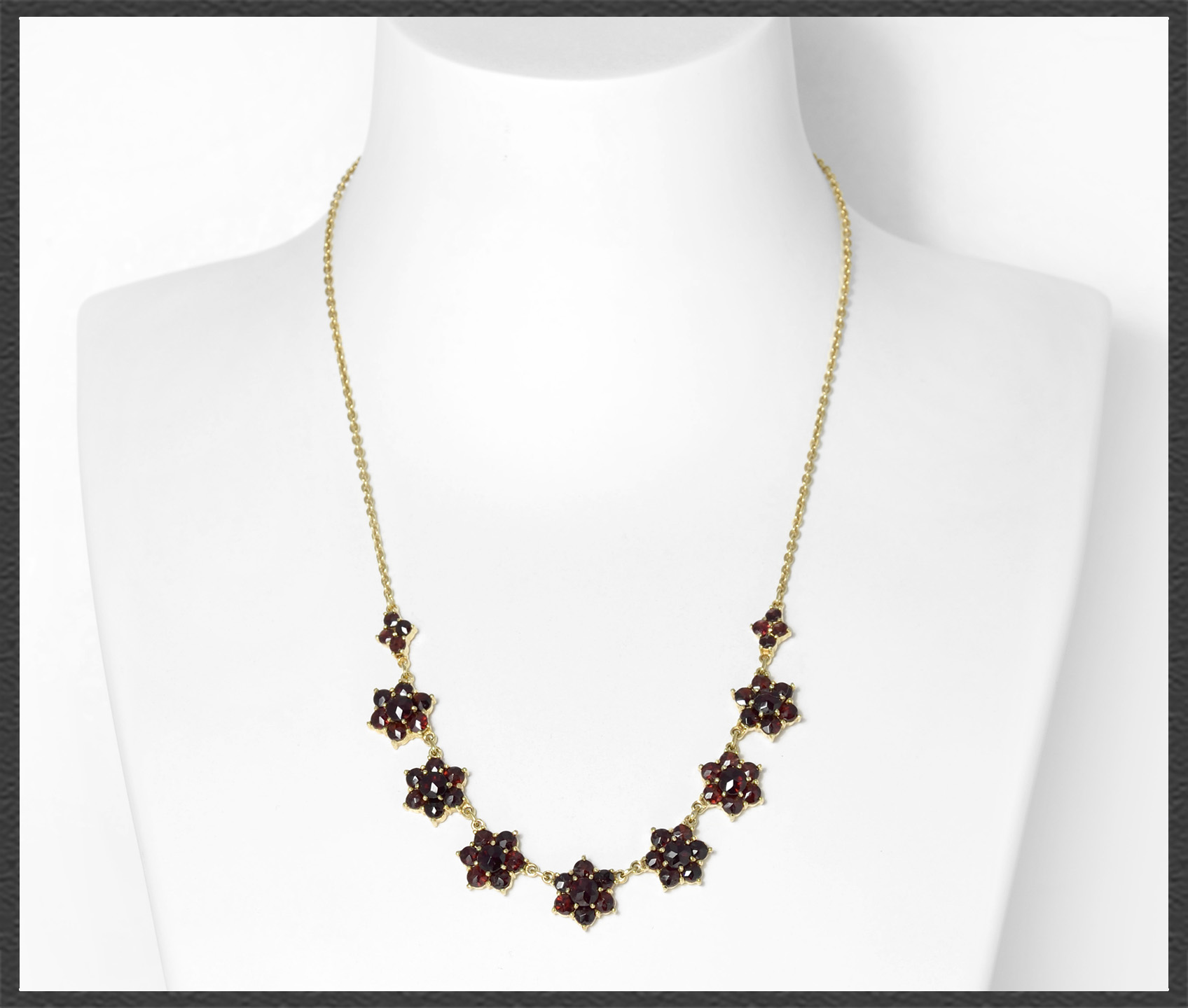 Im Collier eingefasst sind 14ct sehr schöne, intensiv rote Granate im Rundschliff mit je 3 - 5mm Durchmesser.