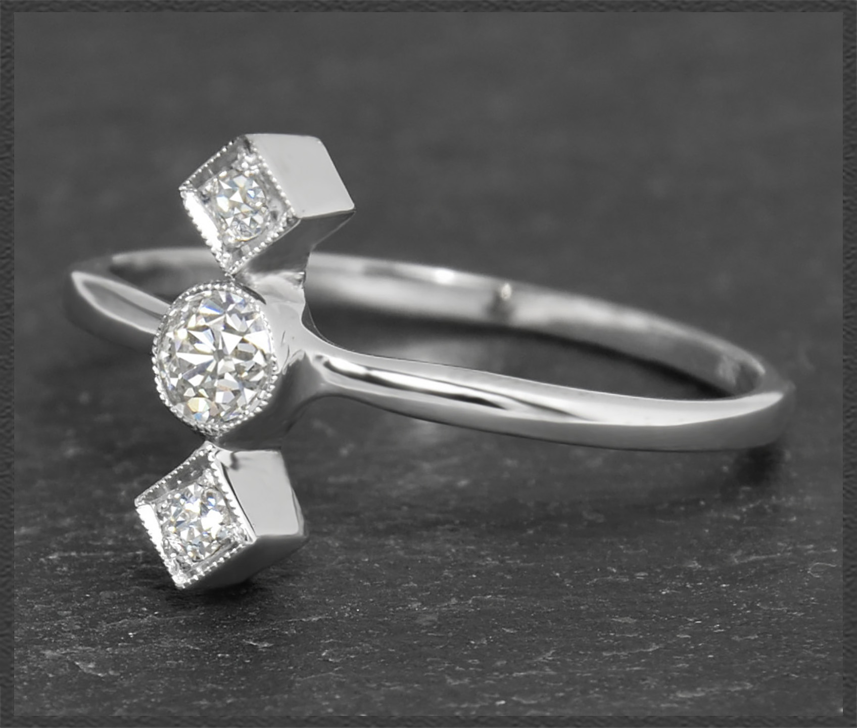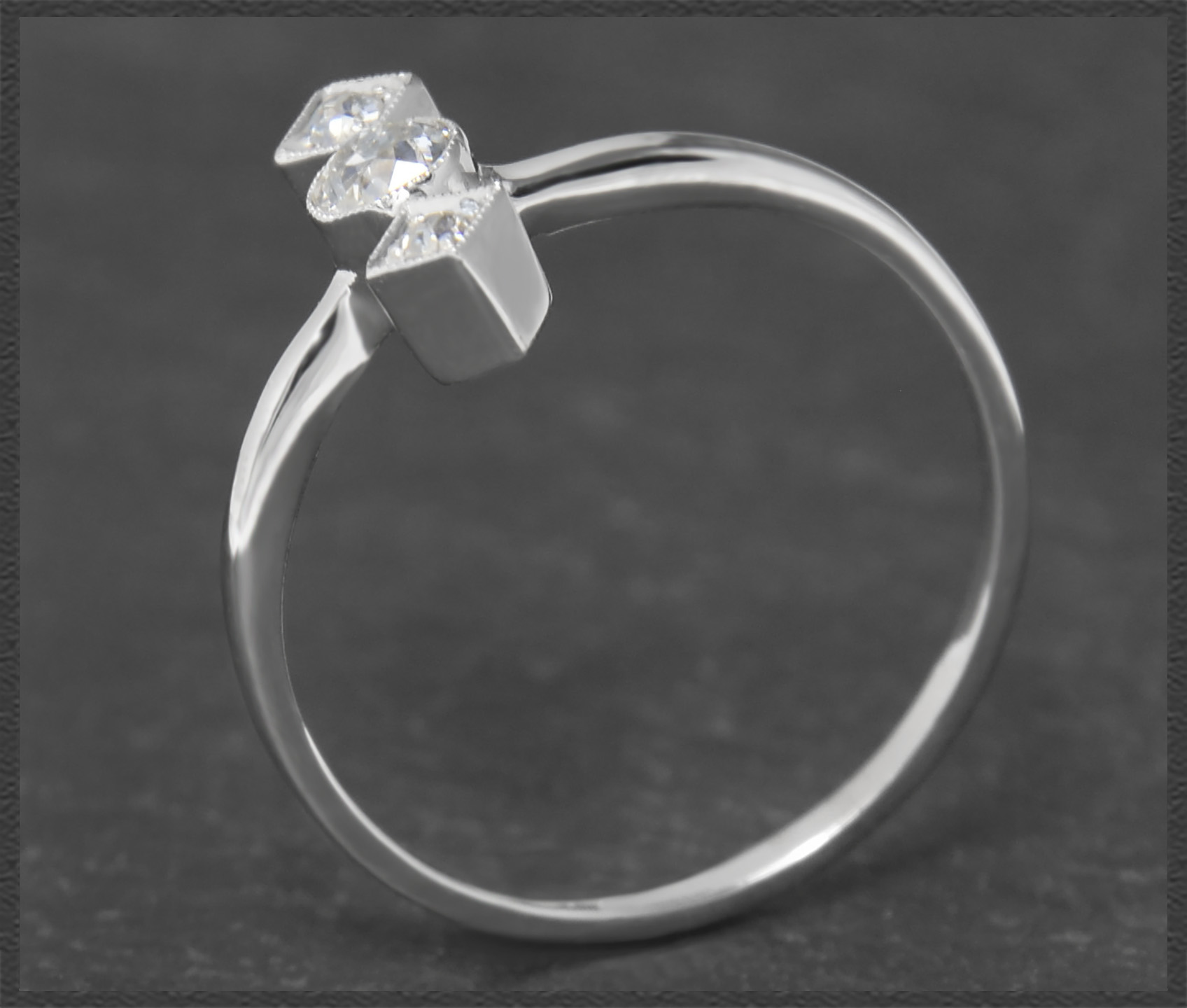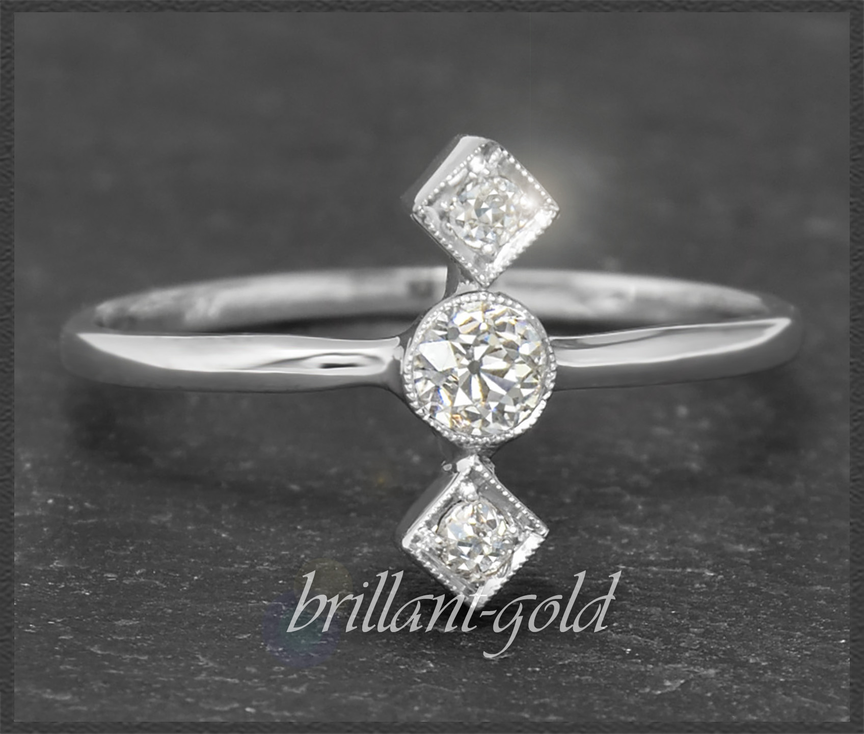 Zentral ist ein großer Altschliff Brillant mit 0,22ct in einer runden Fassung eingefasst, seitlich zieren den Ring zwei quadratische Fassungen mit je einem kleineren Diamanten. Alle Diamanten haben eine sehr gute Qualität und funkeln sehr schön im Licht.