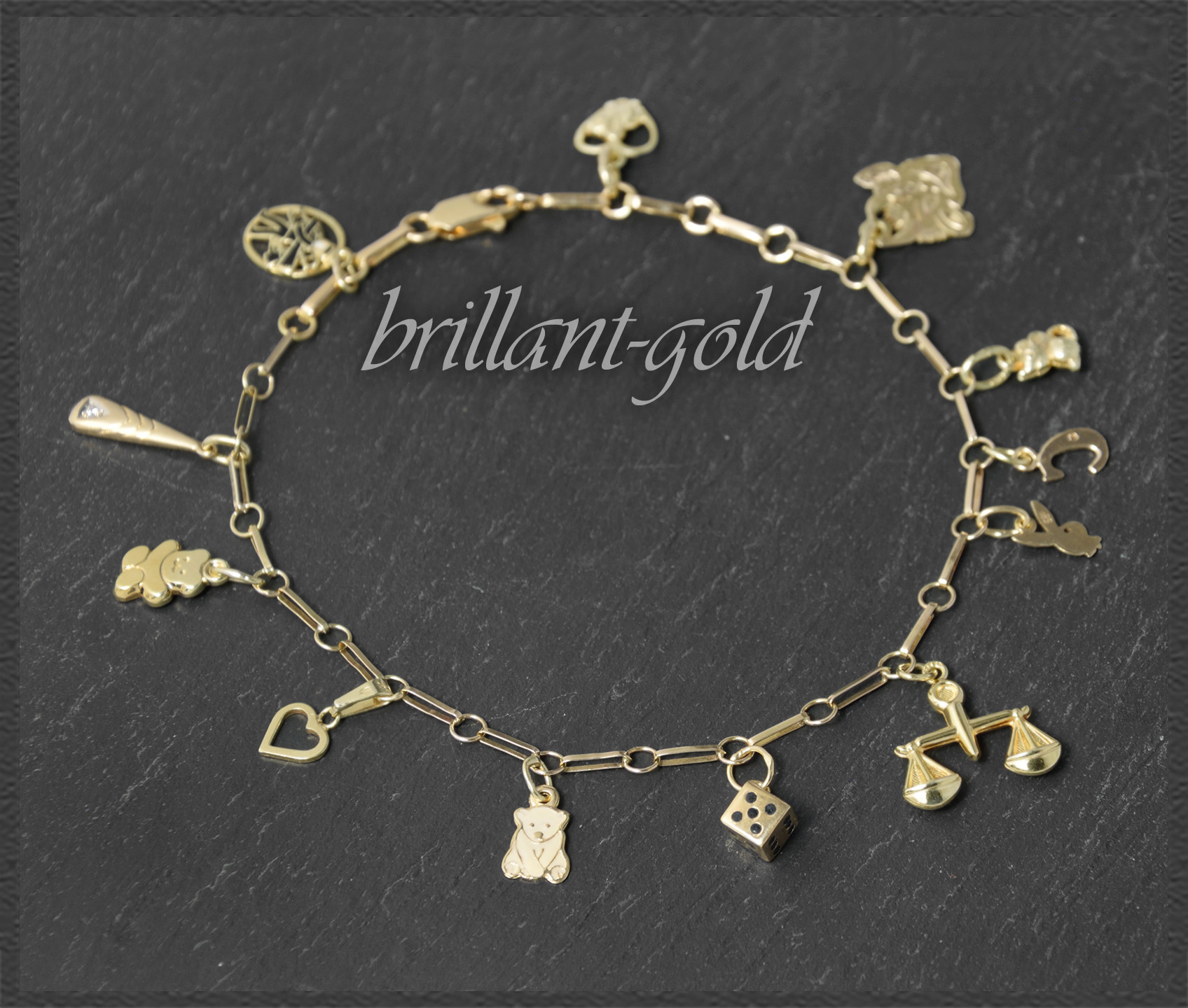 Bettelarmband mit vielen verschiedenen Anhängern. Insgesamt sind 12 verschiedene Goldanhänger am Bettelarmband angebracht.