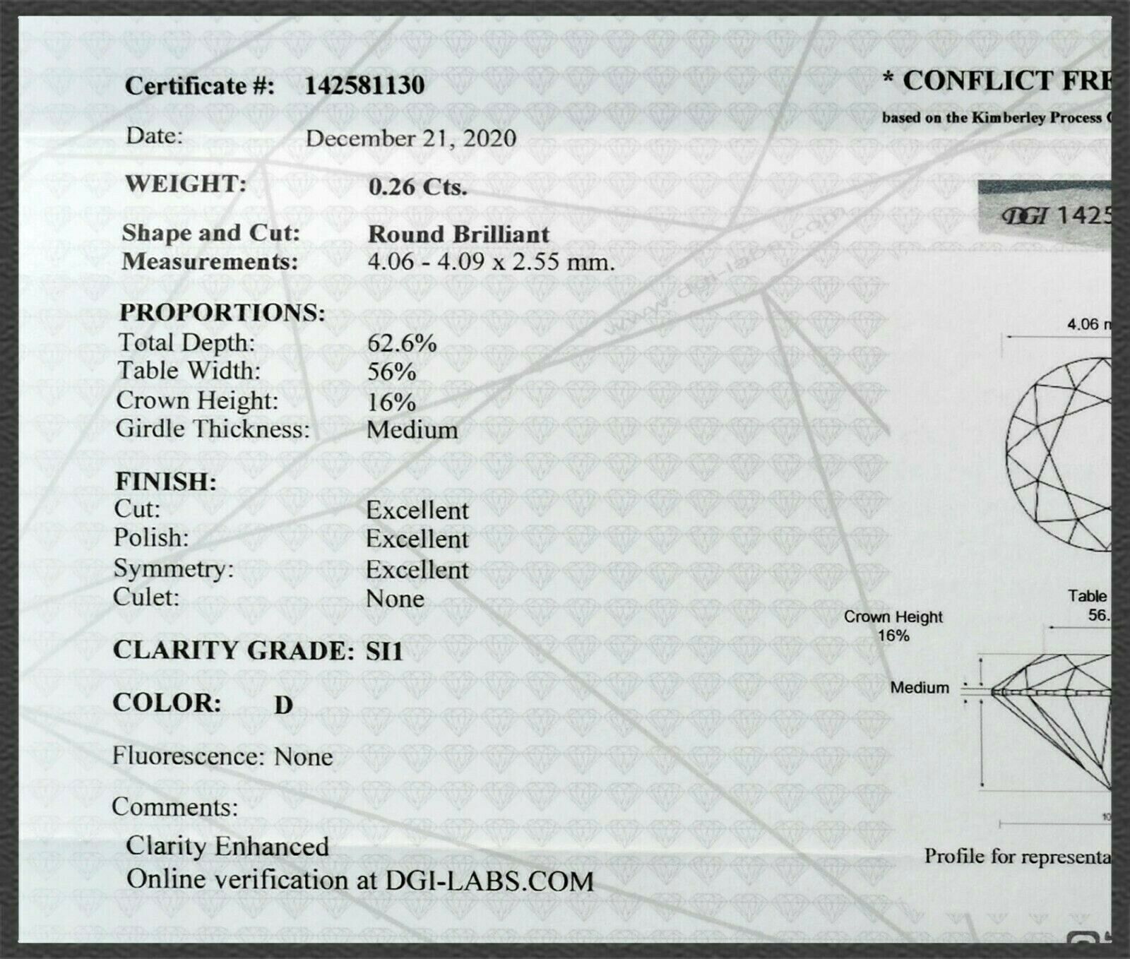 Das originale DGI Zertifikat erhalten Sie dazu. Außerdem hat der Diamant eine laser-markierter Rundiste (mit der Zertifikats Nummer). Absolute Sicherheit für Sie als Käufer!