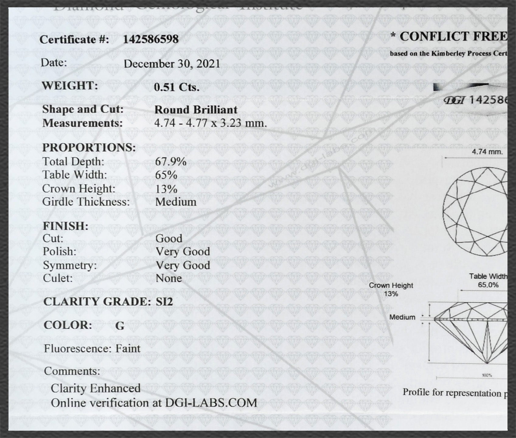 Das originale DGI Zertifikat erhalten Sie dazu. Außerdem hat der Diamant eine laser-markierter Rundiste (mit der Zertifikats Nummer). Absolute Sicherheit für Sie als Käufer!
