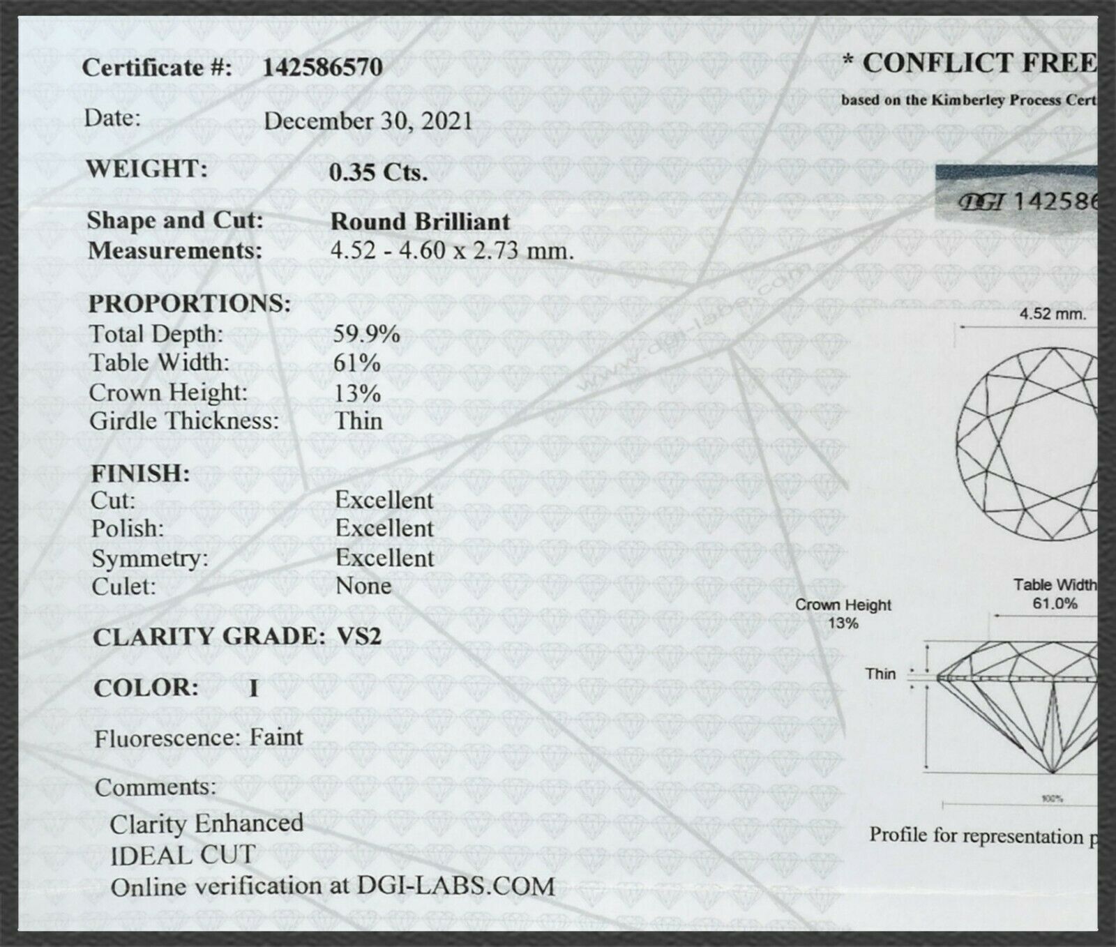 Das originale DGI Zertifikat erhalten Sie dazu. Außerdem hat der Diamant eine laser-markierter Rundiste (mit der Zertifikats Nummer). Absolute Sicherheit für Sie als Käufer!