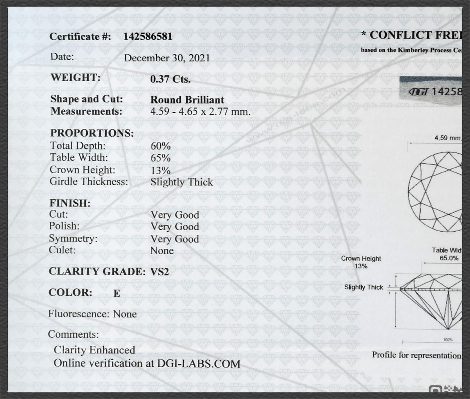 Das originale DGI Zertifikat erhalten Sie dazu. Außerdem hat der Diamant eine laser-markierter Rundiste (mit der Zertifikats Nummer). Absolute Sicherheit für Sie als Käufer!