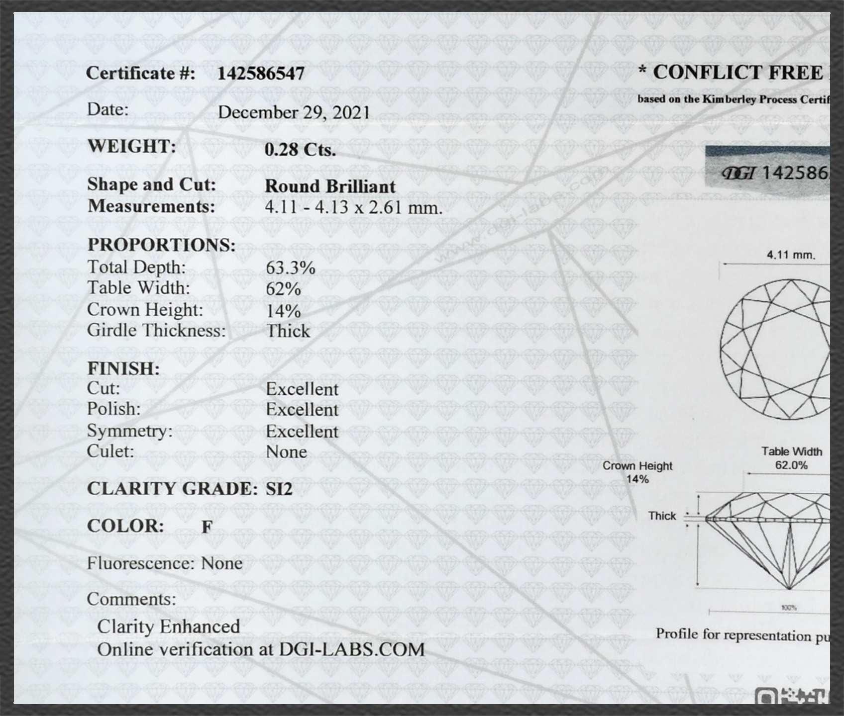 Das originale DGI Zertifikat erhalten Sie dazu. Außerdem hat der Diamant eine laser-markierter Rundiste (mit der Zertifikats Nummer). Absolute Sicherheit für Sie als Käufer!
