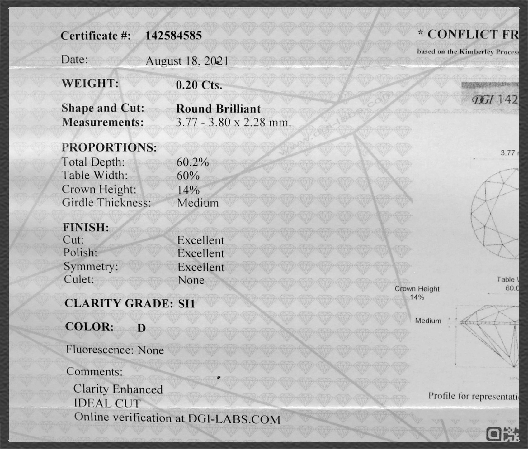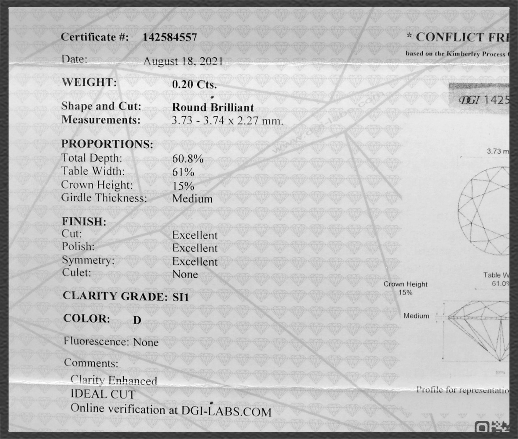 Die originalen DGI Zertifikate erhalten Sie dazu. Außerdem haben die Diamanten eine laser-markierter Rundiste (mit der Zertifikats Nummer). Absolute Sicherheit für Sie als Käufer!