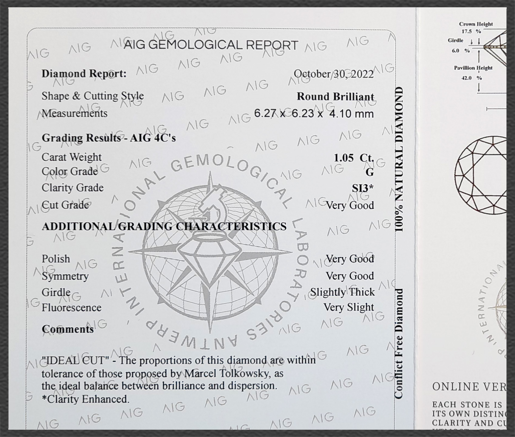 Das originale Diamant Zertifikat des gemmologischen Labors AIG erhalten sie dazu.