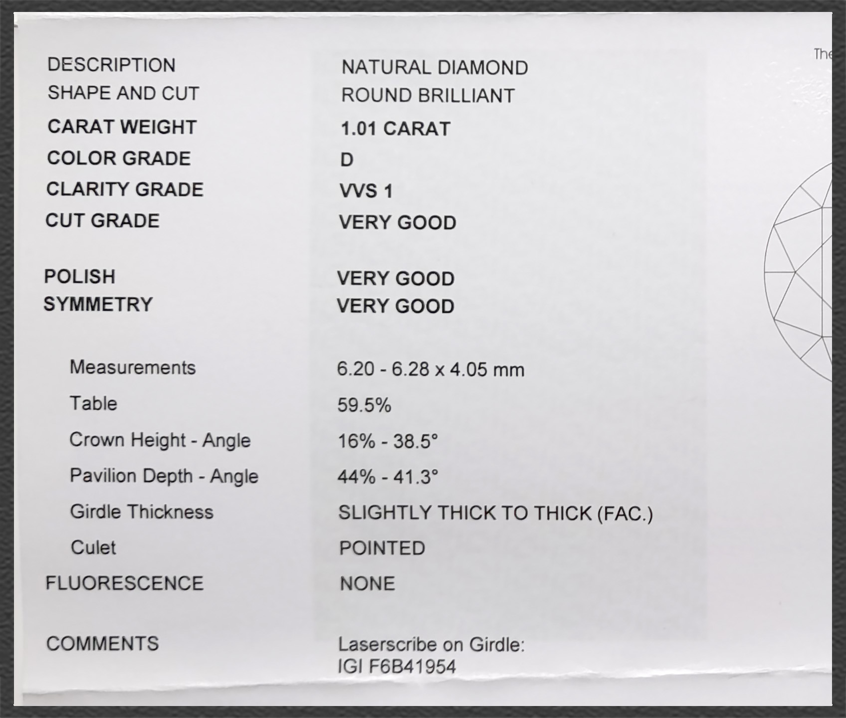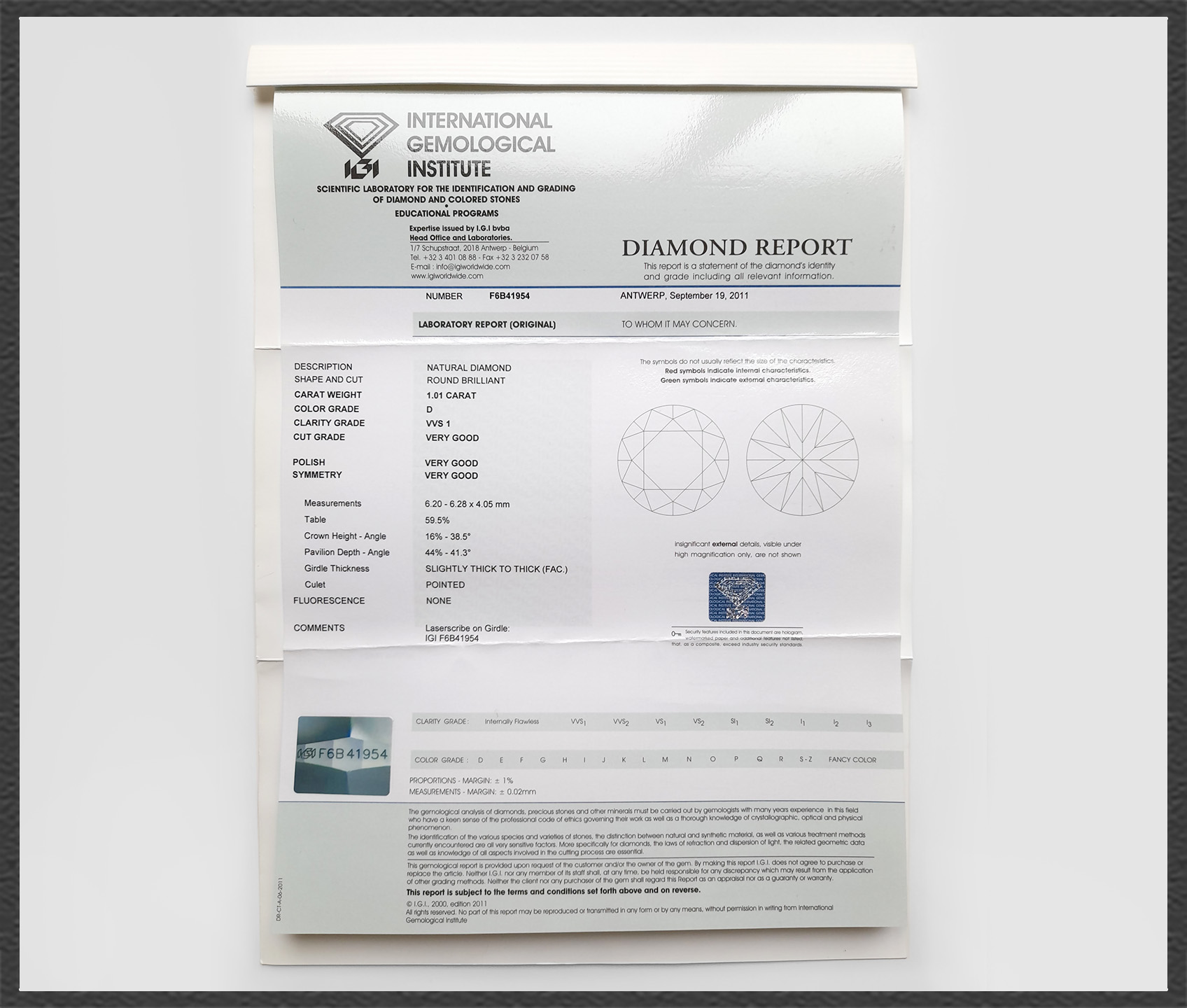 Eingefasst ist ein natürlicher 1,01ct Brillant in BESTER Farbe (River D) und hervorragender Reinheit (VVS1). Der Diamant funkelt schön im Licht. Das originale IGI Zertifikat des eingefassten Diamanten erhalten Sie dazu. Außerdem hat der Diamant eine laser-markierte Rundiste (mit der Zertifikats Nummer). Absolute Sicherheit für Sie als Käufer!
