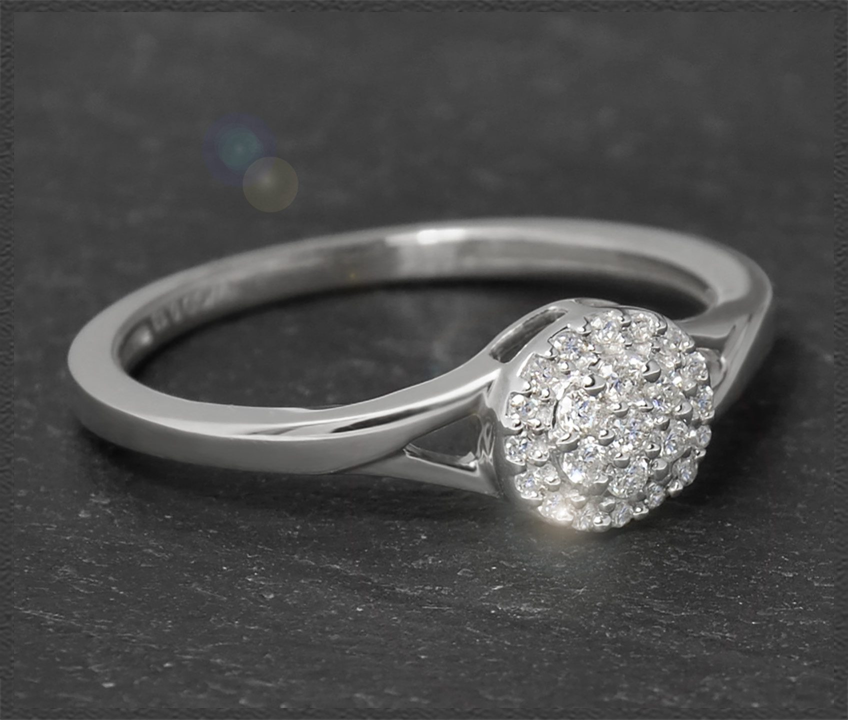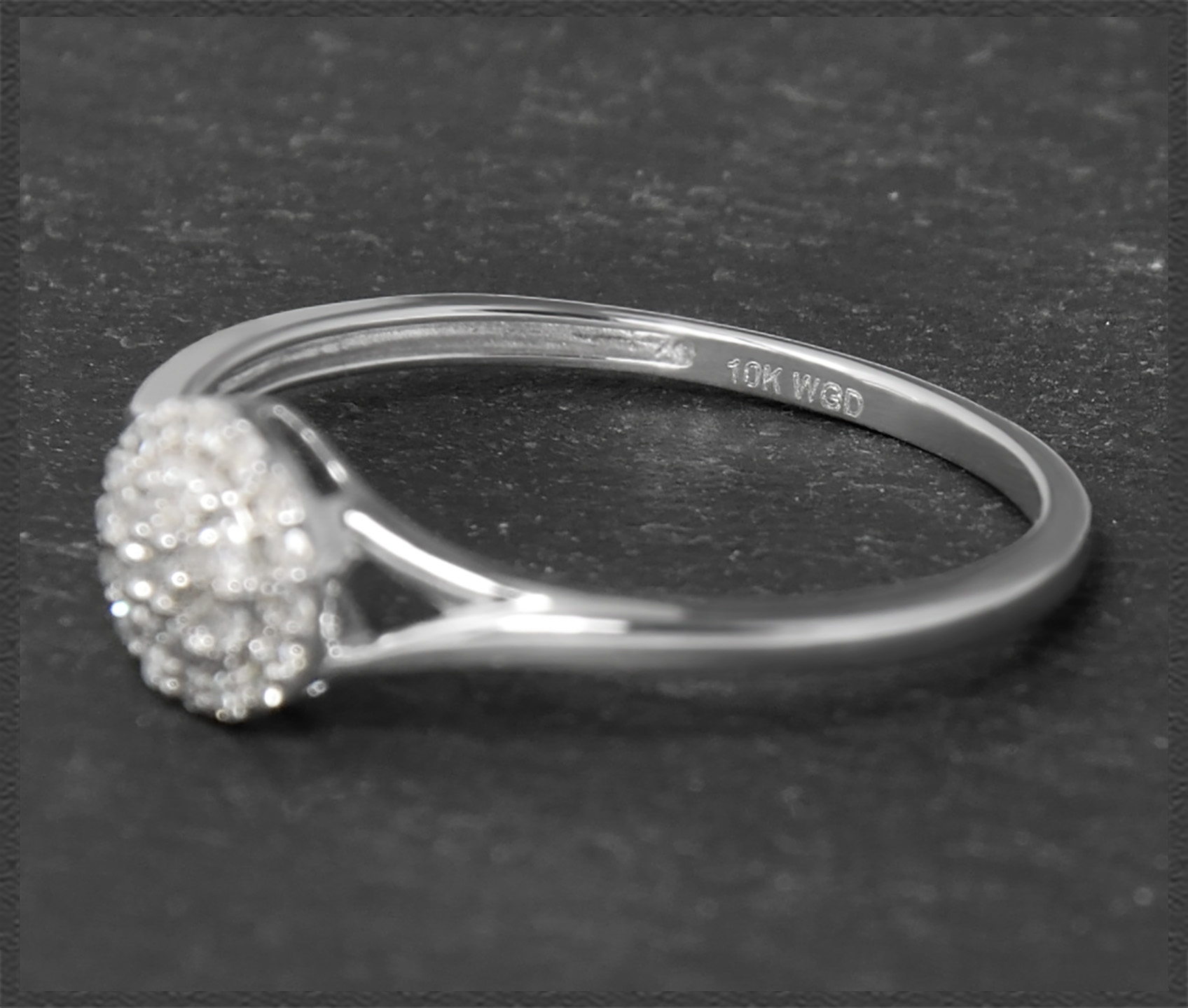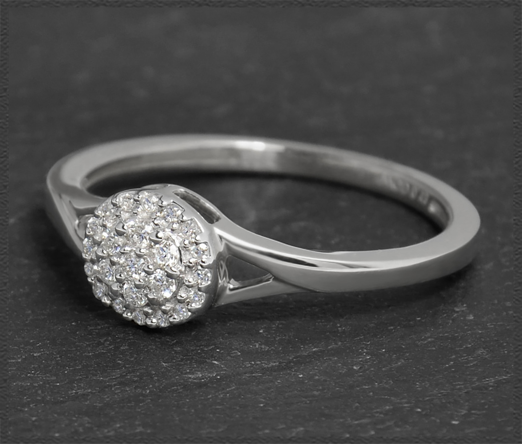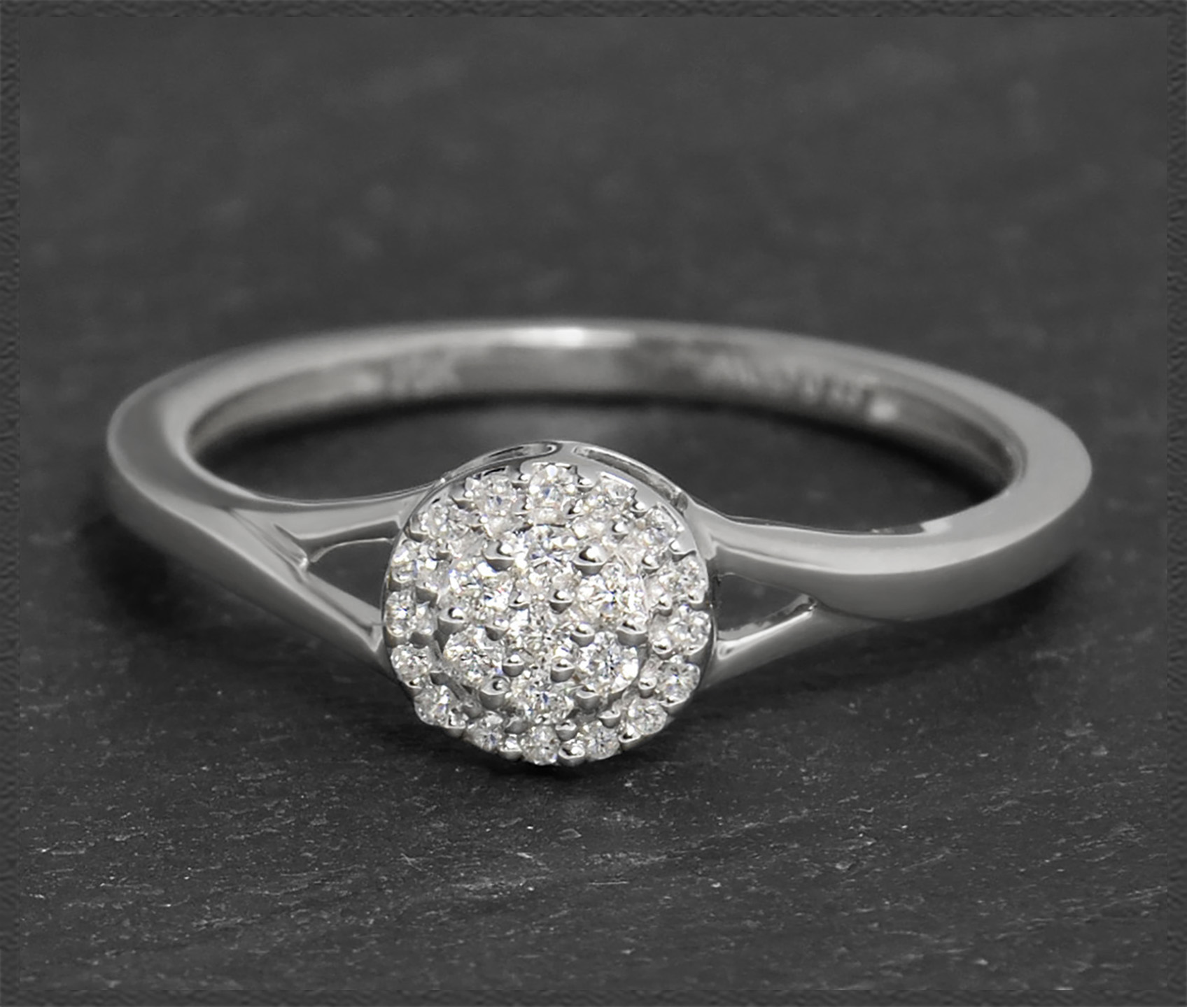 Die Diamanten sind ganz eng nebeneinander eingefasst (Micro Pave Fassung), sodass zwischen den Diamanten kaum Platz ist und somit möglichst viel Licht reflektiert wird. Zusätzlich sind die Diamanten in Weißgold eingefasst, damit sie noch schöner funkeln. Insgesamt 0,20ct Diamanten funkeln wunderschön im Licht. Durch die Spezial-Fassung sieht es fast so aus, als würde ein eizelner Brillant Solitär mit fast 1,10ct im Brillantring eingefasst sein.