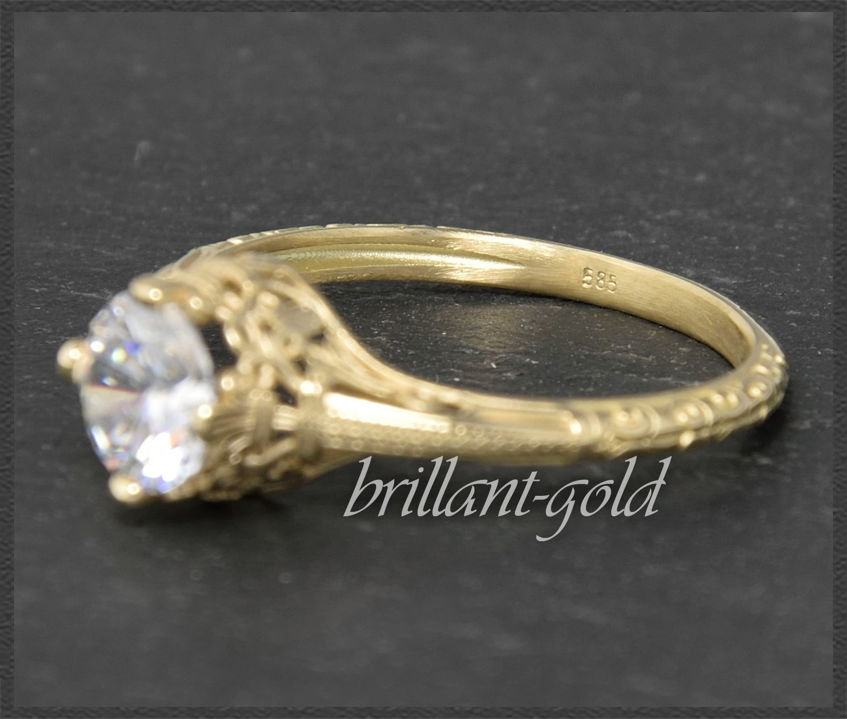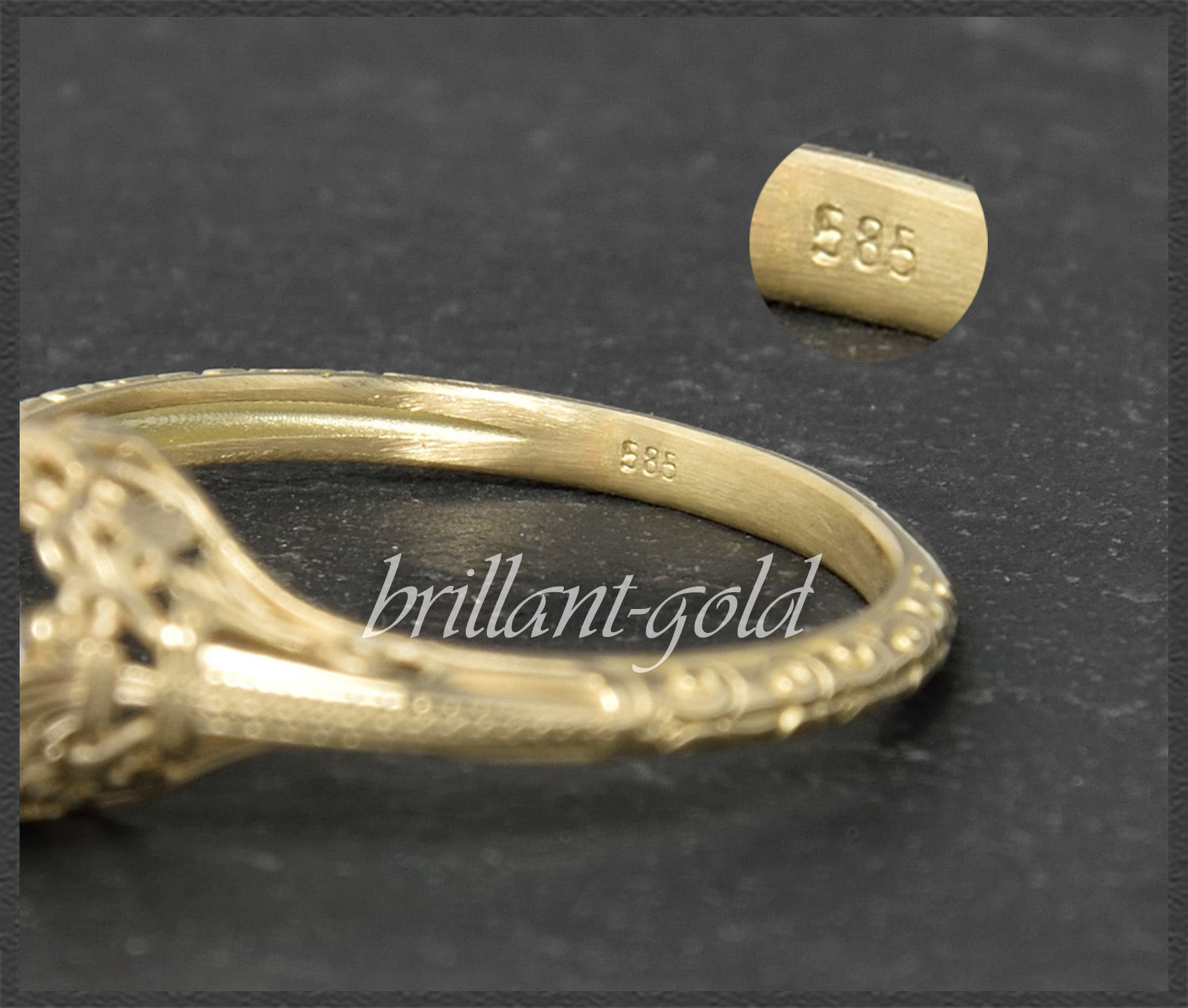 Gefertigt vom Goldschmied aus 585 Gelbgold, hochglanzpoliert. Wunderschöne Ringfassung im typischen Jugendstil Design. Der Ring ist liebevoll mit aufwendig gestalteten & filigranen Elementen verziert.