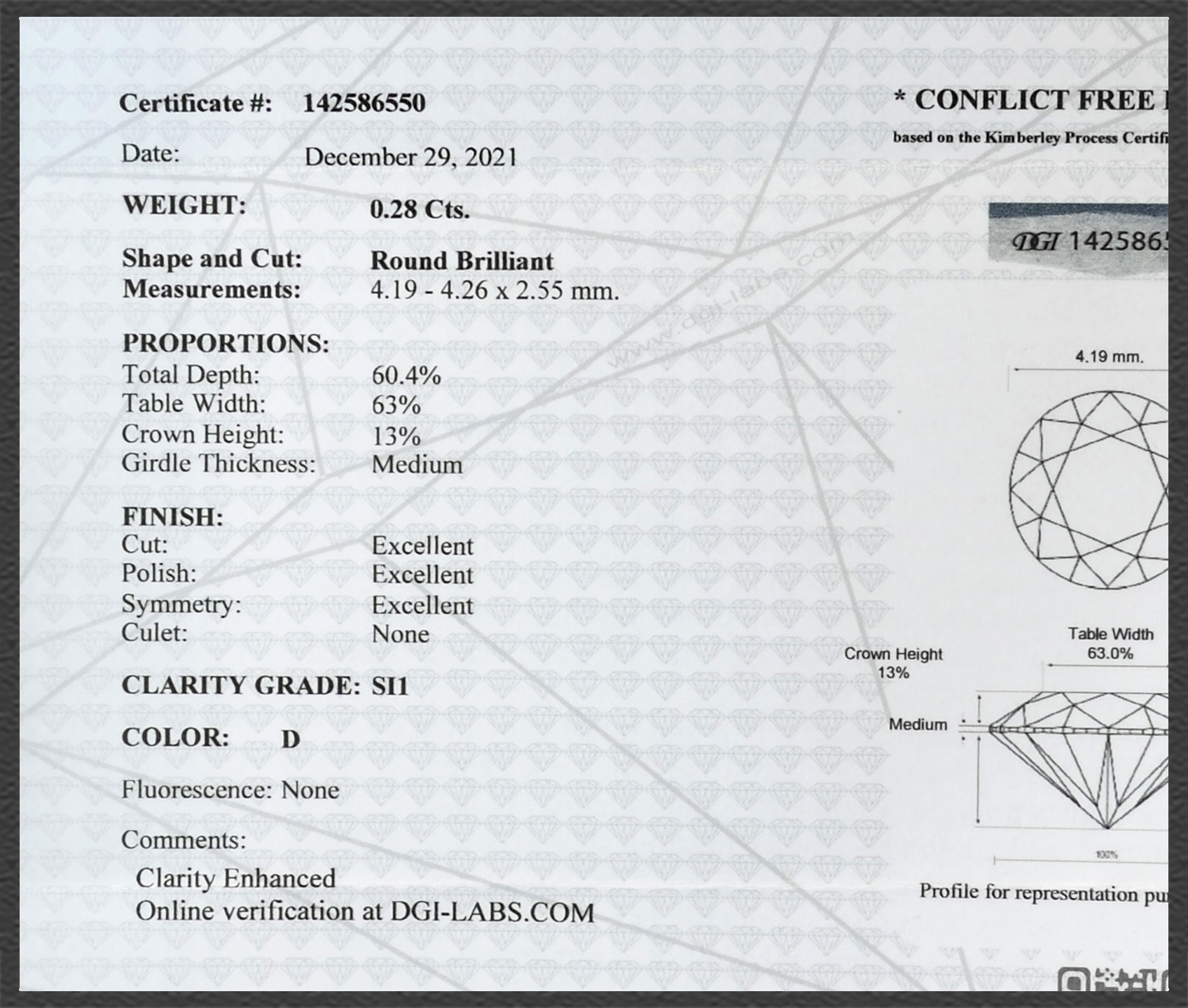 Das originale DGI Zertifikat erhalten Sie dazu. Außerdem hat der Diamant eine laser-markierte Rundiste (mit der Zertifikats Nummer). Absolute Sicherheit für Sie als Käufer!