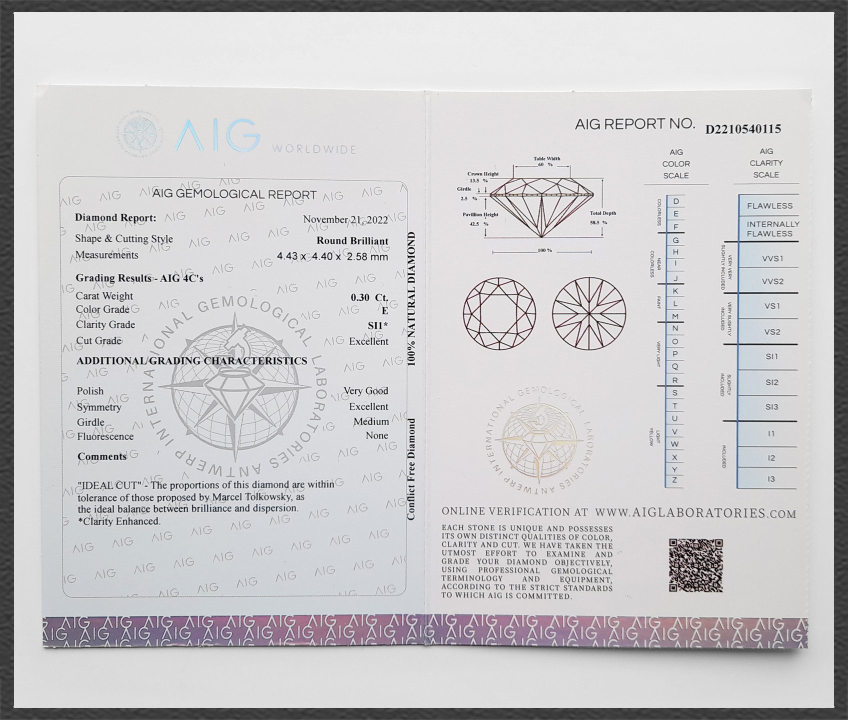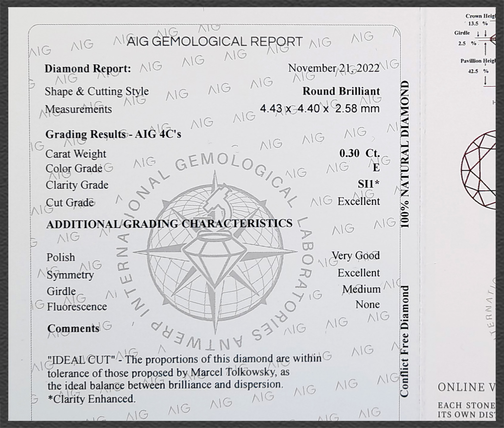 Das originale Diamant Zertifikat des gemmologischen Labors AIG erhalten sie dazu. Absolute Sicherheit für Sie als Käufer!