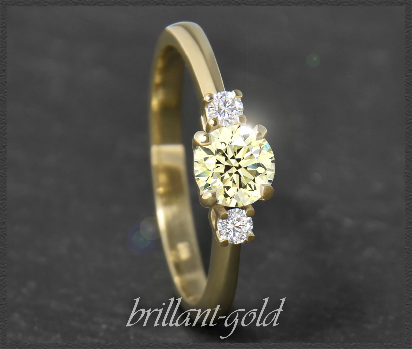 Gefasst ist ein zart gelber 0,54ct Brillant in BESTER Reinheit (Lupenrein), der seitlich von zwei kleinen, ebenfalls lupenreinen Brillanten verziert wird.