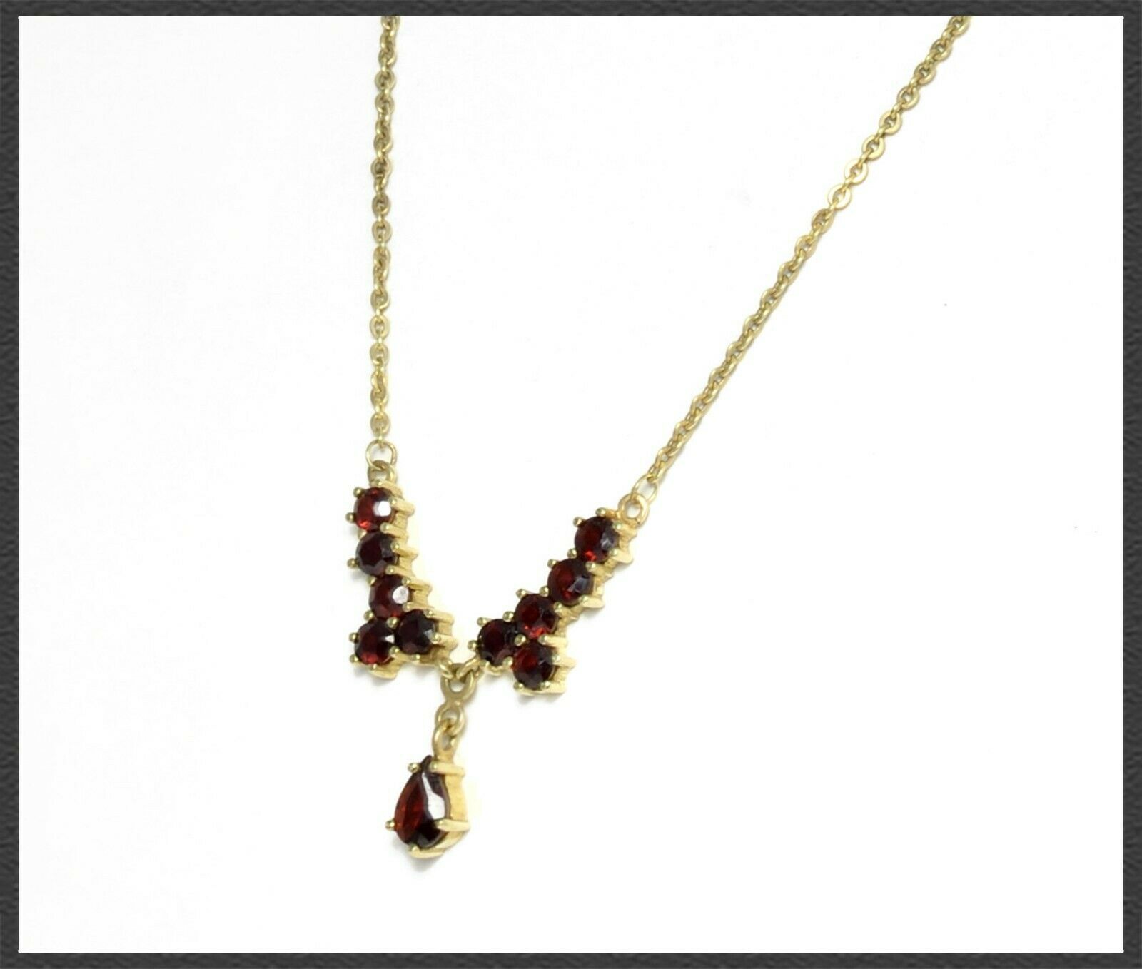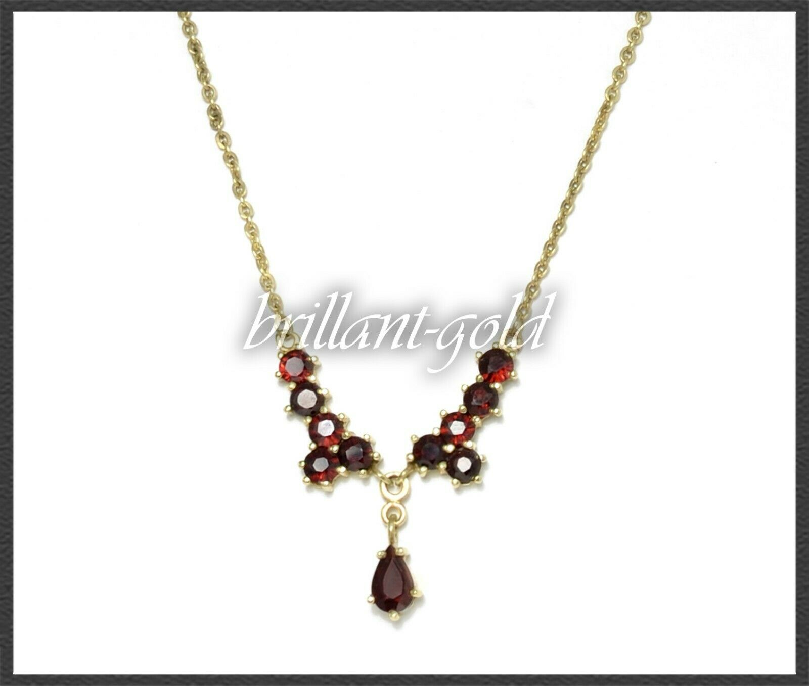 Im Collier eingefasst sind 4ct sehr schöne, intensiv rote Granate im Rundschliff und im Tropfenschliff.