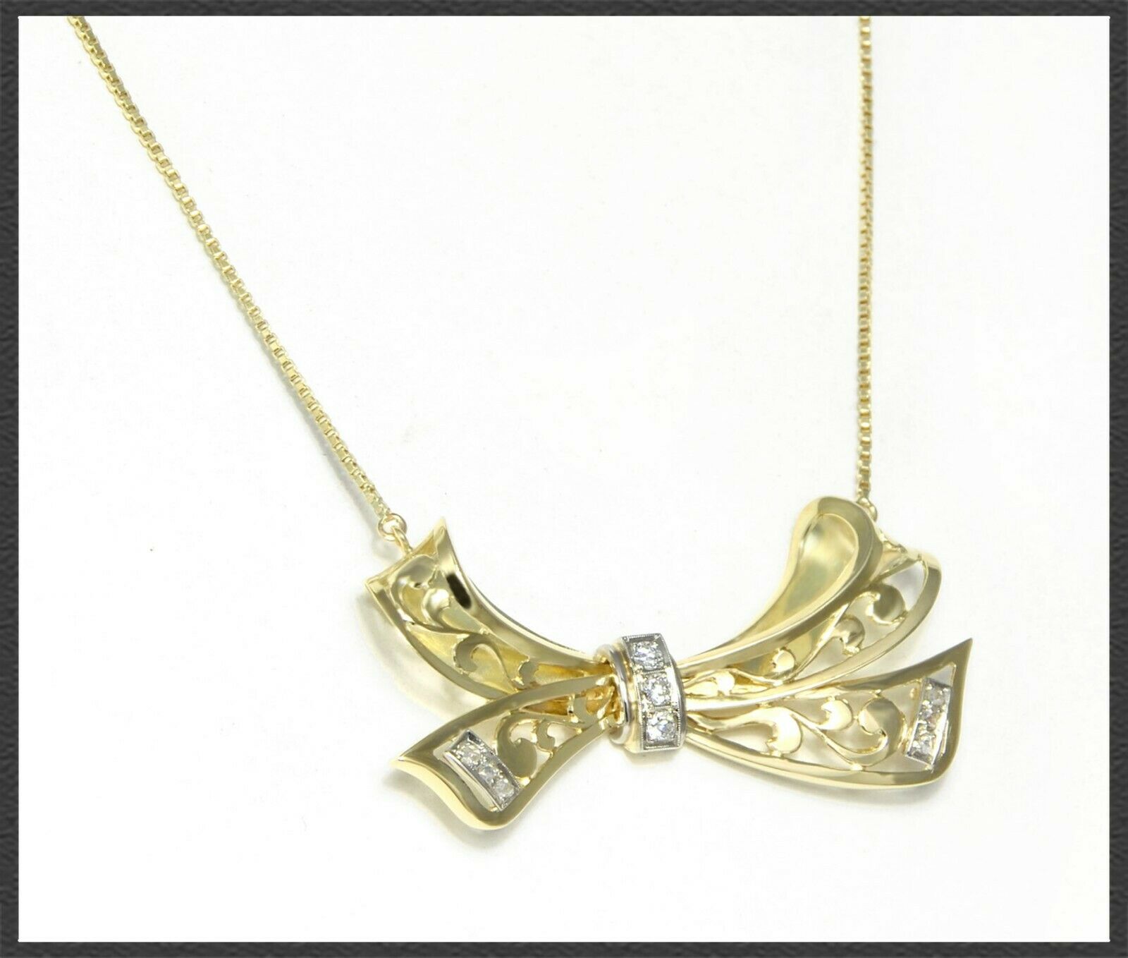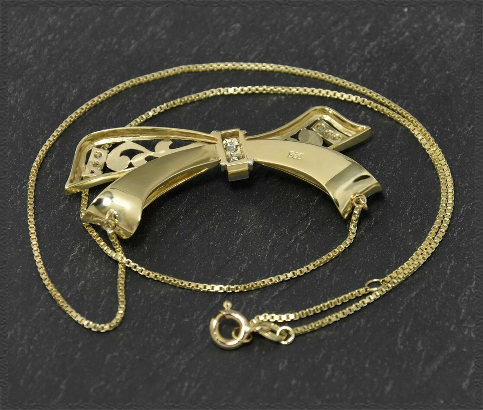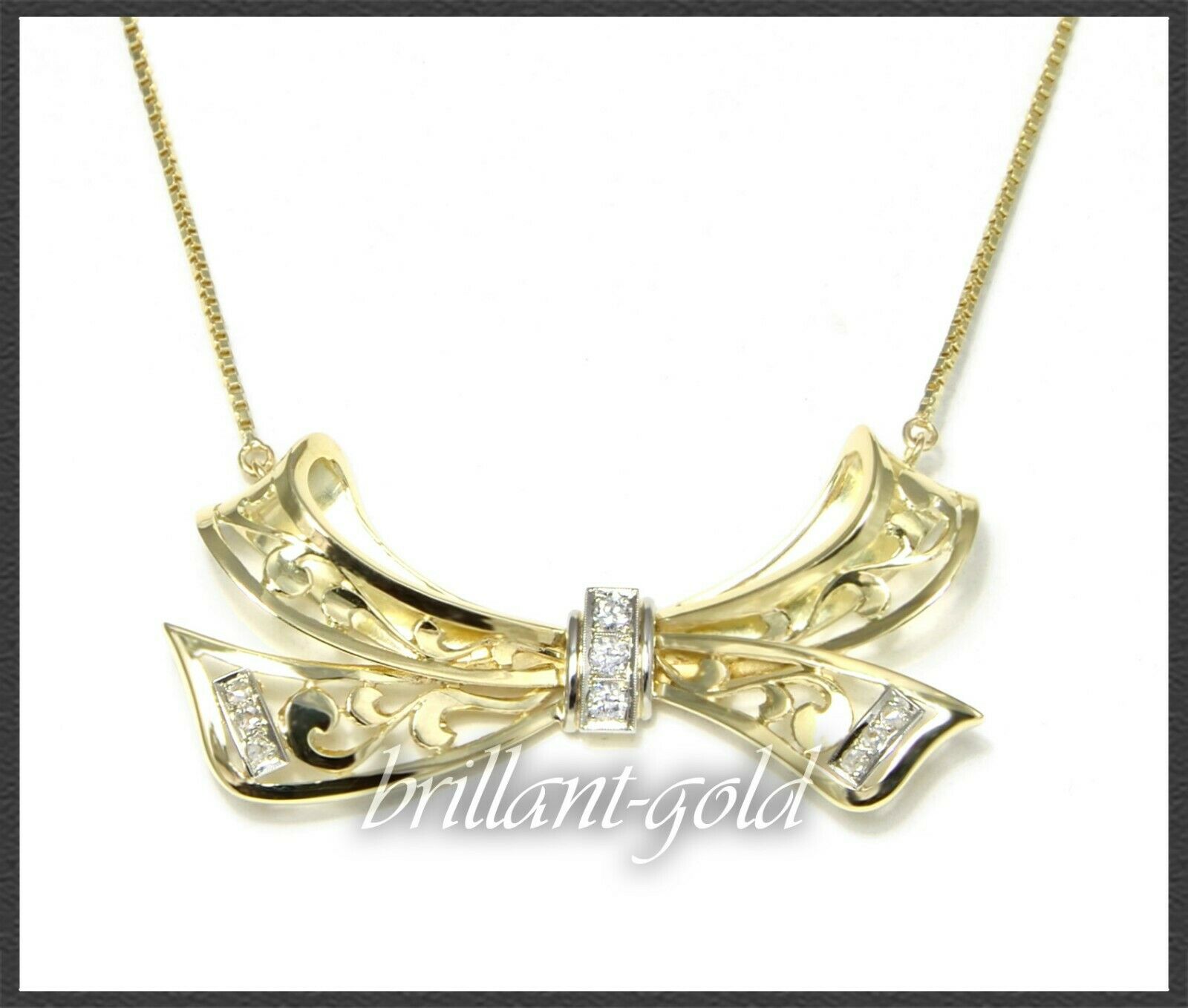 In die Schleife sind filigrane verzierungen eingelötet und in der Mitte und an den Seiten wird das Schmuckstück von zahlreichen Diamanten verziert.