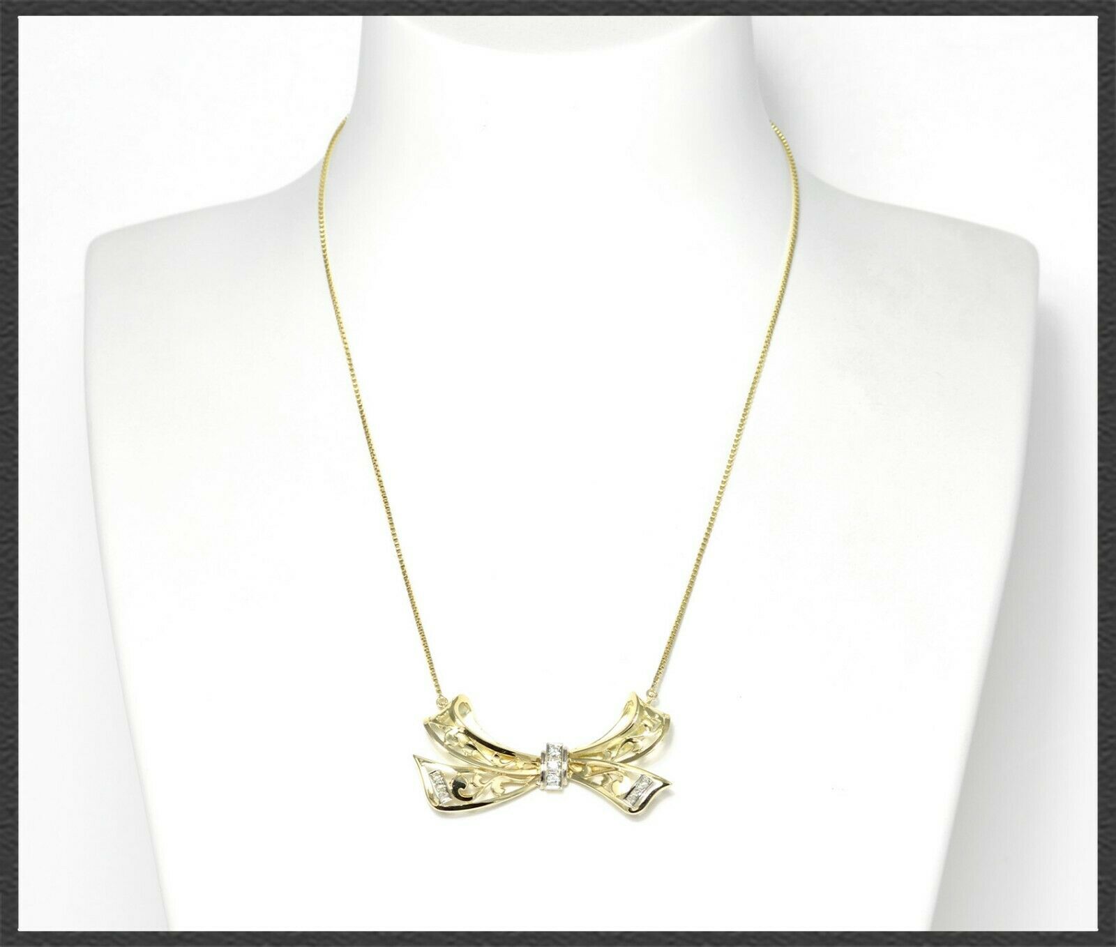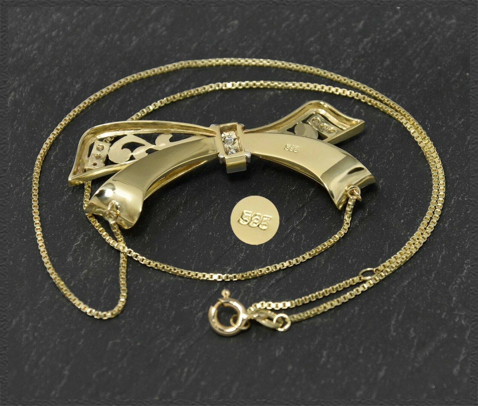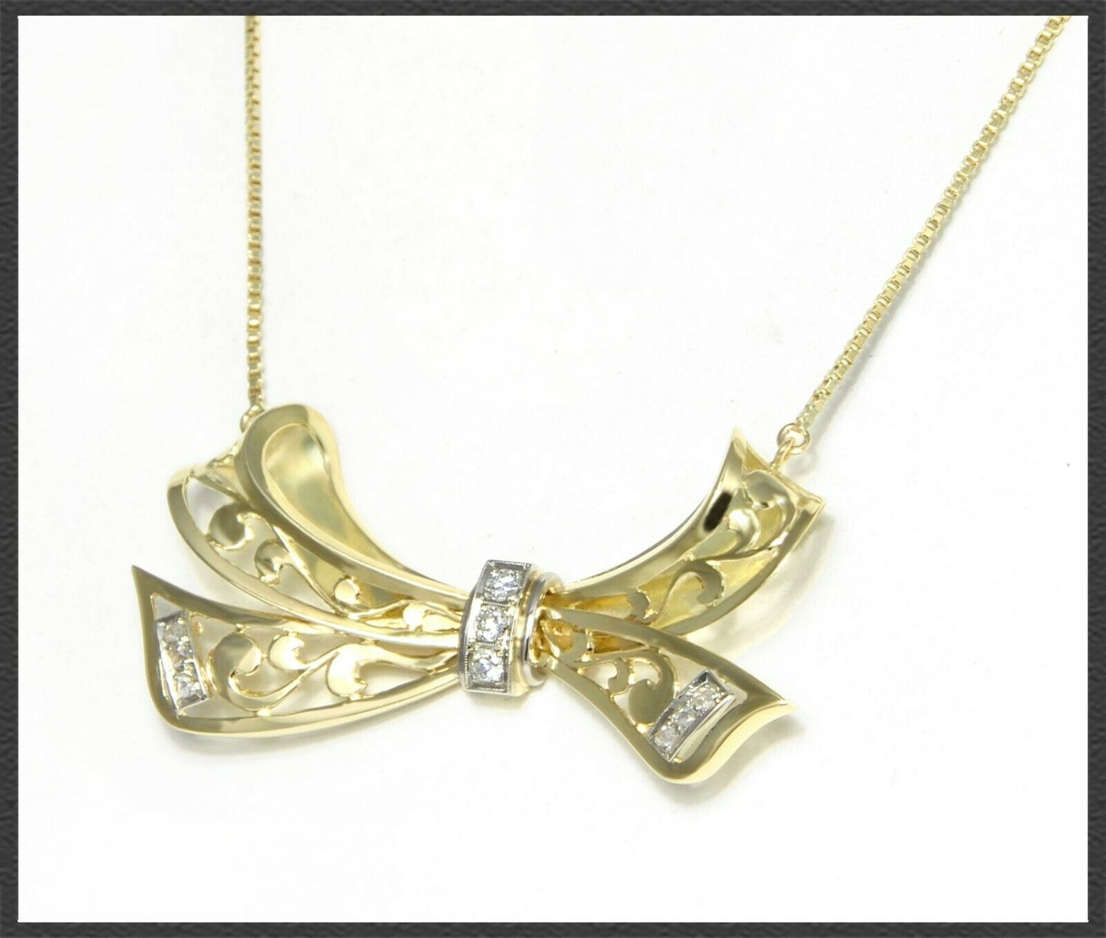In die Schleife sind filigrane verzierungen eingelötet und in der Mitte und an den Seiten wird das Schmuckstück von zahlreichen Diamanten verziert.