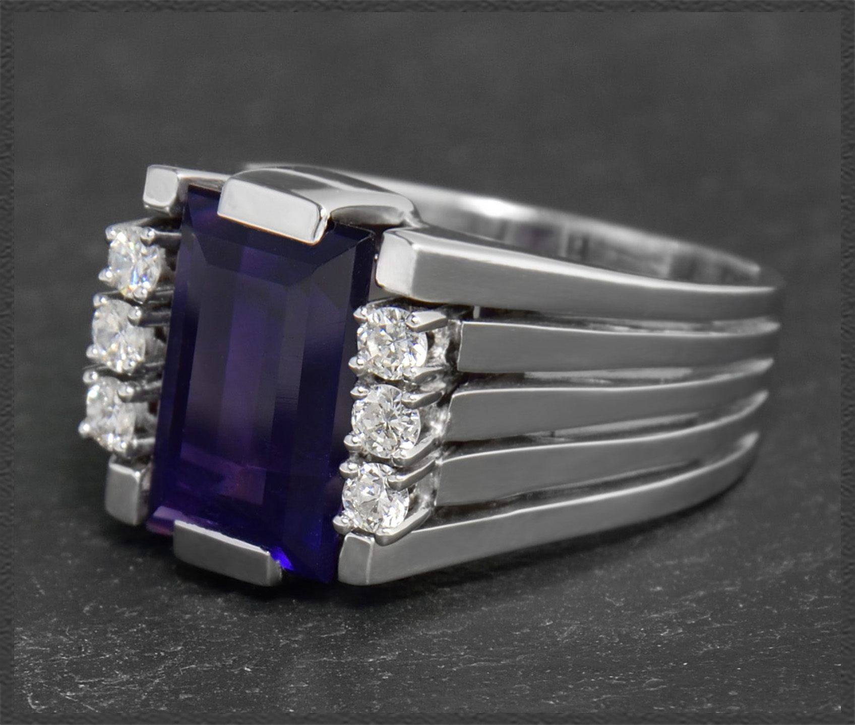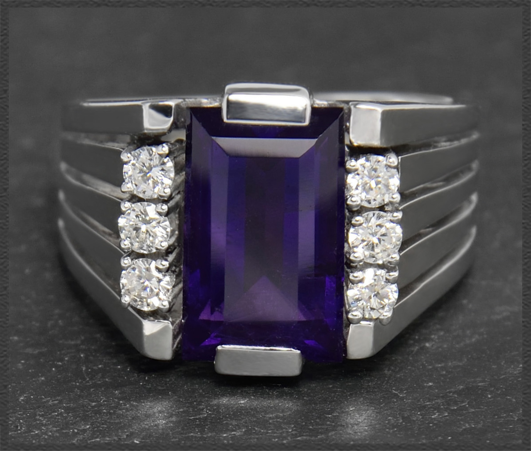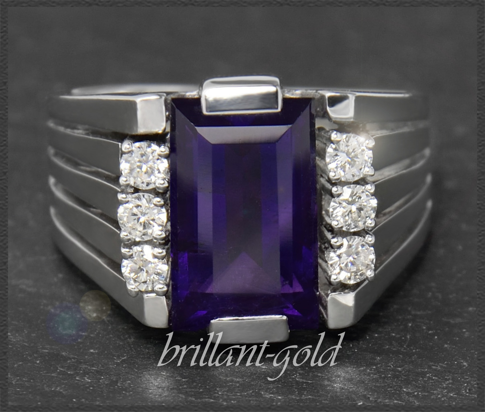 Zentral eingefasst ist ein intensiv violetter Amethyst mit 4ct, der seitlich von zusammen 0,30ct funkelnden Brillanten geschmückt wird.