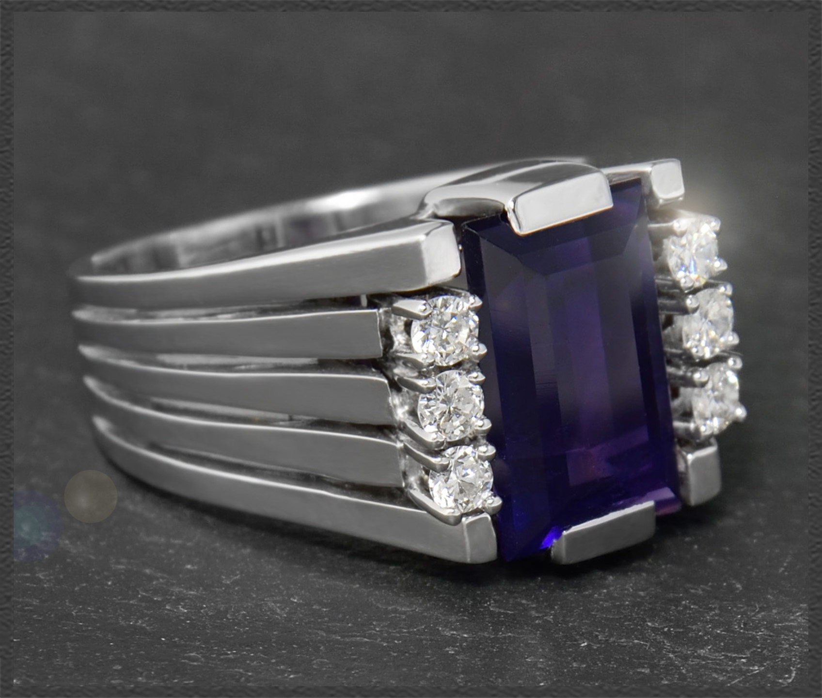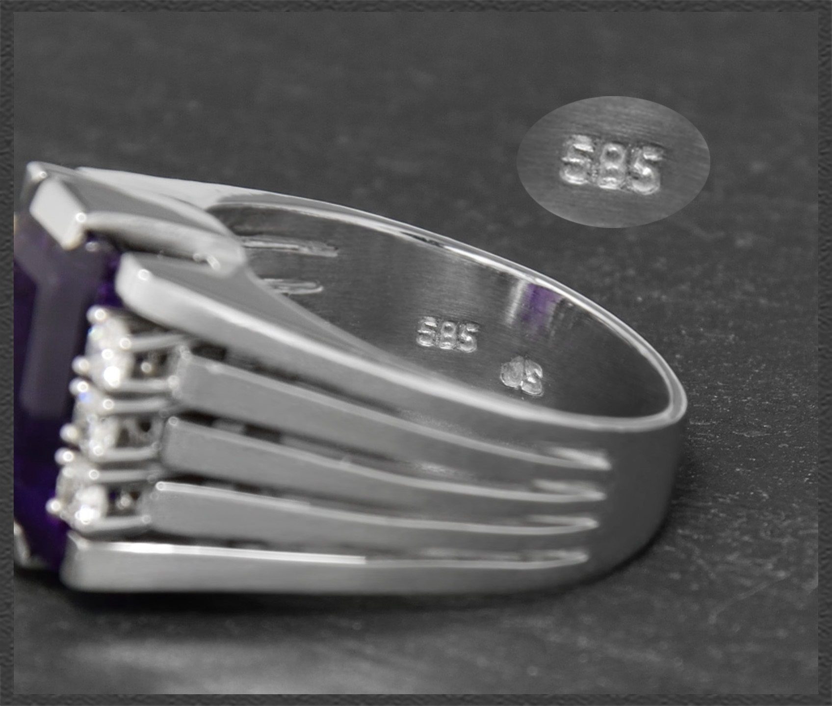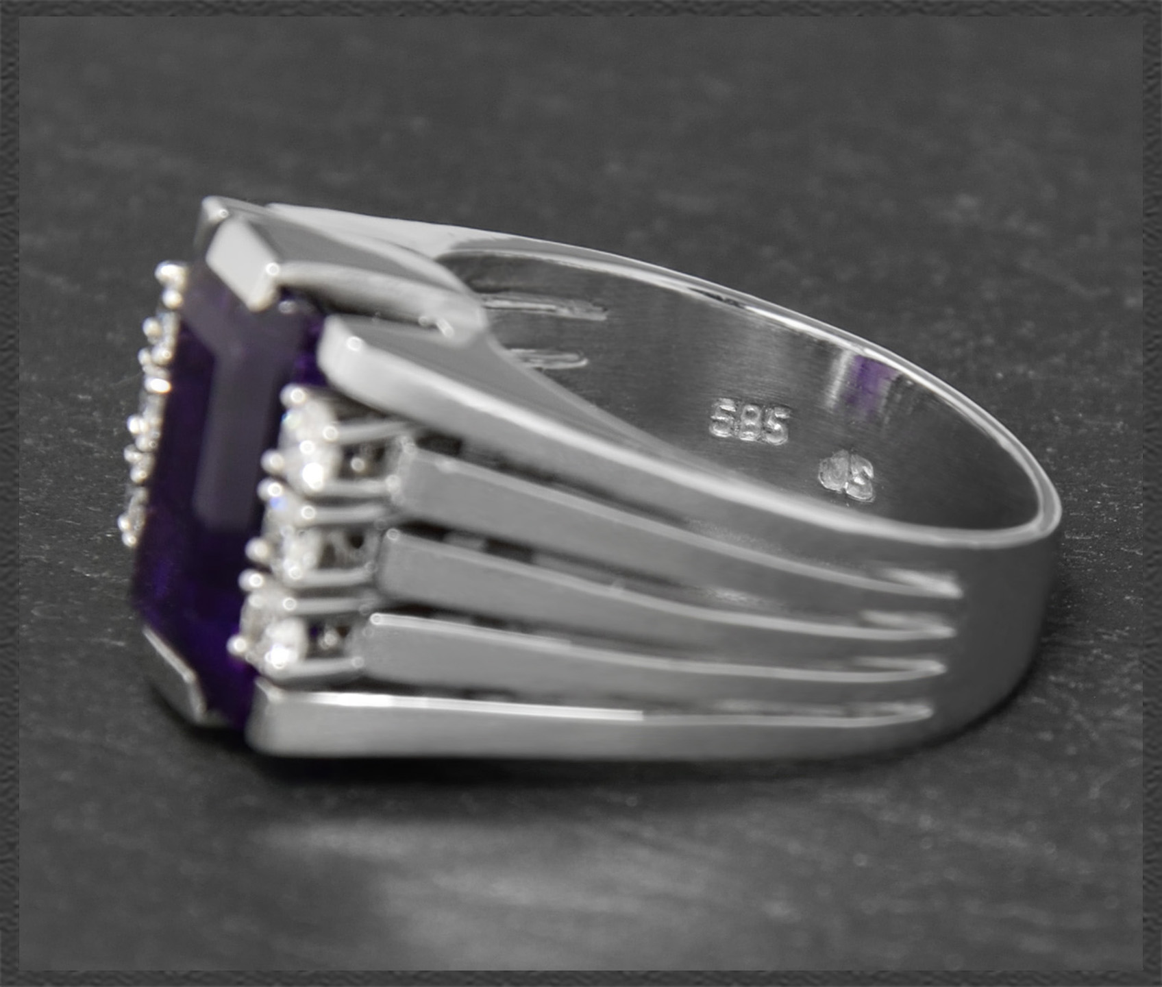 Zentral eingefasst ist ein intensiv violetter Amethyst mit 4ct, der seitlich von zusammen 0,30ct funkelnden Brillanten geschmückt wird.