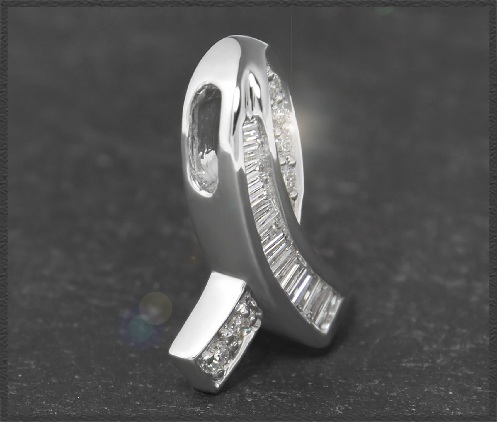 In dem Anhänger sind 0,33ct Baguette-Schliff Diamanten und Brillanten in hervorragender Qualität (Top Wesselton & VVS) eingefasst. Die Diamanten funkeln traumhaft im Licht.