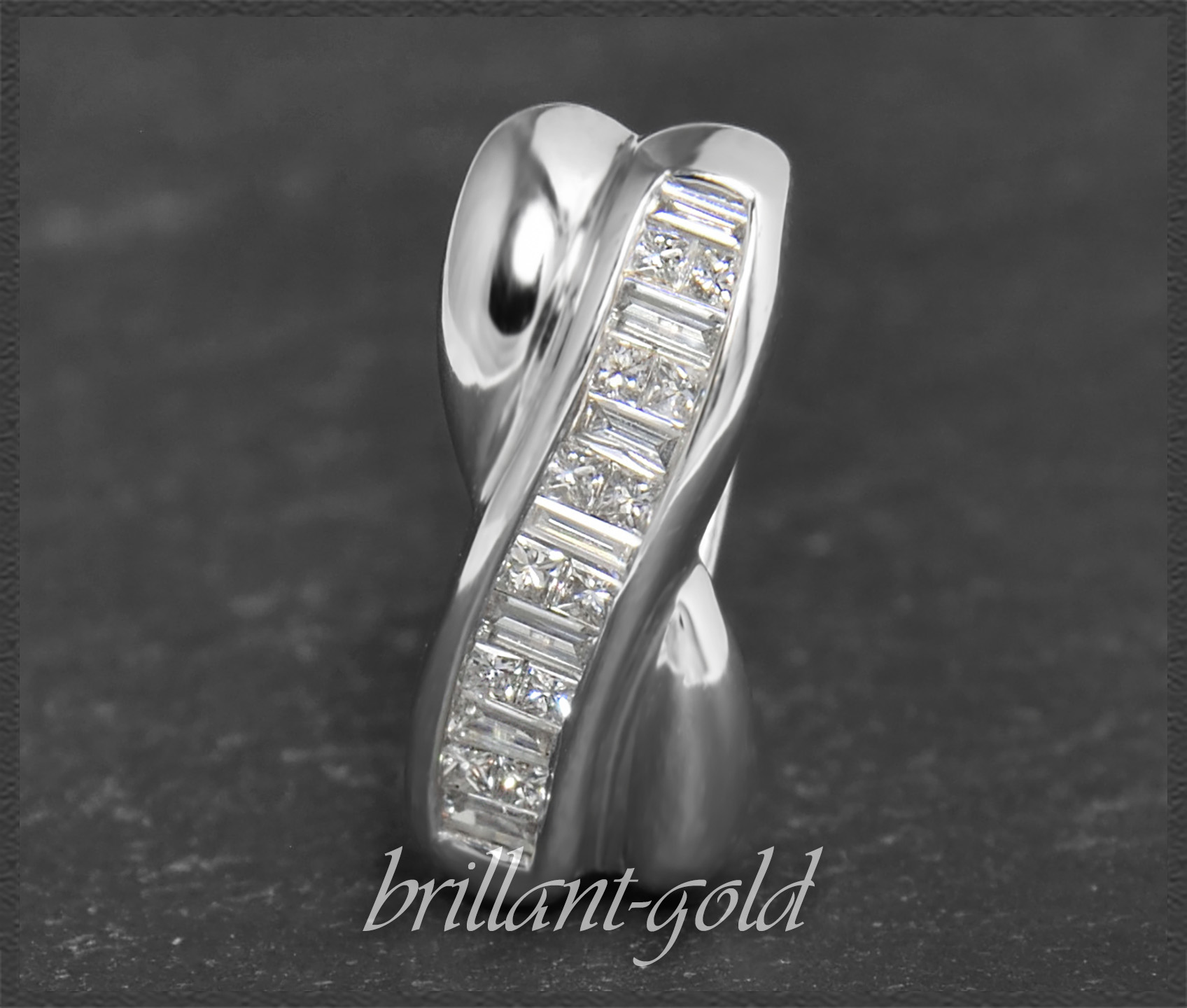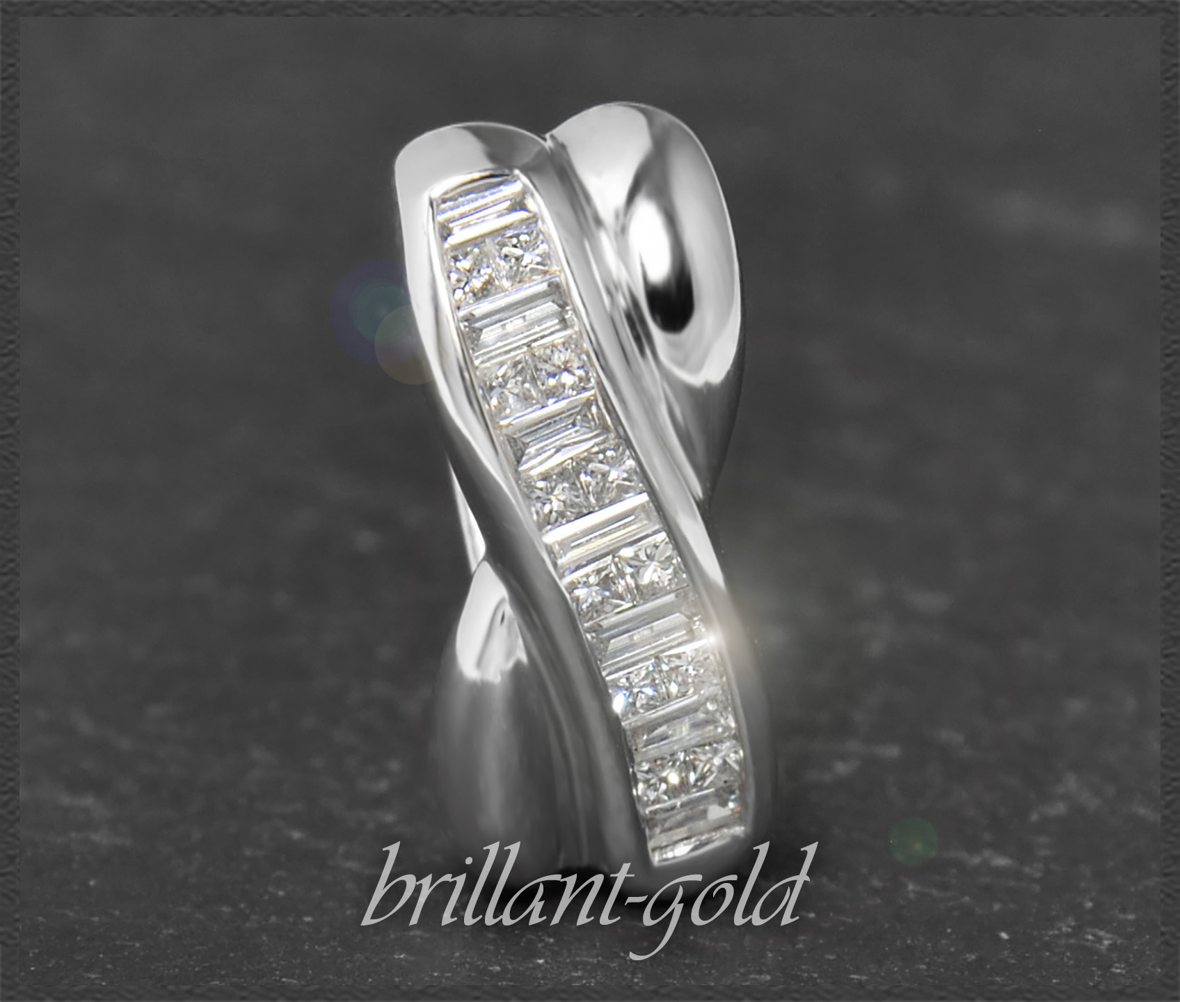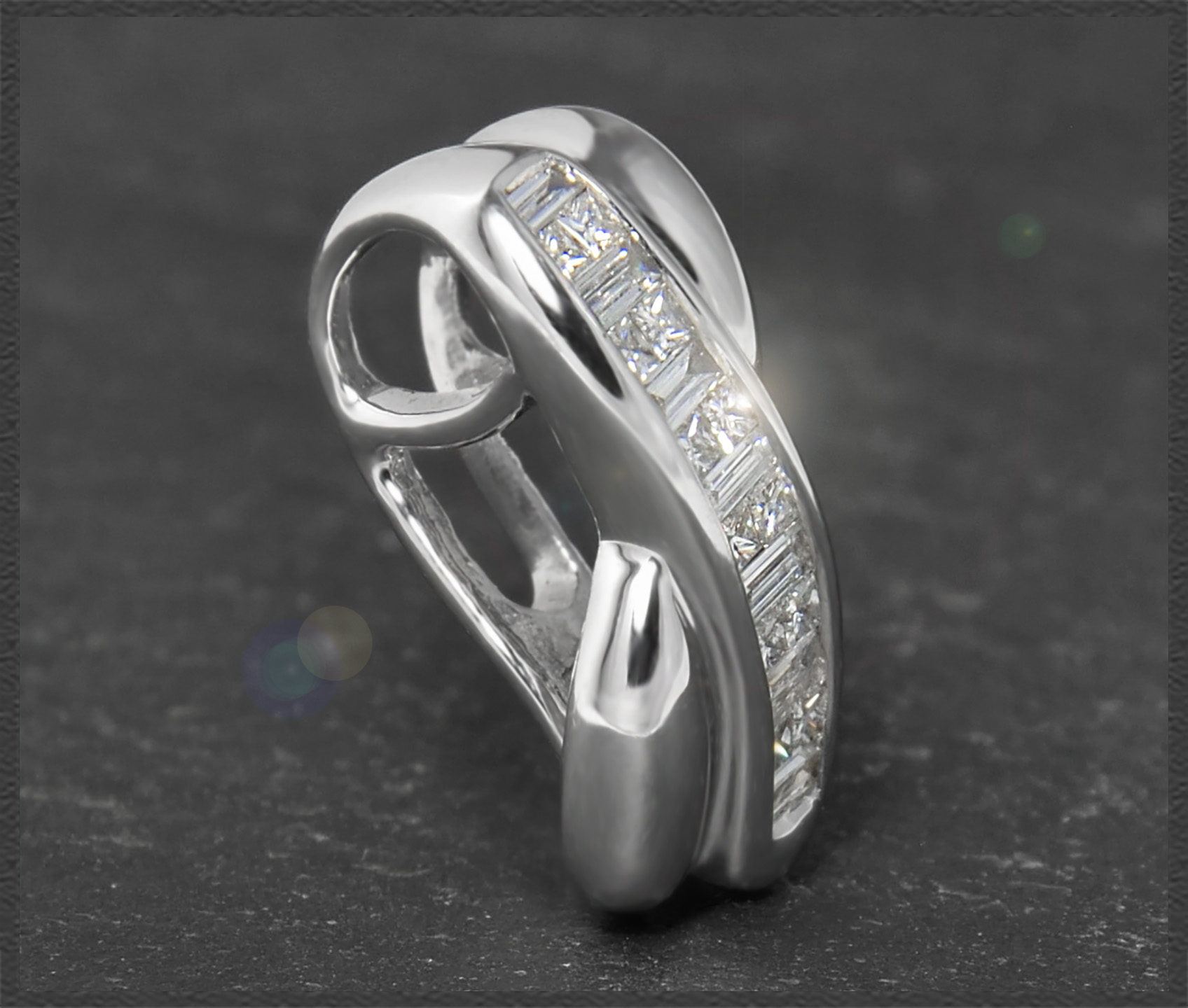 In dem Anhänger sind abwechselnd nebeneinander zwei Diamanten im Prinzess-Schliff und ein Diamant im Baguette-Schliff eingefasst. Die Diamanten haben alle eine hervorragende Qualität (River & VVS-VS) und funkeln traumhaft im Licht.