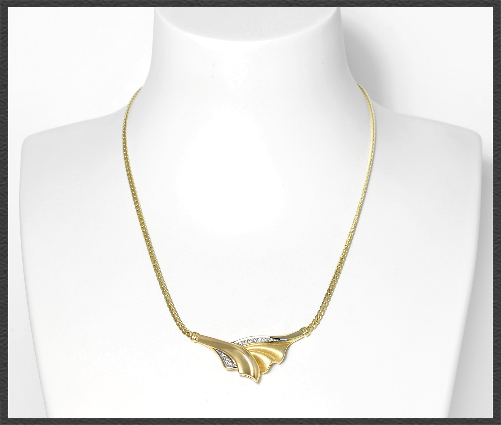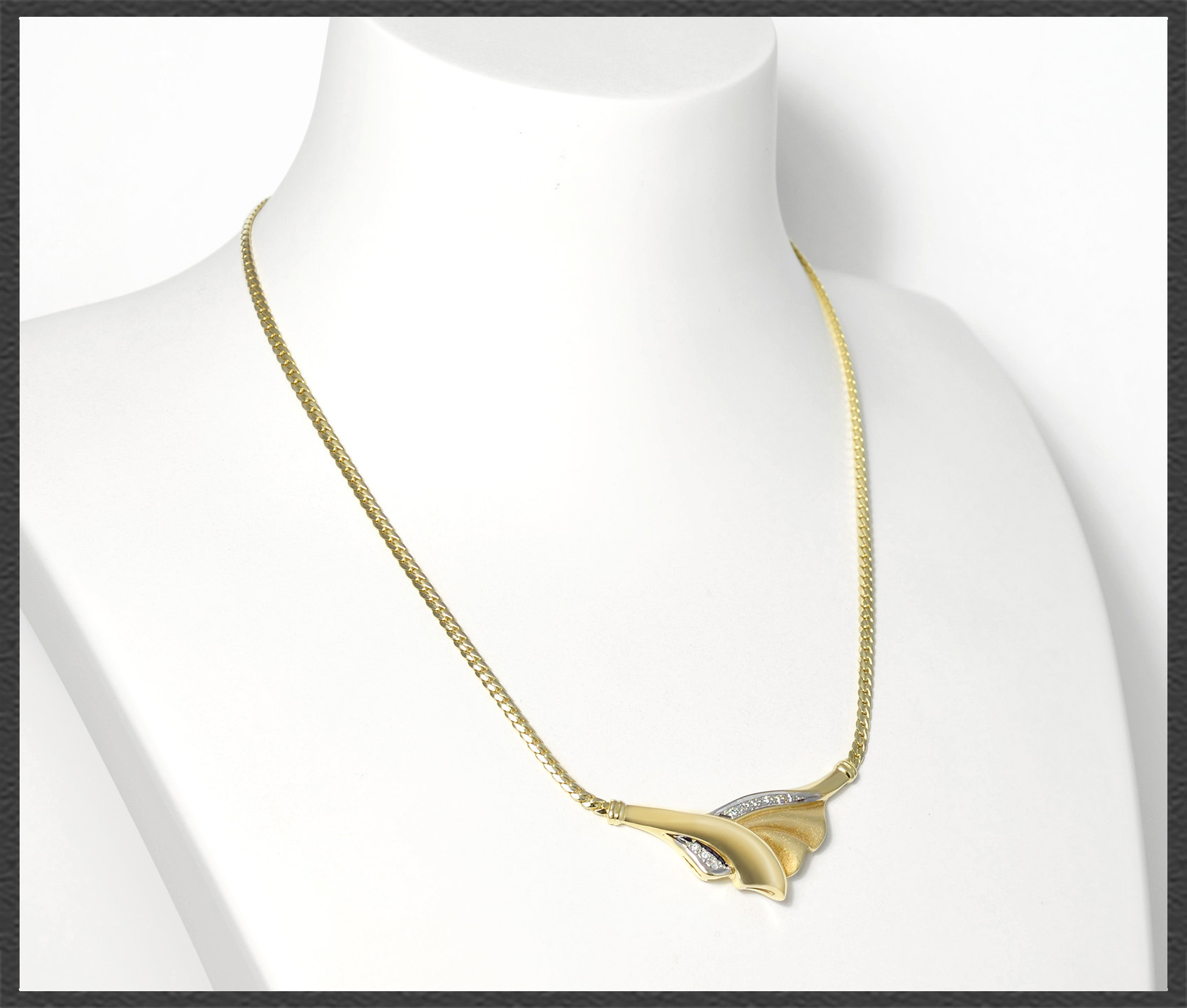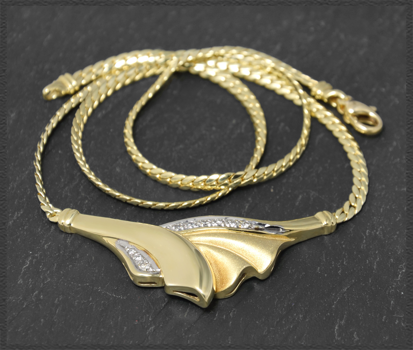 Hergestellt vom Goldschmied (Goldschmied Meisterpunze im Collier) aus massivem 585 Gelbgold (Diamant-Einfassungen aus Weißgold), hochglanzpoliertes Finish.