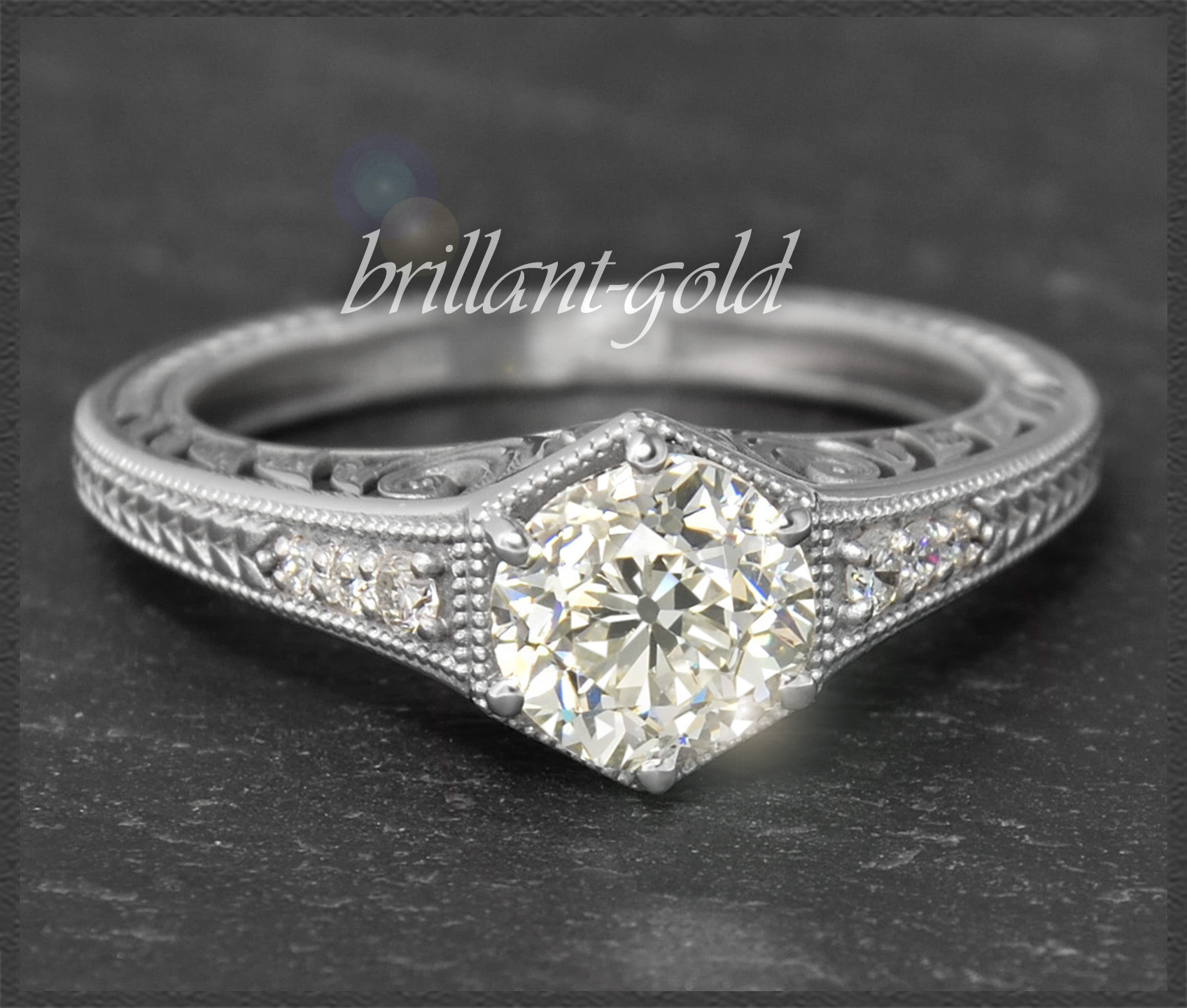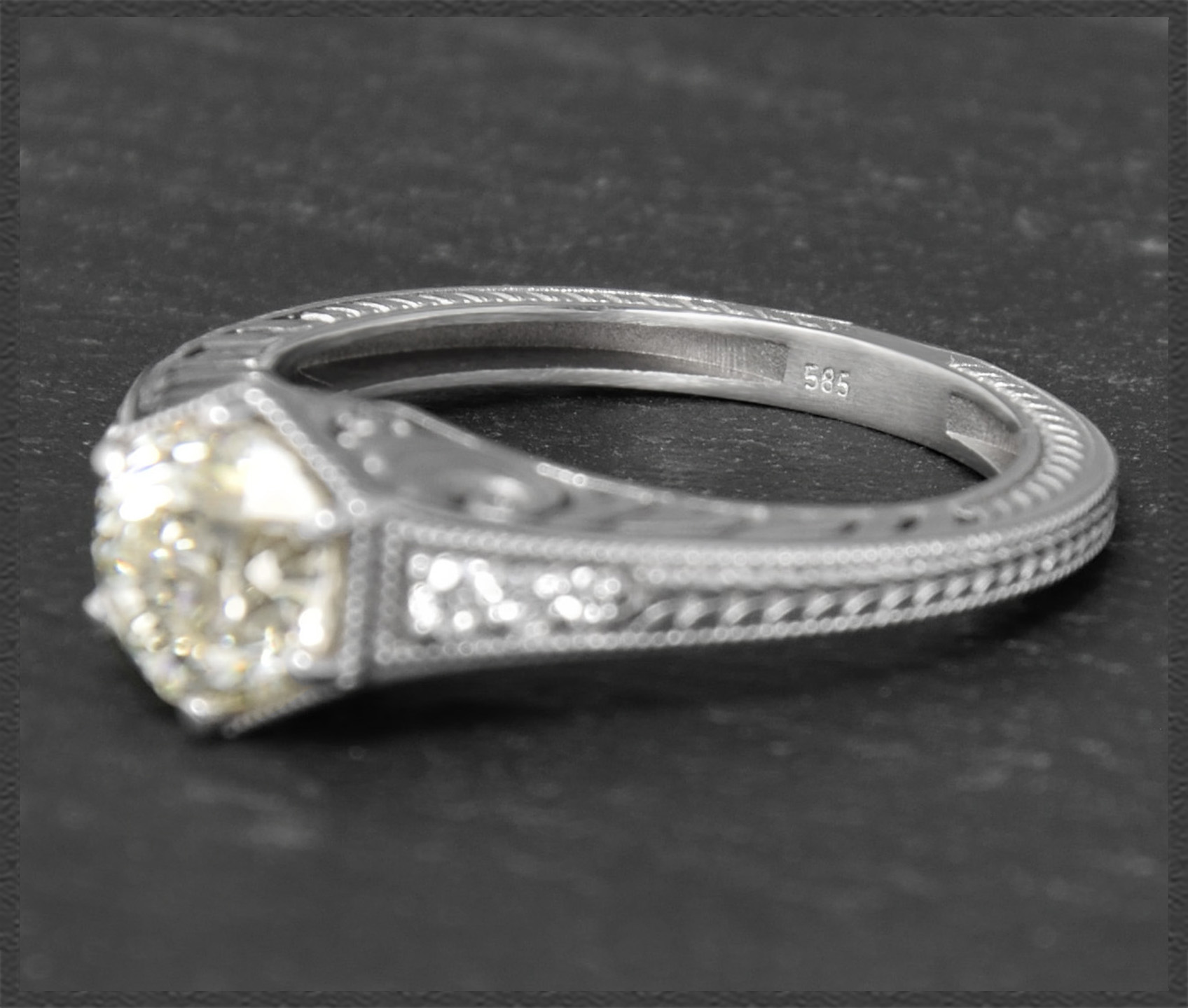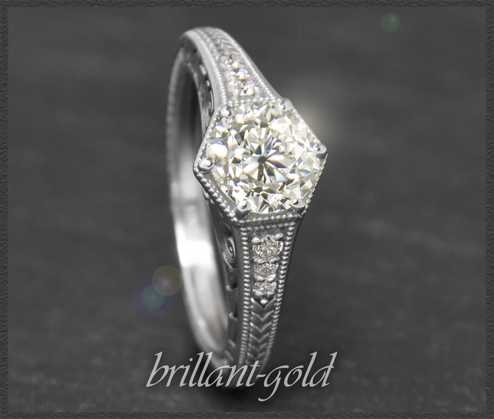 Eleganter 1,44ct Diamant Ring im Jugendstil Design, großer Altschliff Brillant Solitär mit 1,30ct, 6,70mm Durchmesser, sehr guter Schliff & tolle Brillanz.