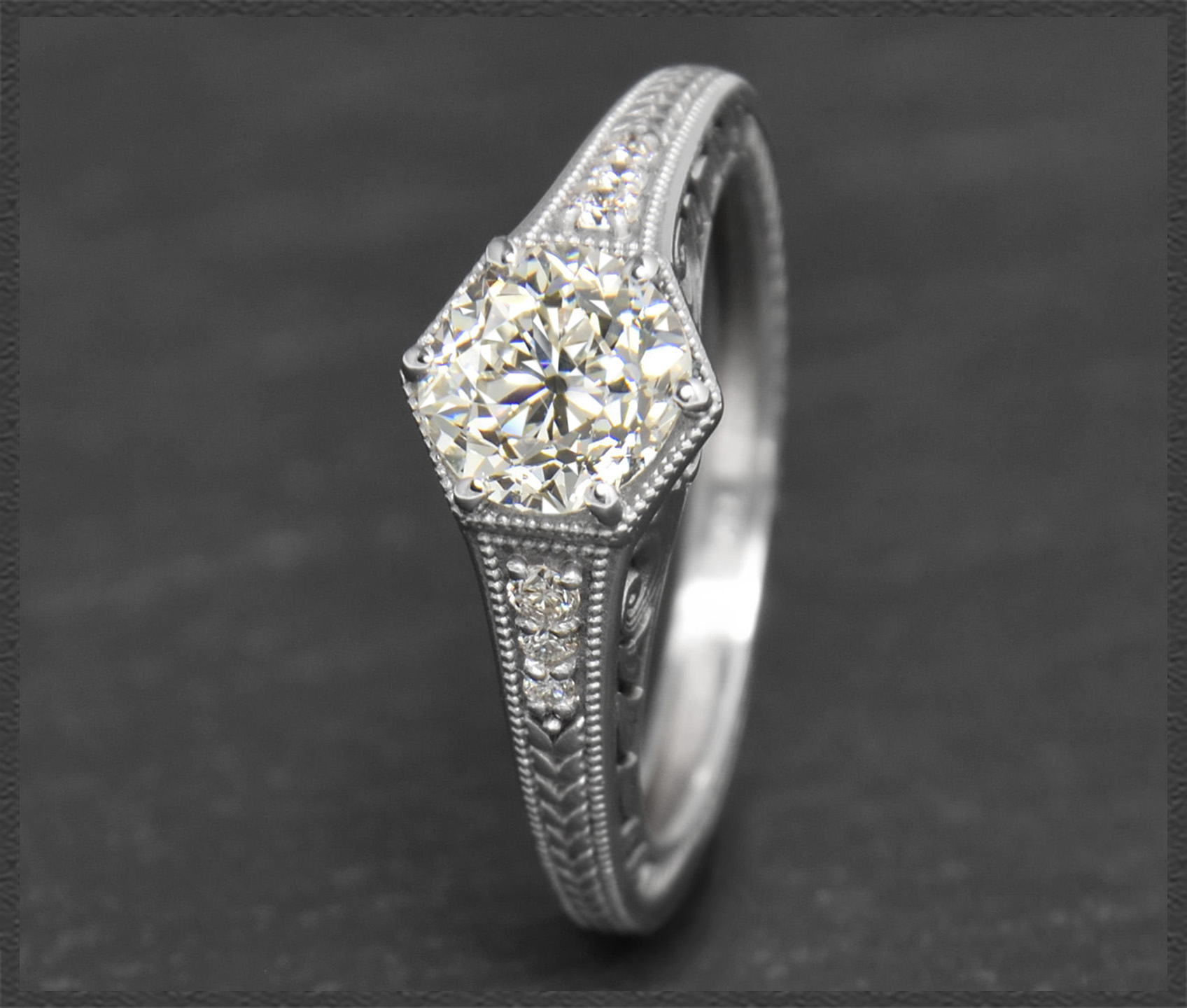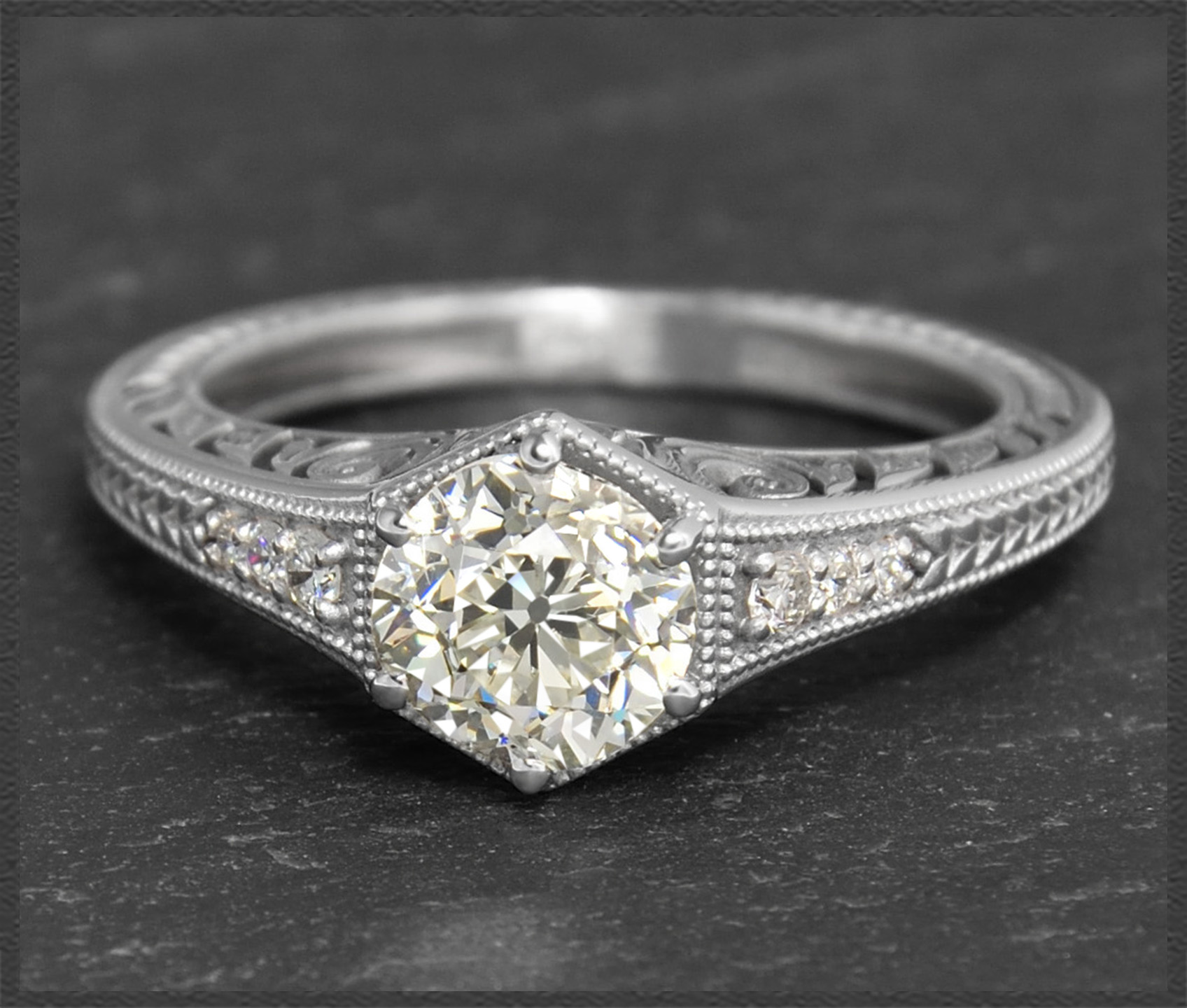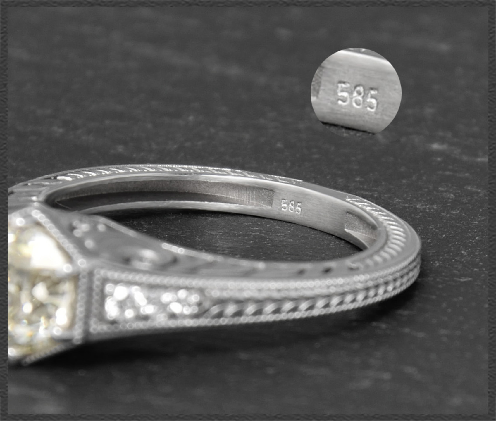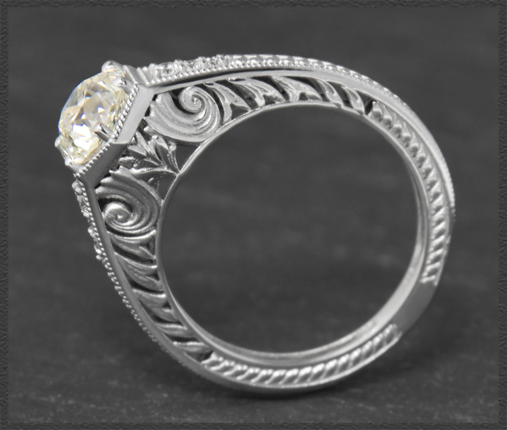 Eleganter 1,44ct Diamant Ring im Jugendstil Design, großer Altschliff Brillant Solitär mit 1,30ct, 6,70mm Durchmesser, sehr guter Schliff & tolle Brillanz.
