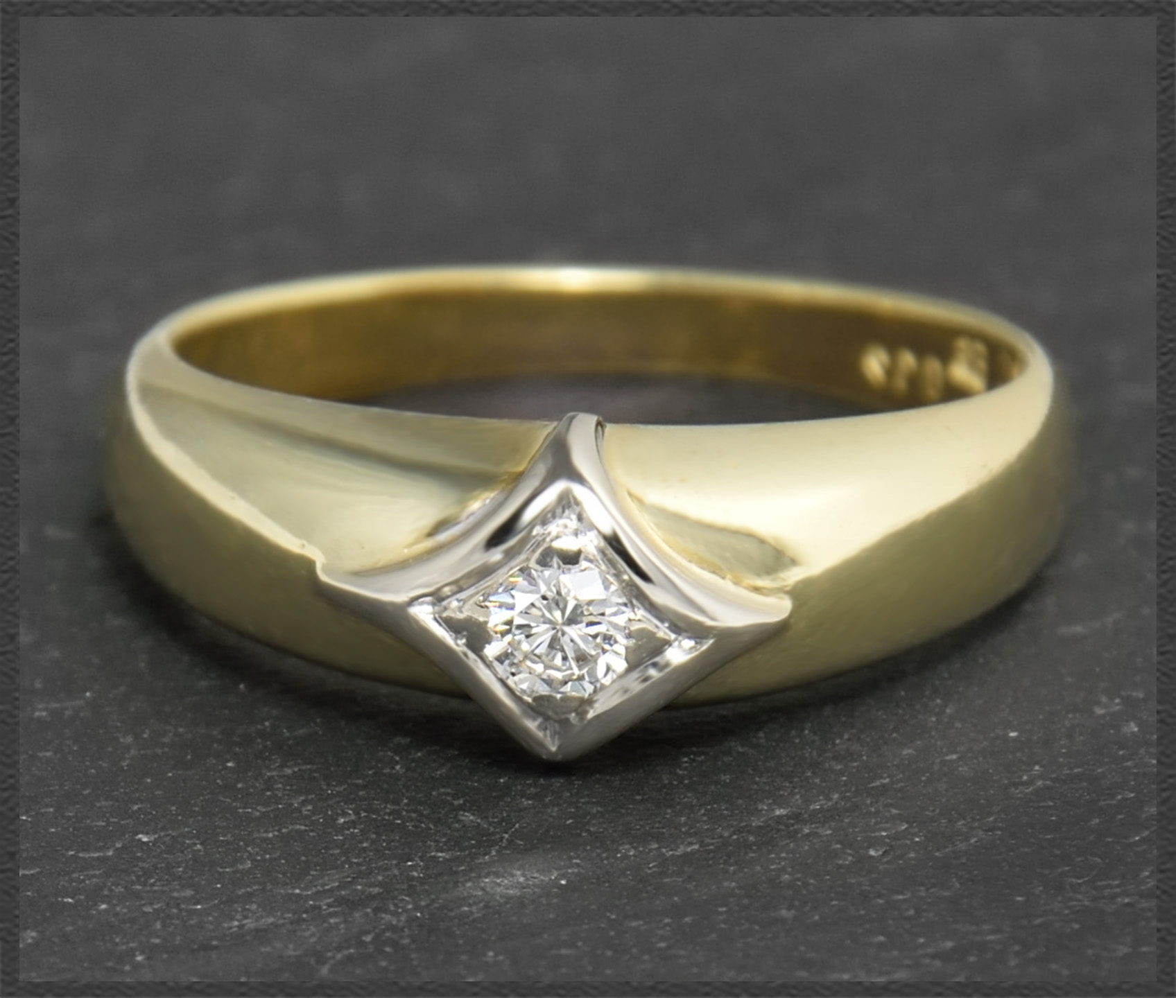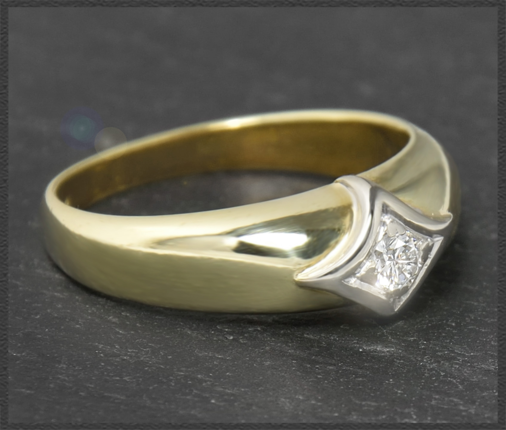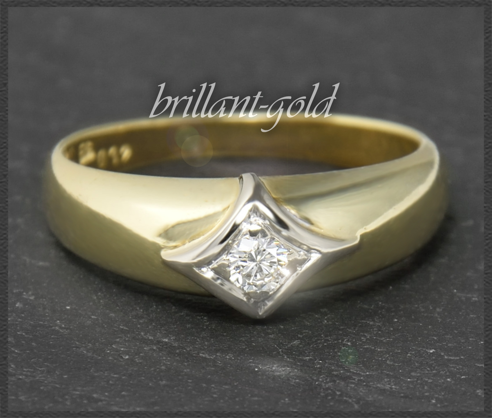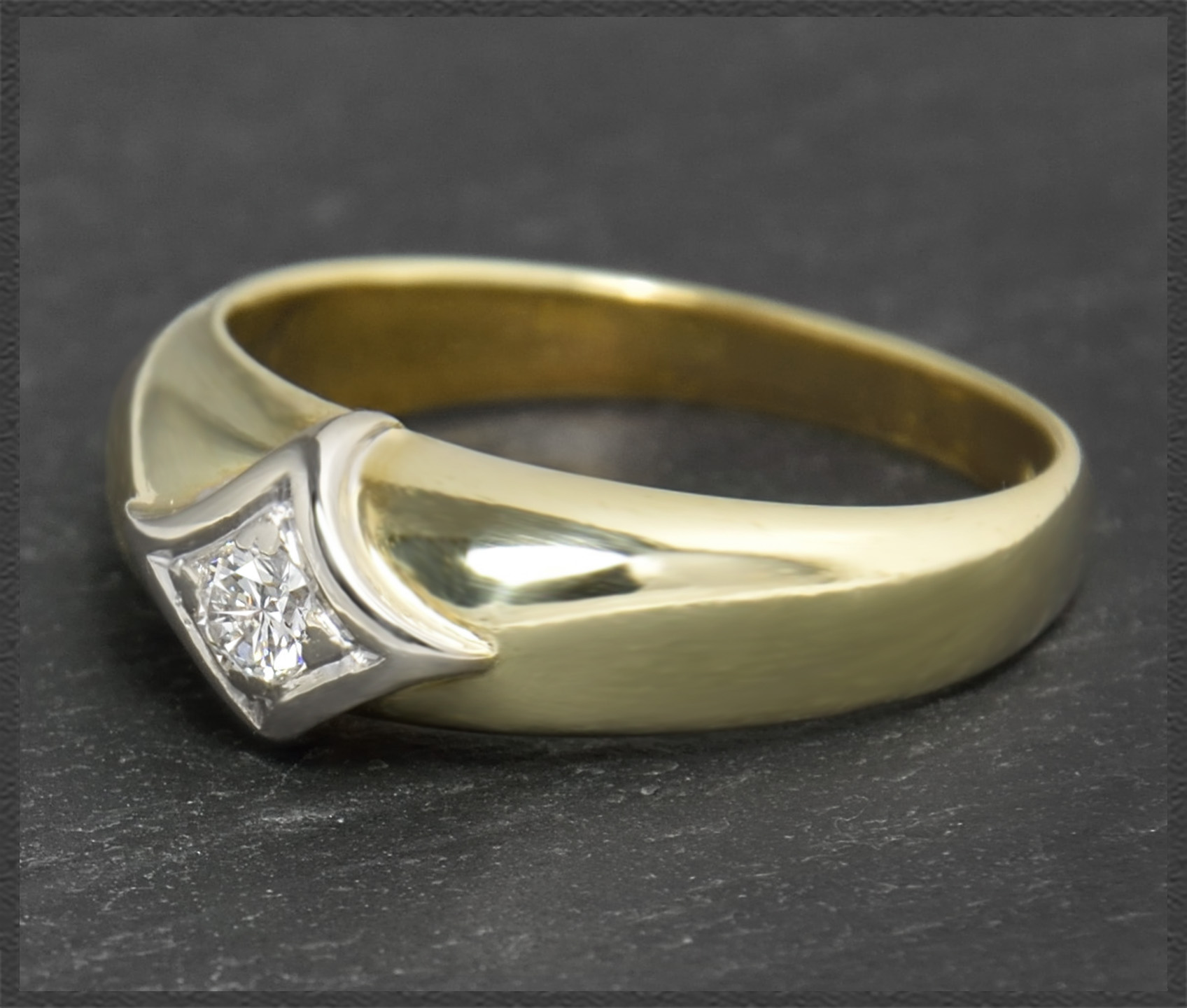 Gefertigt vom Goldschmied Meister in Handarbeit (Meisterpunze im Ring) aus massivem 585 Gelbgold & Weißgold, hochglanzpoliert.