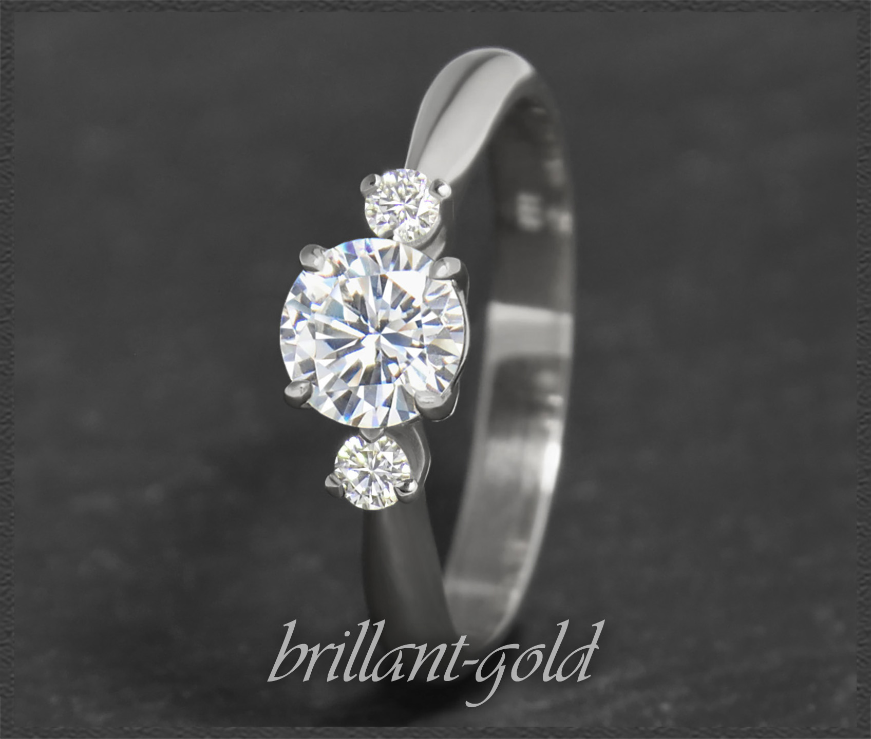 Eingefasst ist ein 0,63ct Brillant Solitär mit exzellentem Brillantschliff, der seitlich von zwei kleinen Brillanten in guter Qualität verziert wird. Die Brillanten funkeln wundervoll im Licht.