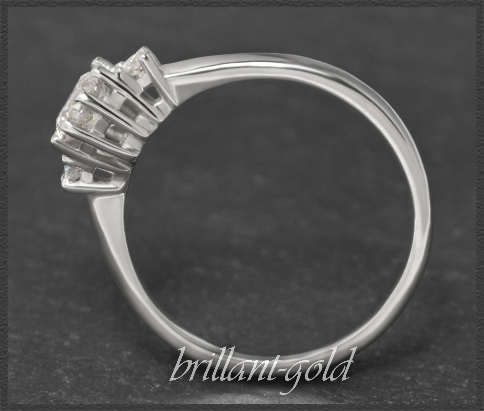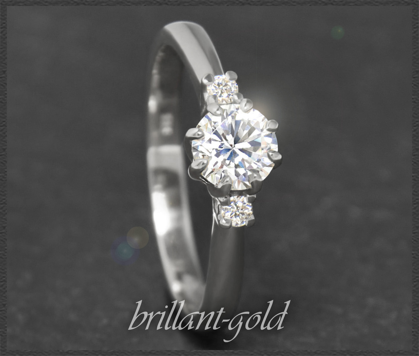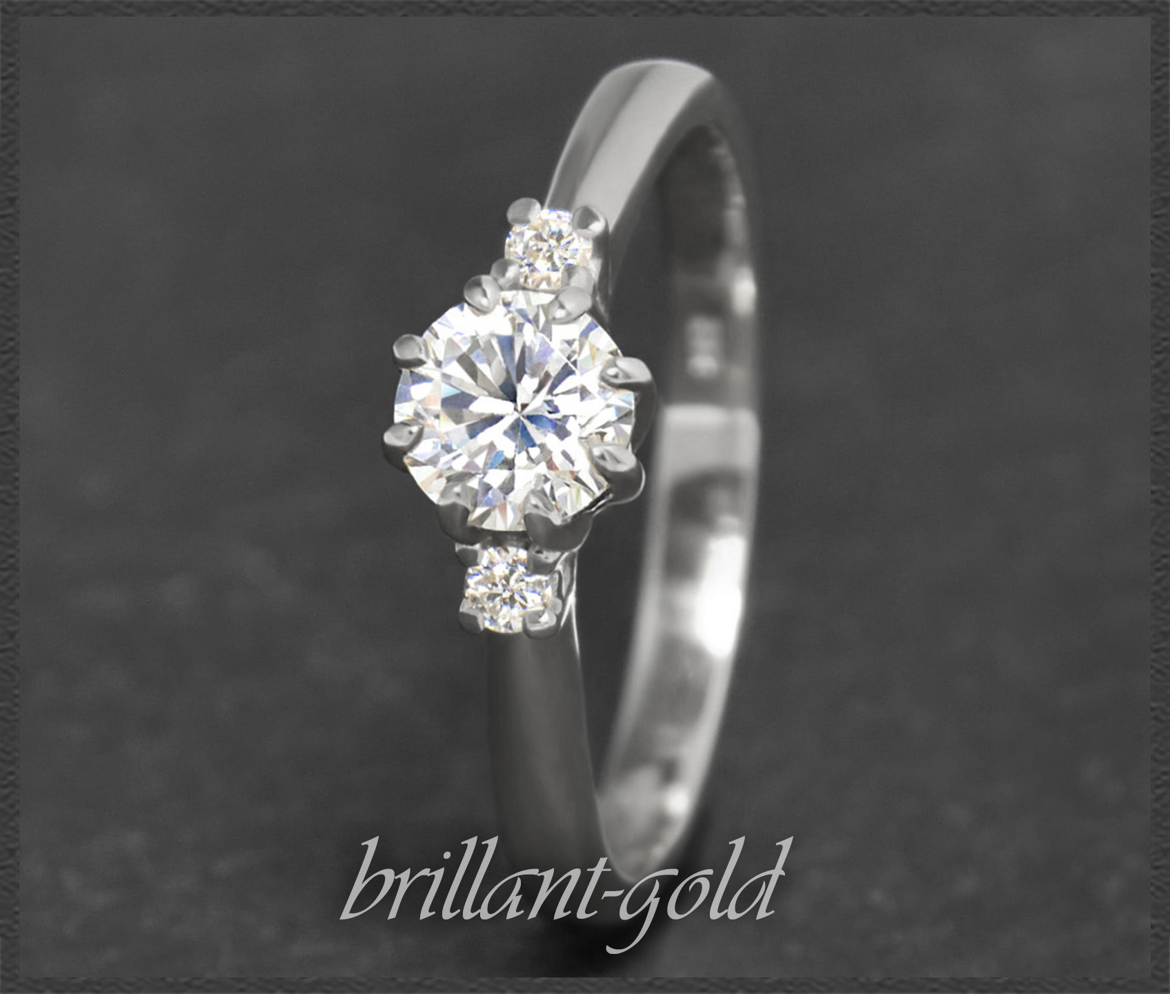 Als Solitär gefasst wurde ein 0,60ct Brillant in hervorragender Qualität (River E & VVS2), der seitlich von zwei kleinen Brillanten in TOP Qualität verziert wird. Die Brillanten funkeln fantastisch im Licht.