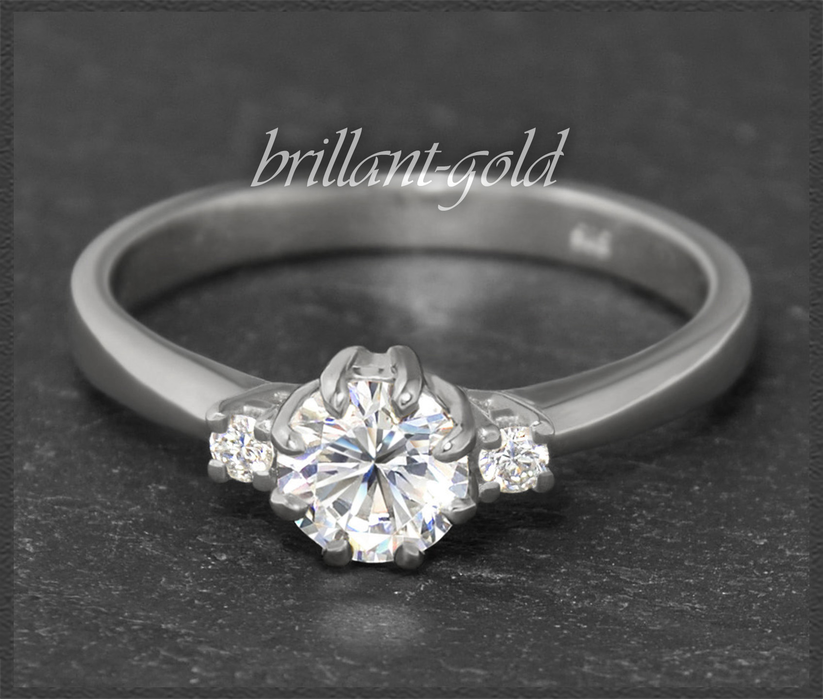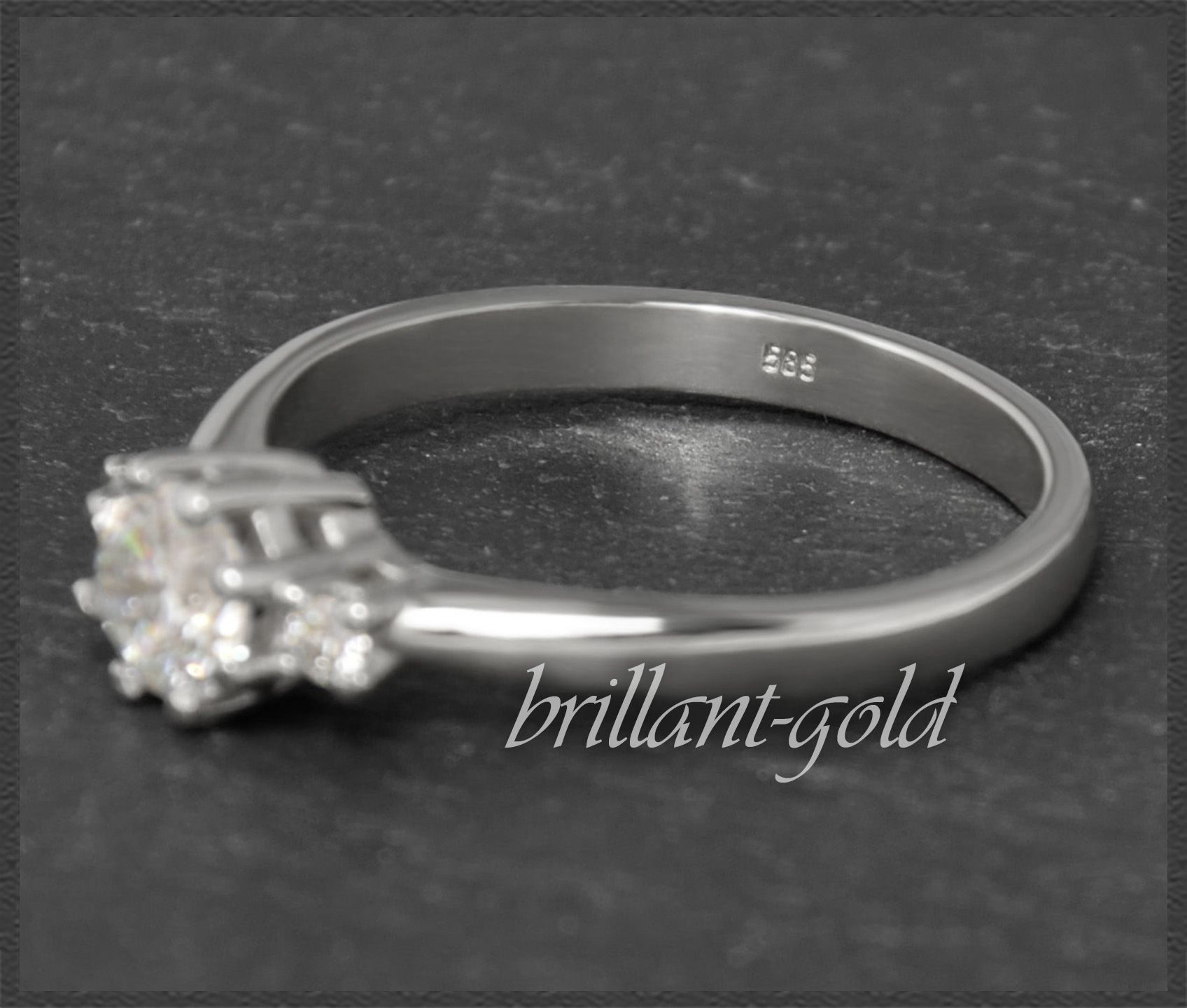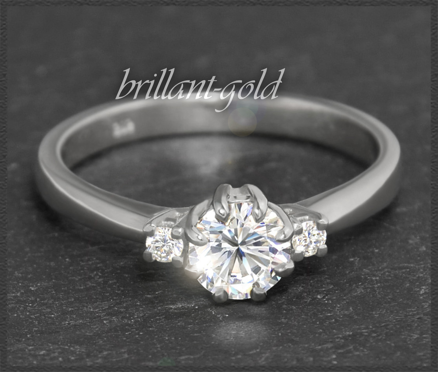 Als Solitär gefasst wurde ein 0,60ct Brillant in hervorragender Qualität (River E & VVS2), der seitlich von zwei kleinen Brillanten in TOP Qualität verziert wird. Die Brillanten funkeln fantastisch im Licht.