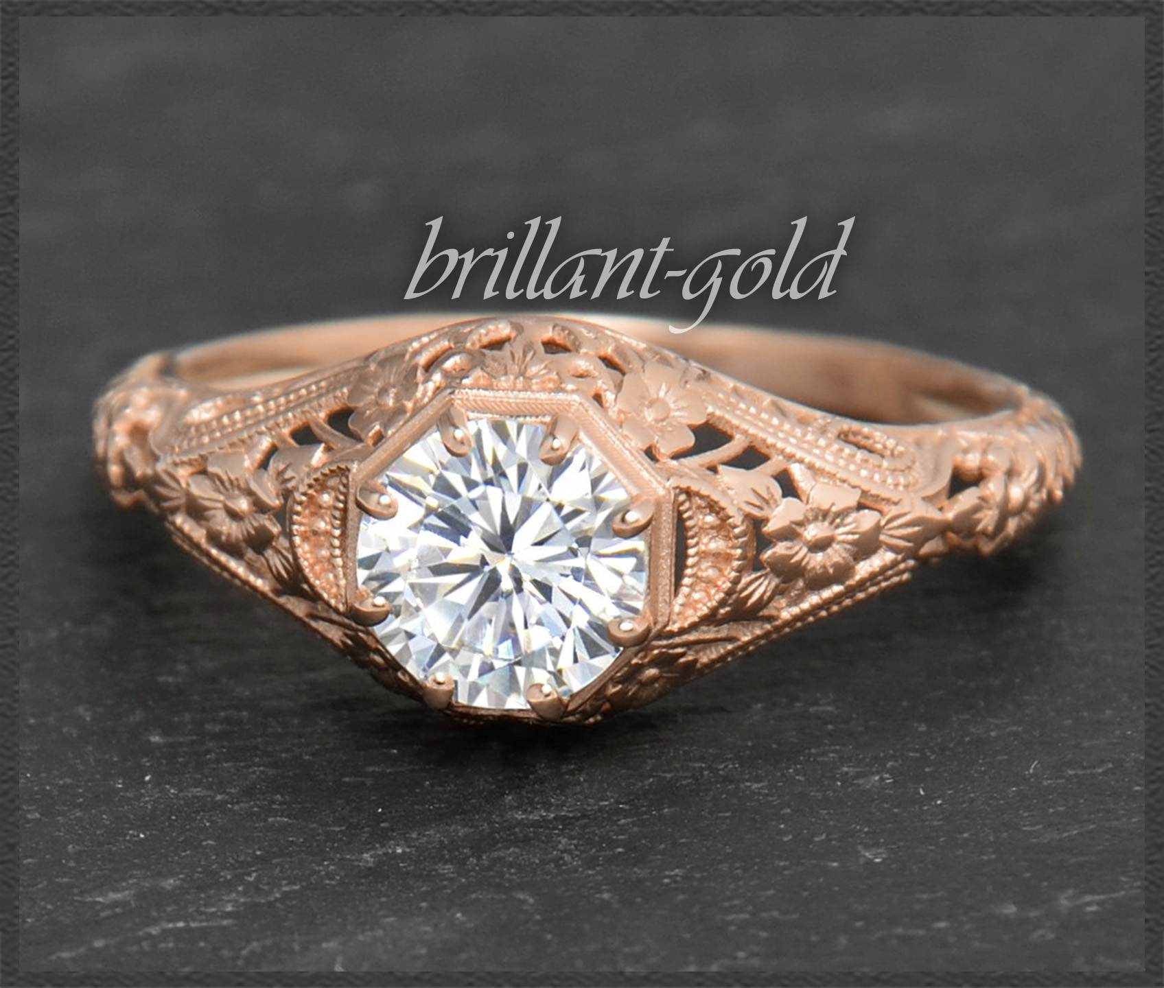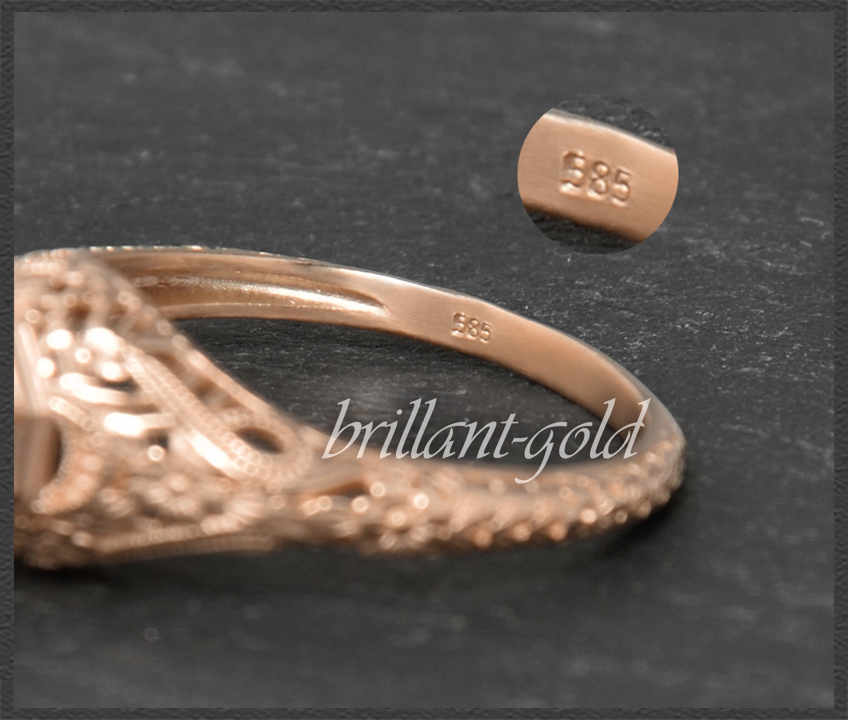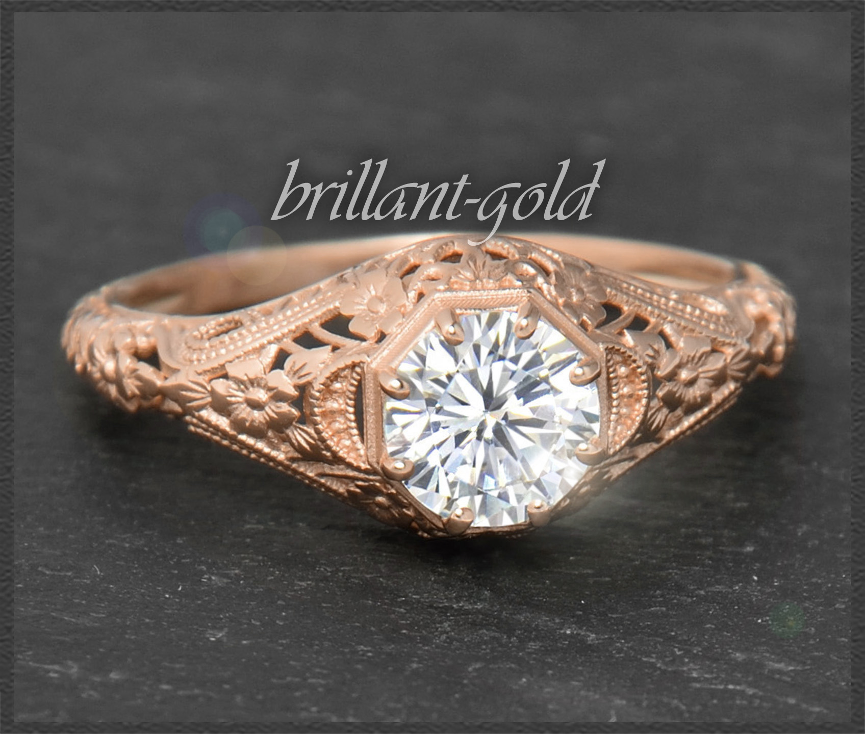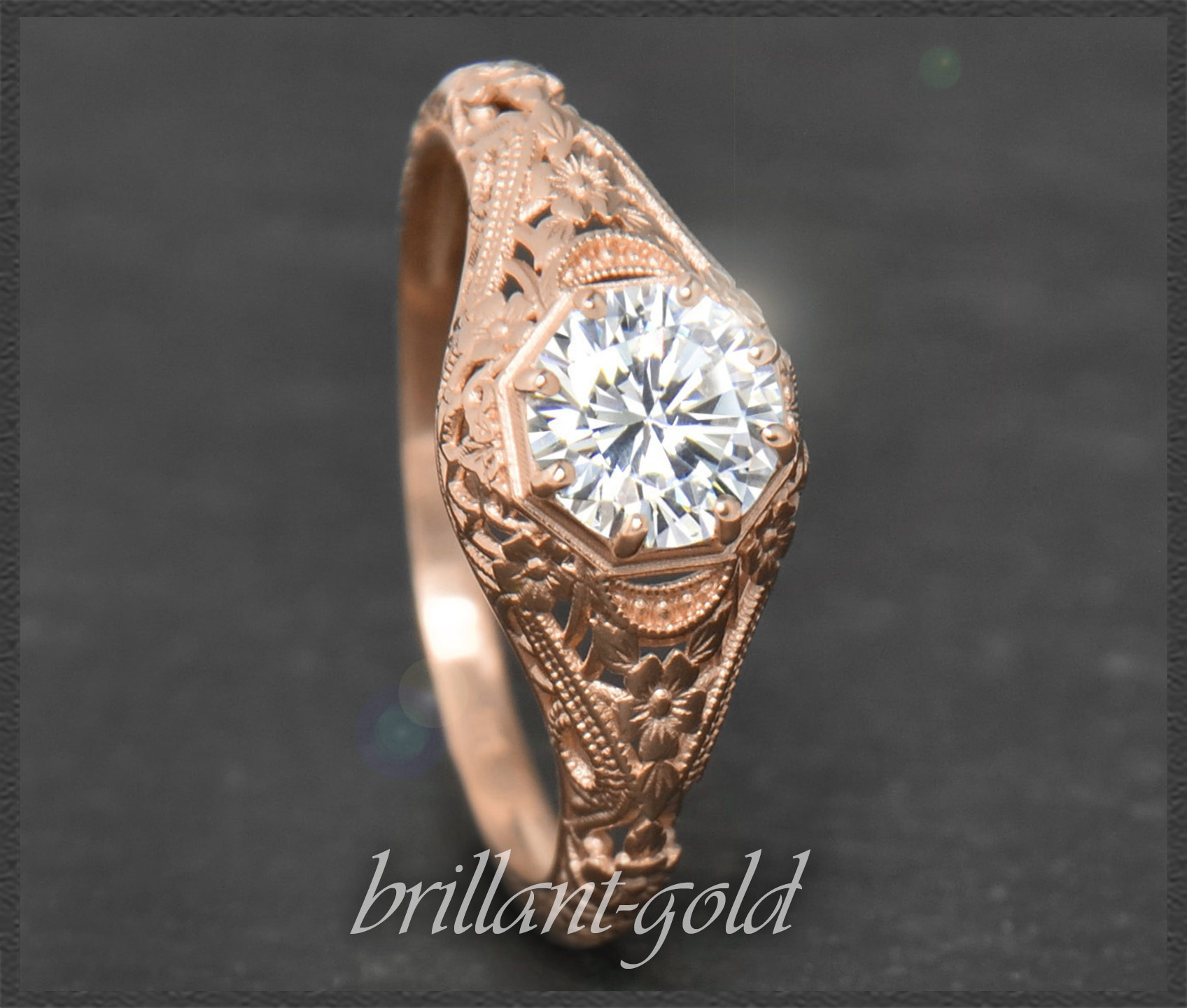 Designer Ring mit floralen Verzierungen, Blüten & Blättern, wie es in der Zeit des Jugendstil üblich war. Die Verzierungen sind filigran gearbeitet, der Brillantring sieht dadurch sehr elegant aus. Hergestellt aus 585 Rotgold, hochglanz-polierte Oberfläche.