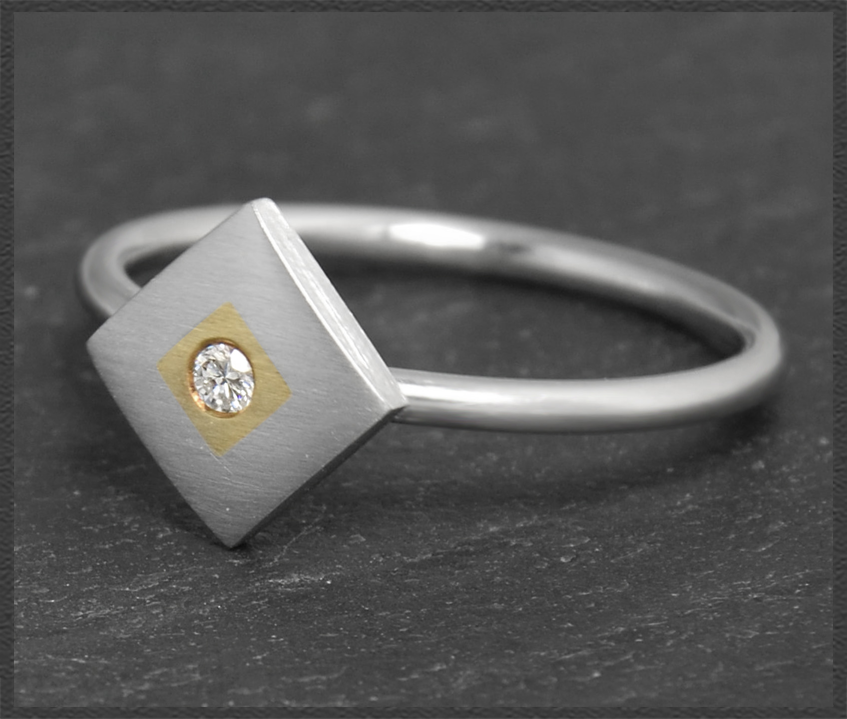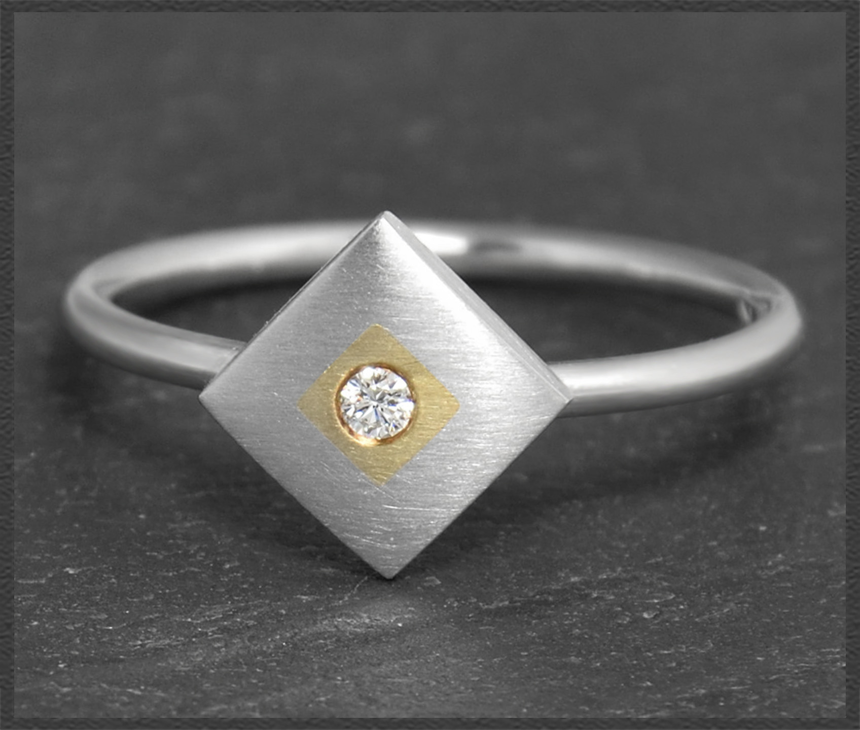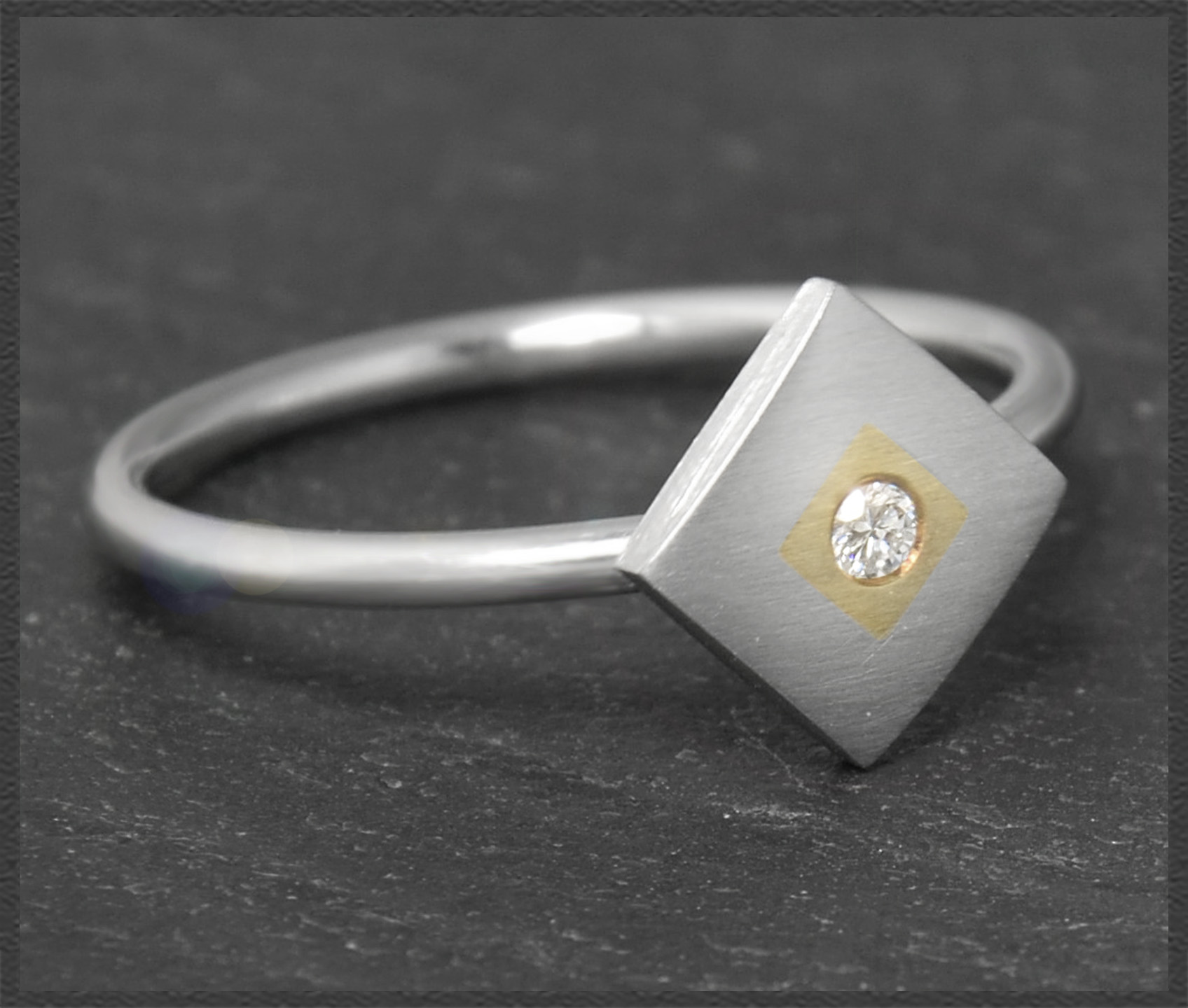 Designer-Schmuck aus Platin, dass sehr schwer zu verarbeiten ist, weil es extrem hart und robust ist. Zentral im Ring, gefasst in eine eingeschweißte Gelbgold Verzierung, ist ein hochwertiger Brillant im exzellenten Brillantschliff. Der Brillant funkelt wunderschön im Licht.