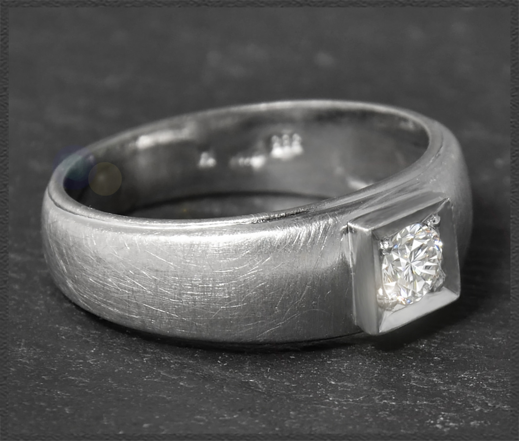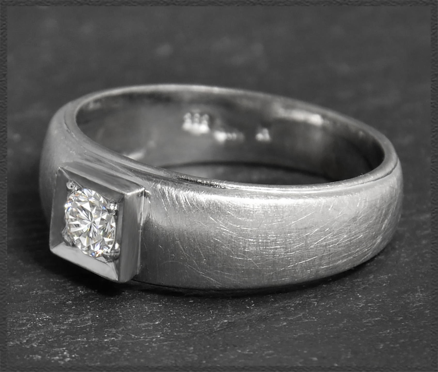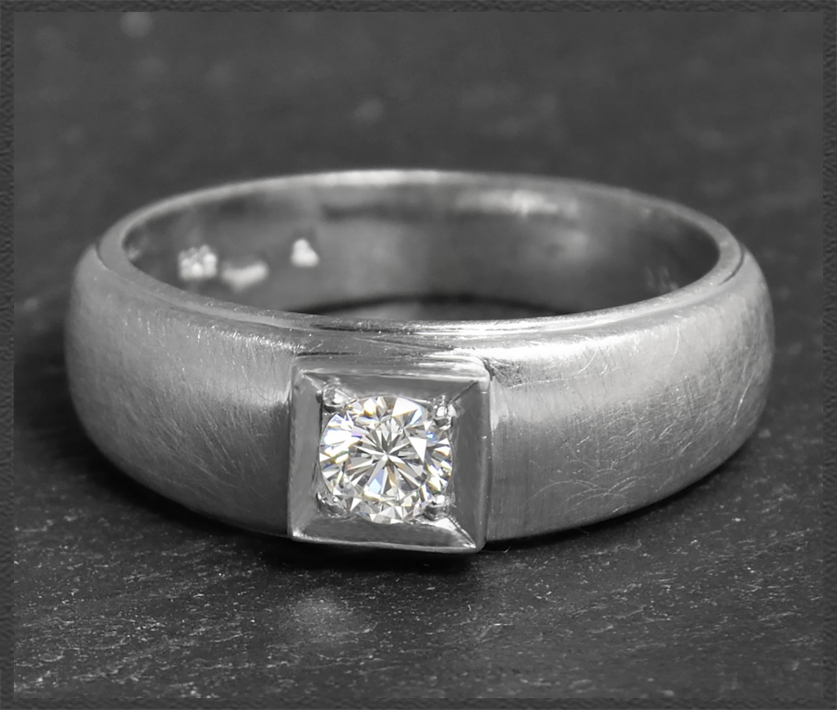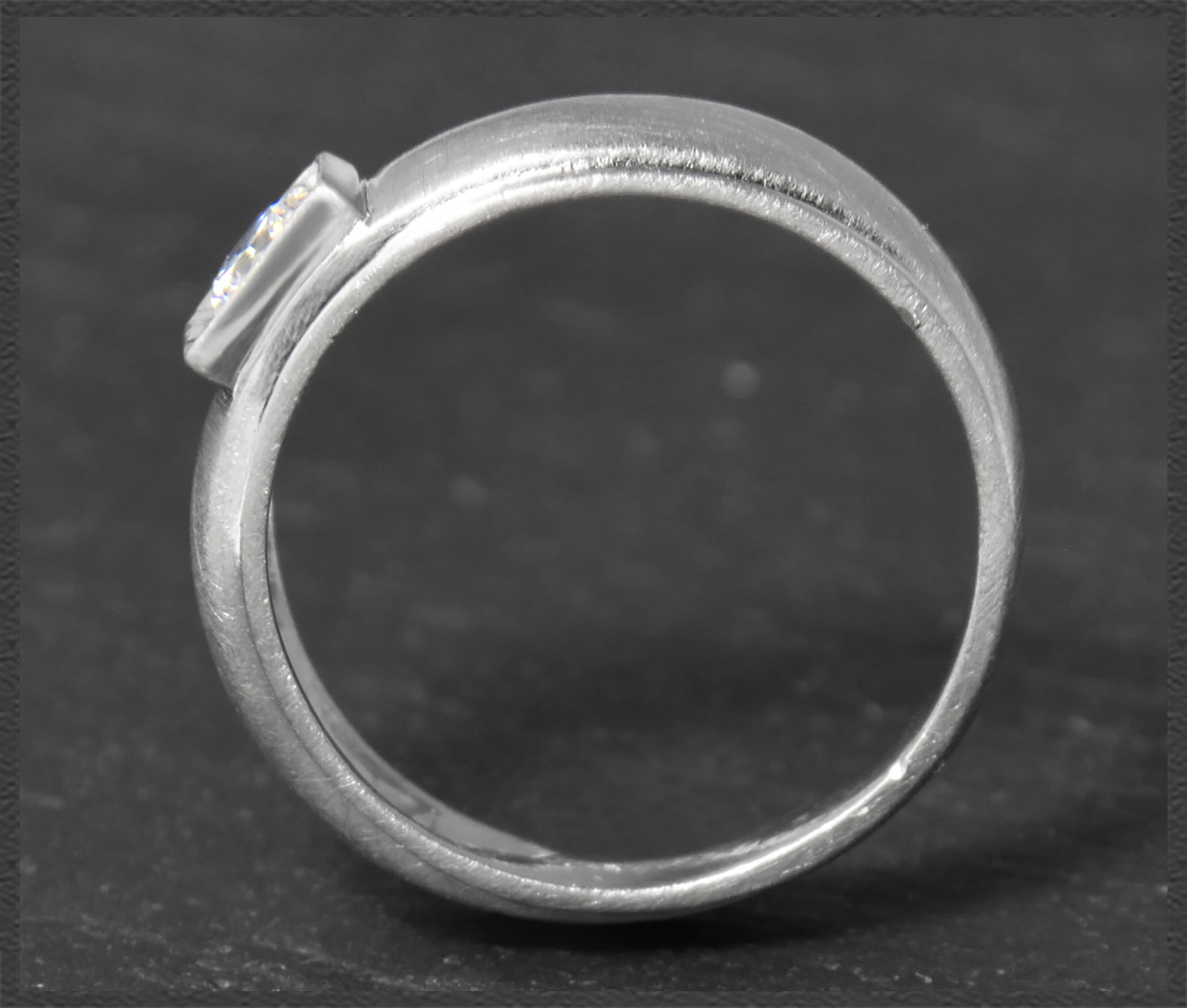Zentral im Bandring ist ein traumhaft schön funkelnder Brillant mit 0,24ct in einer quadratischen & hochglanzpolierten Fassung eingefasst.