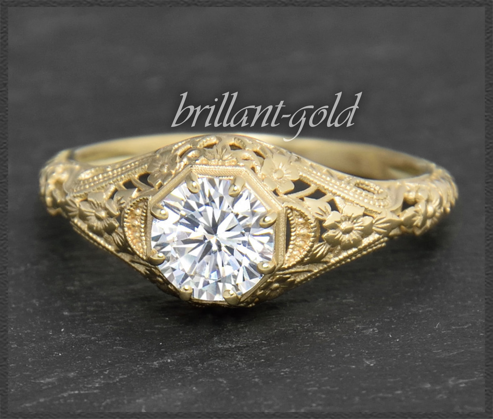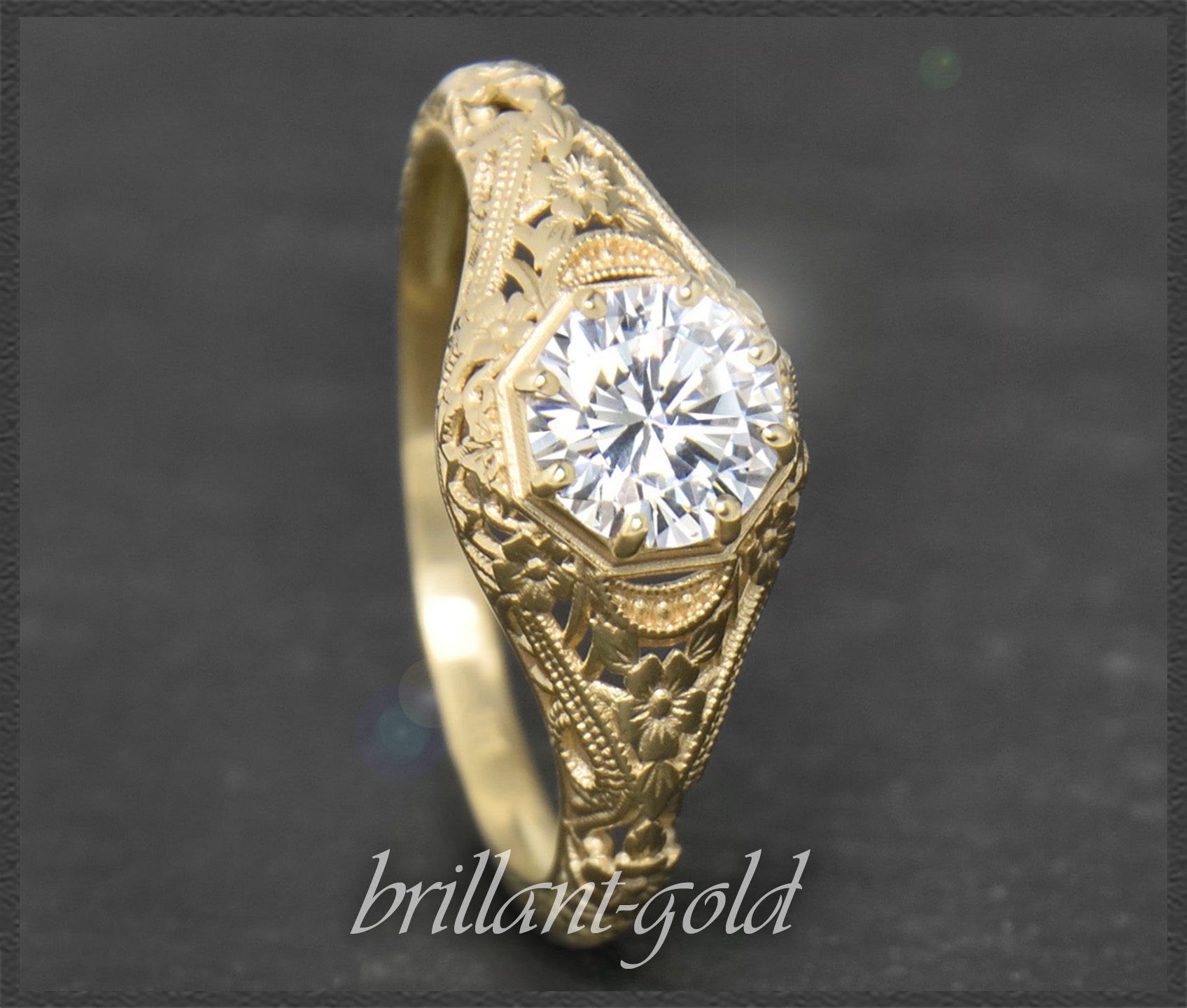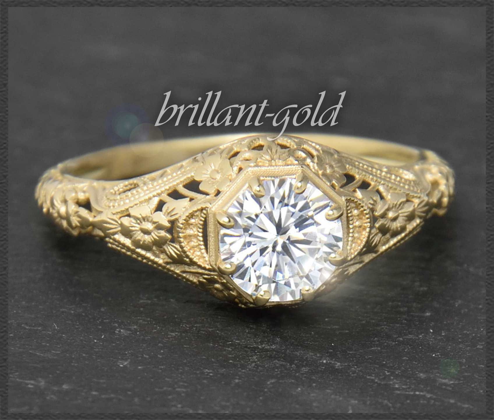Designer Ring mit floralen Verzierungen, Blüten & Blättern, wie es in der Zeit des Jugendstil üblich war. Die Verzierungen sind filigran gearbeitet, der Brillantring sieht dadurch sehr elegant aus. Hergestellt aus 585 Gelbgold, hochglanz-polierte Oberfläche.